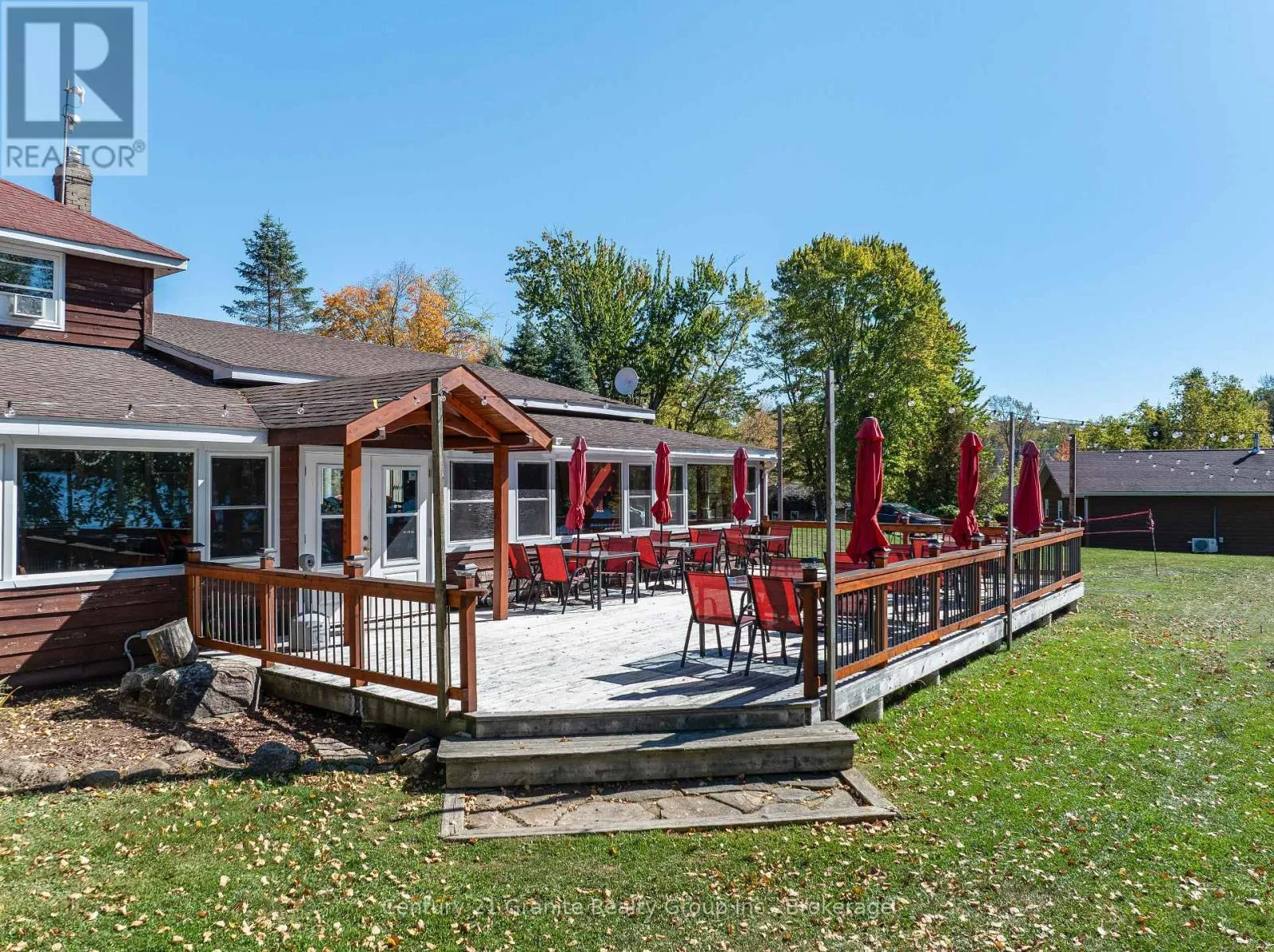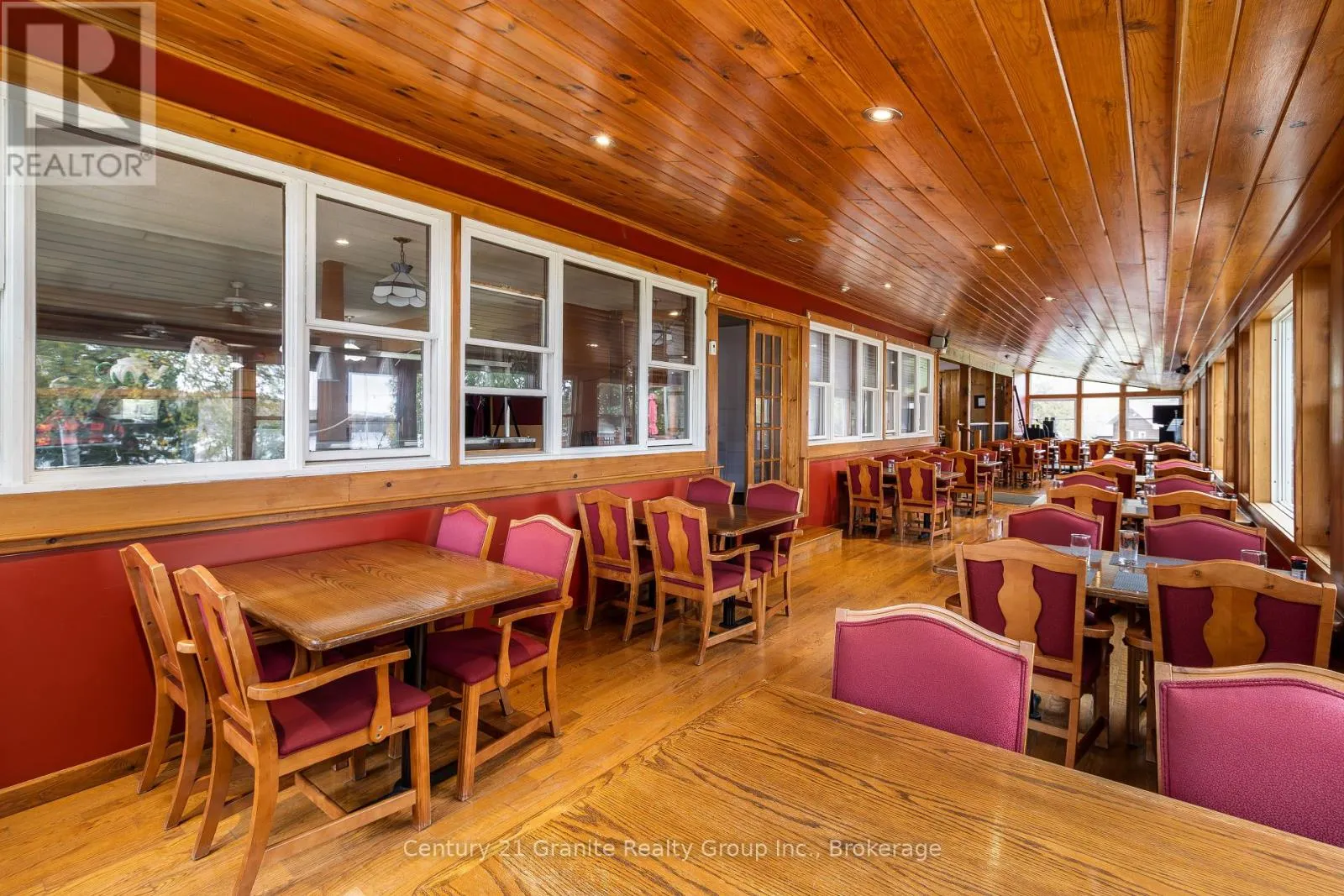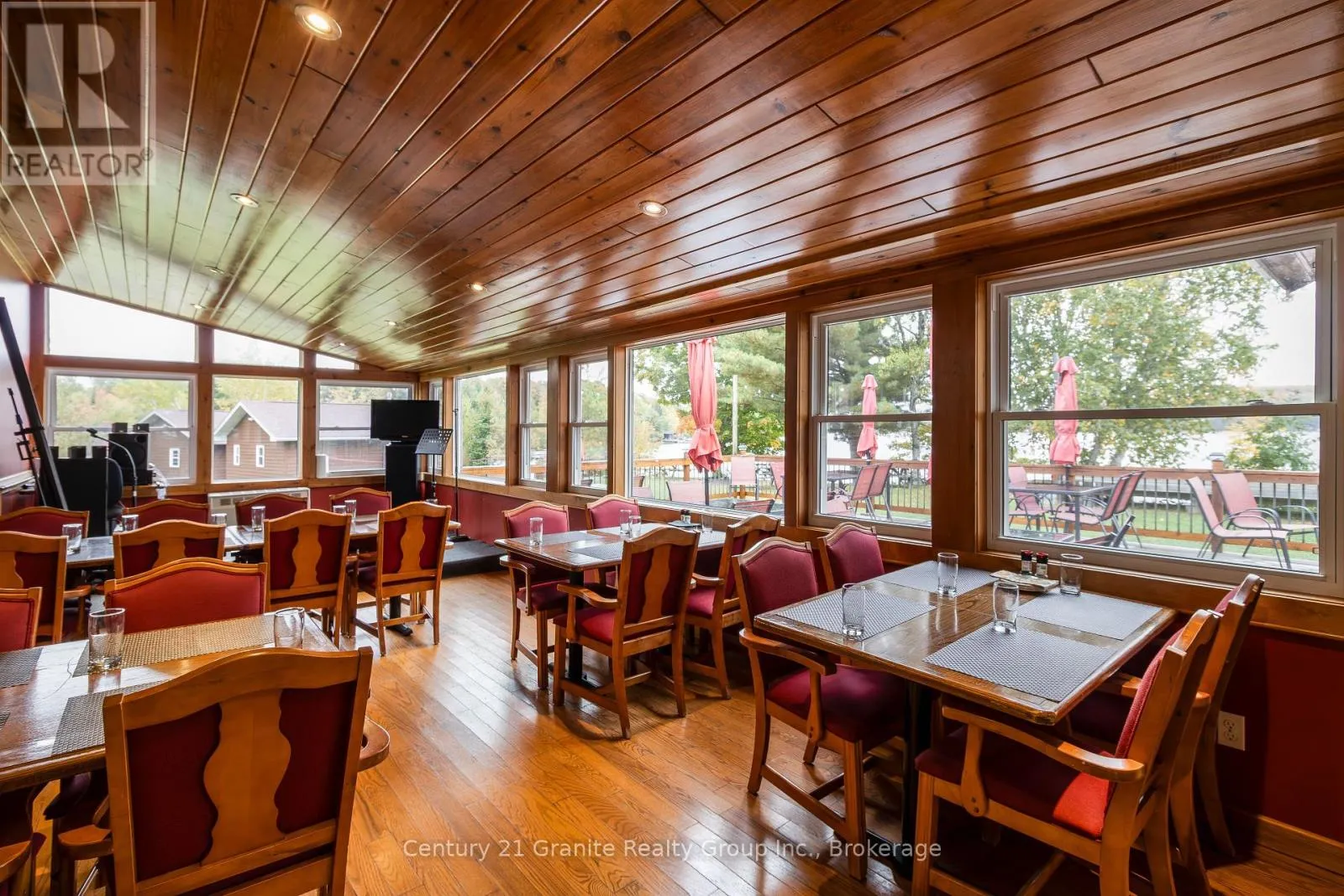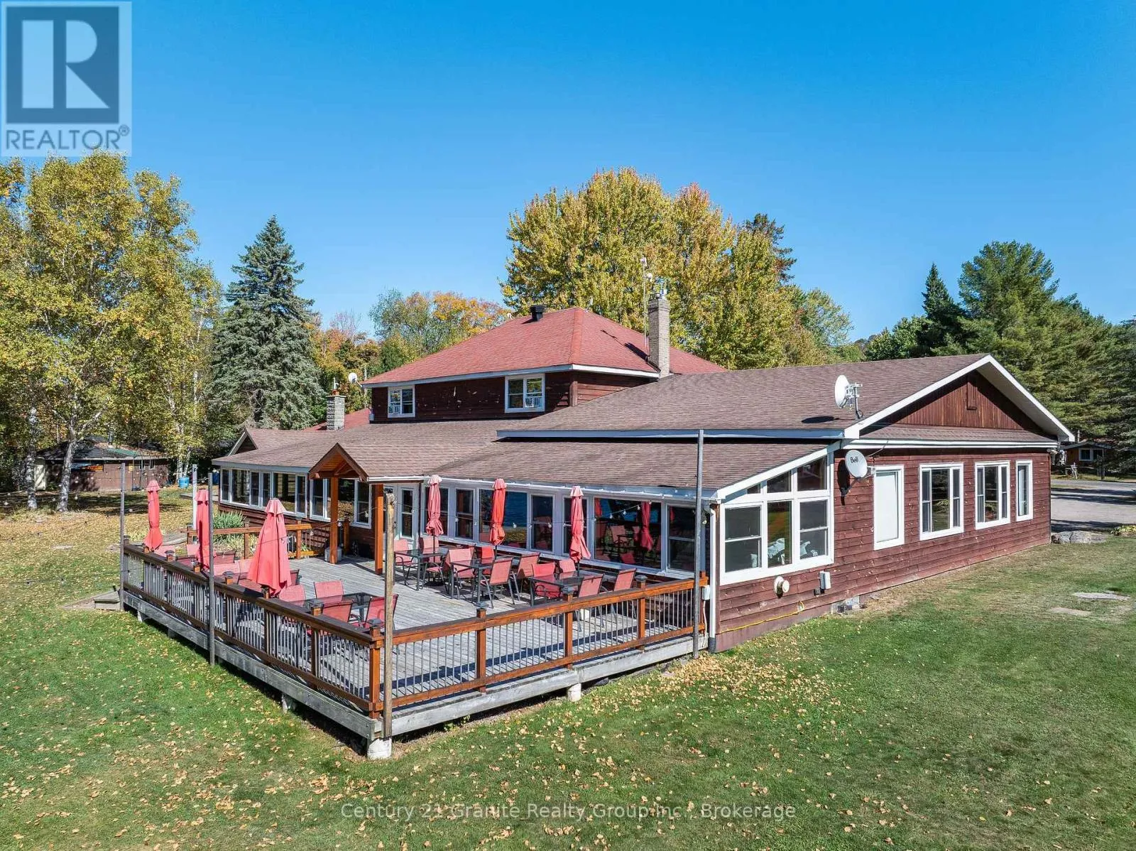 Cross Streets: Highway 35 and Red Umbrella Road. ** Directions: Highway 35 to Red Umbrella Road. Welcome to the Red Umbrella Inn, a cherished 4-season resort on Twelve Mile Lake, part of the sought-after 3-lake chain with Little and Big Boshkung. Sitting on 3.5 acres of level, pie-shaped land with stunning southern and western exposures, this property showcases unforgettable sunsets and a private sand beach tucked into a sheltered bay. A large multi-slip dock at the waters edge provides excellent access for boating, fishing, and enjoying all that this pristine lake chain offers. The Main Inn features a chefs kitchen, a BBQ area on the lakeside patio and on the kitchen deck, plus an inviting lounge with a full bar. The completely renovated dining room is complete with an open stage area to host performers and offers breathtaking lake views, with seating extending to the licensed lakeside patio and grounds, making it an ideal venue for weddings, retreats, and entertainment events. Accommodations are varied, providing flexibility for guests and future opportunities for growth: 5 comfortable rooms above the Inn, 4 lakeview motel-style units, 2 cozy cottages, 3 lakeside cottages (2 with efficiency layouts), 4 additional efficiency suites & a renovated owners quarters within the Inn. Since 1929, the Red Umbrella Inn has been known for clean, comfortable stays, delicious dining, and exemplary service. This is a rare opportunity to own a piece of Haliburton Highlands history perfect for those seeking a lifestyle change, a thriving business investment, or the potential for a private family compound. An additional adjacent lot across the road is included, currently used for parking but offering excellent highway frontage on Hwy 35. All just minutes north of Minden, in the heart of cottage country and year-round tourist activity. (id:27476)