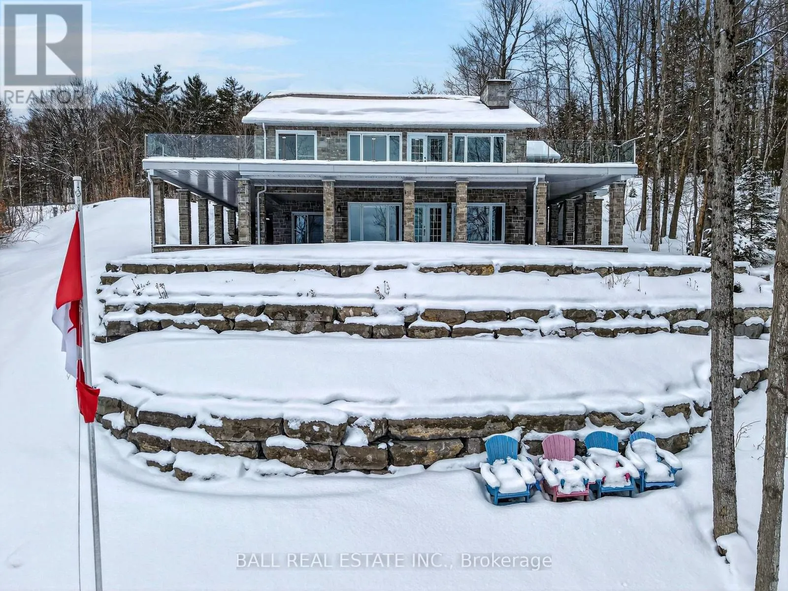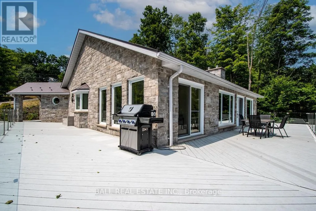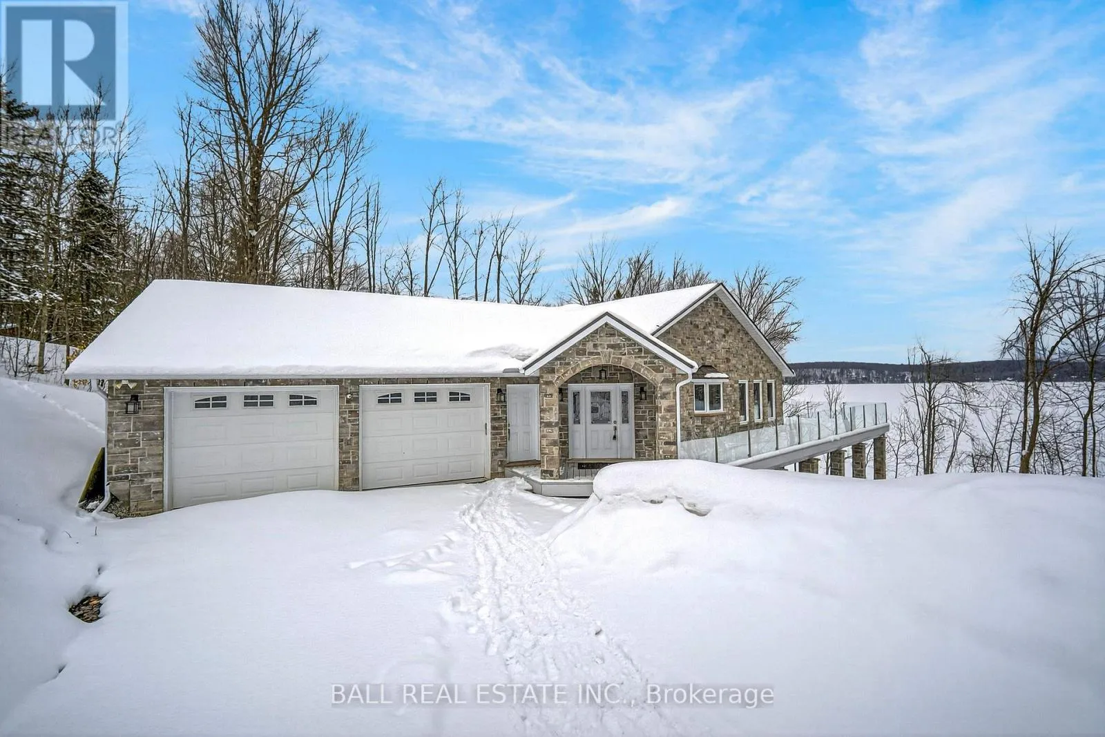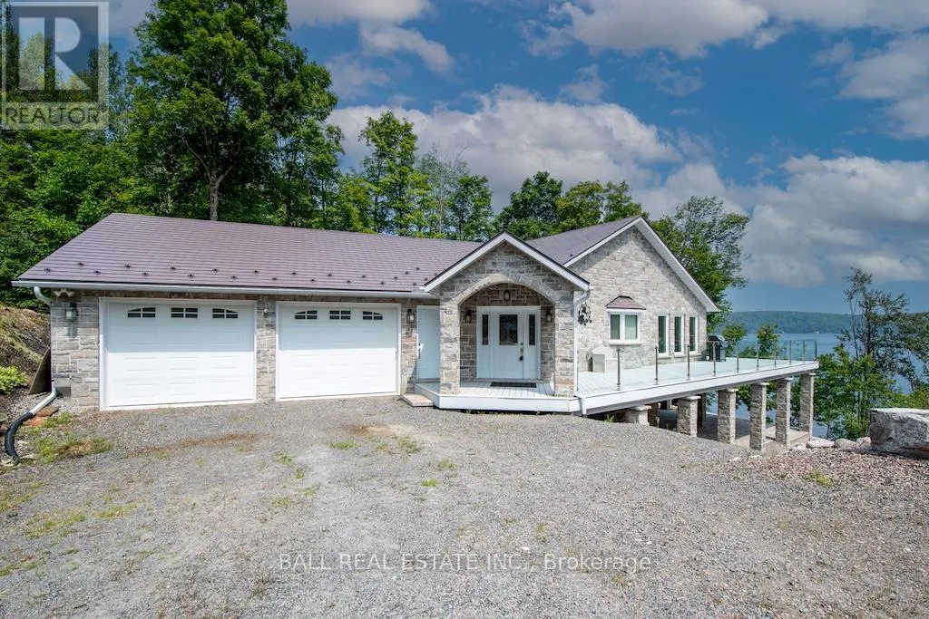 Cross Streets: North on Highway 35 to Minden. ** Directions: North on Highway 35 to Minden, just north of Minden. Welcome to 13540 Highway 35 in Minden, an exceptional newly built waterfront home set on 0.63 of an acre with coveted east exposure, offering breathtaking views of Mountain Lake-perfect for boating and waterfront enjoyment on a two-lake chain. This impressive custom-built 4-bedroom, 2-bath home offers over 3,000 sq. ft. of beautifully finished living space, perfectly designed for year-round enjoyment. Step inside to a bright, open-concept main floor featuring a stunning kitchen with granite countertops, custom cabinetry, and a large breakfast bar-perfect for entertaining. Dining area with floor to ceiling cabinets for extra storage. The spacious living room, complete with a fireplace, walks out to a spectacular lake-facing wraparound composite deck with sleek glass railings and in-deck lighting, offering breathtaking panoramic views and unforgettable sunrises. A spacious primary suite and second bedroom also feature walkouts to the deck, creating seamless indoor-outdoor living. Large 4pc bathroom with soaker tub, main floor laundry and entry to the oversized double car garage. The fully finished lower level offers incredible additional living space with a cozy, efficient wood-burning fireplace, two generous bedrooms, 5pc bathroom and multiple walkouts to a beautifully designed interlock patio. The meticulously landscaped, tiered lot showcases gabion stone walls, perennial gardens, walkways, a firepit area, and excellent shoreline access for enjoying the lake. Additional features include durable stone exterior, metal tile roof, in-floor heating throughout, a high-efficiency forced air furnace and central air conditioning. An oversized double-car garage with ample storage and private basement access adds to the home's functionality. Conveniently located just minutes from Minden, you'll enjoy easy access to dining, shopping, groceries, medical services, and more. A rare opportunity to own a stunning waterfront property where lasting family memories are made. (id:27476)