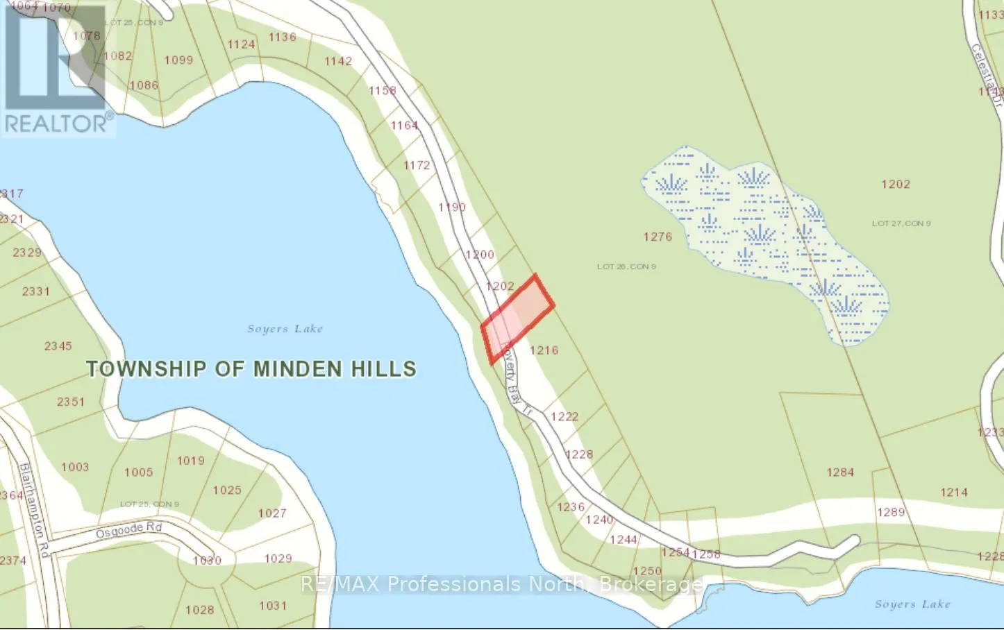 Cross Streets: From County Rd 21, turn onto Blairhampton Rd, turn right onto Alexander Rd and then right onto Poverty Bay Trail. SOP and in between property numbers 1202 and 1216 with pink tape marking the approximate sides. ** Directions: Blairhampton Rd to Alexander Rd, Poverty Bay Trail. Rare waterfront opportunity to build your dream cottage or home on prestigious Soyers Lake - part of the 5-lake chain. A beautifully well treed, just under half an acre lakefront lot with 100 ft frontage. See drawing of potential build site location & building size envelope (for on the lake side) with a gentle/gradual sloping entry to the waters edge. Hydro available at the lot line and located on a quiet year round private road that is very well maintained for easy access. There is a cleared area on the back half of the lot perfect for parking, storage or a garage space. South west facing for afternoon sun all day and gorgeous sunsets. Enjoy everything waterfront living has to offer; swimming, paddling, ice fishing, fishing, snowmobiling, & boating! A boater's paradise with access to Haliburton's 5-lake chain for water sport activities, boat to restaurants or right into the Haliburton Village with ease. Conveniently located in between Haliburton and Minden for all amenities. Close to golf, skiing, restaurants, trails, shopping, hospital and schools. This property offers peaceful seclusion without sacrificing convenience. Escape to the beauty of Soyers Lake and experience this special waterfront property for yourself. (id:27476)