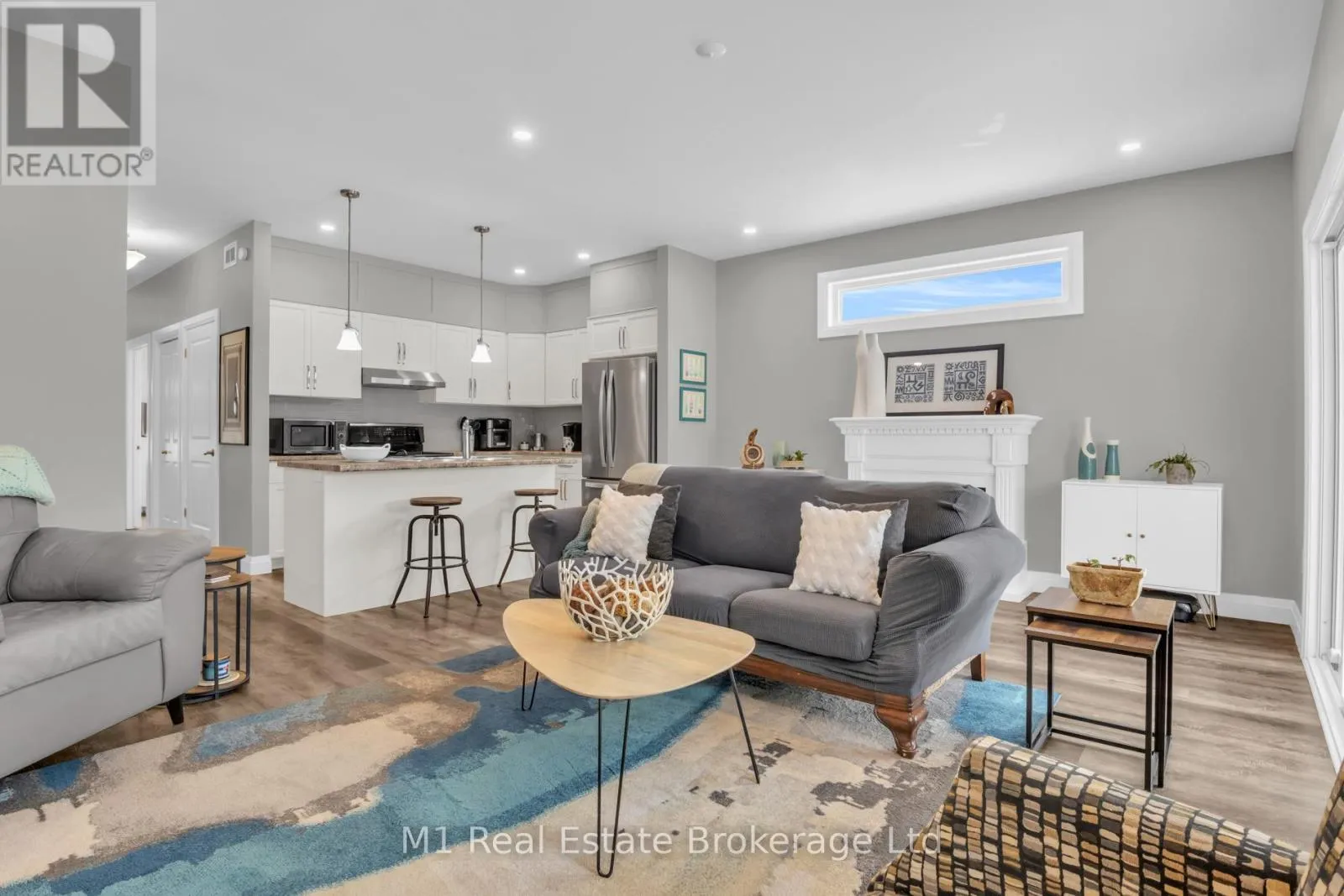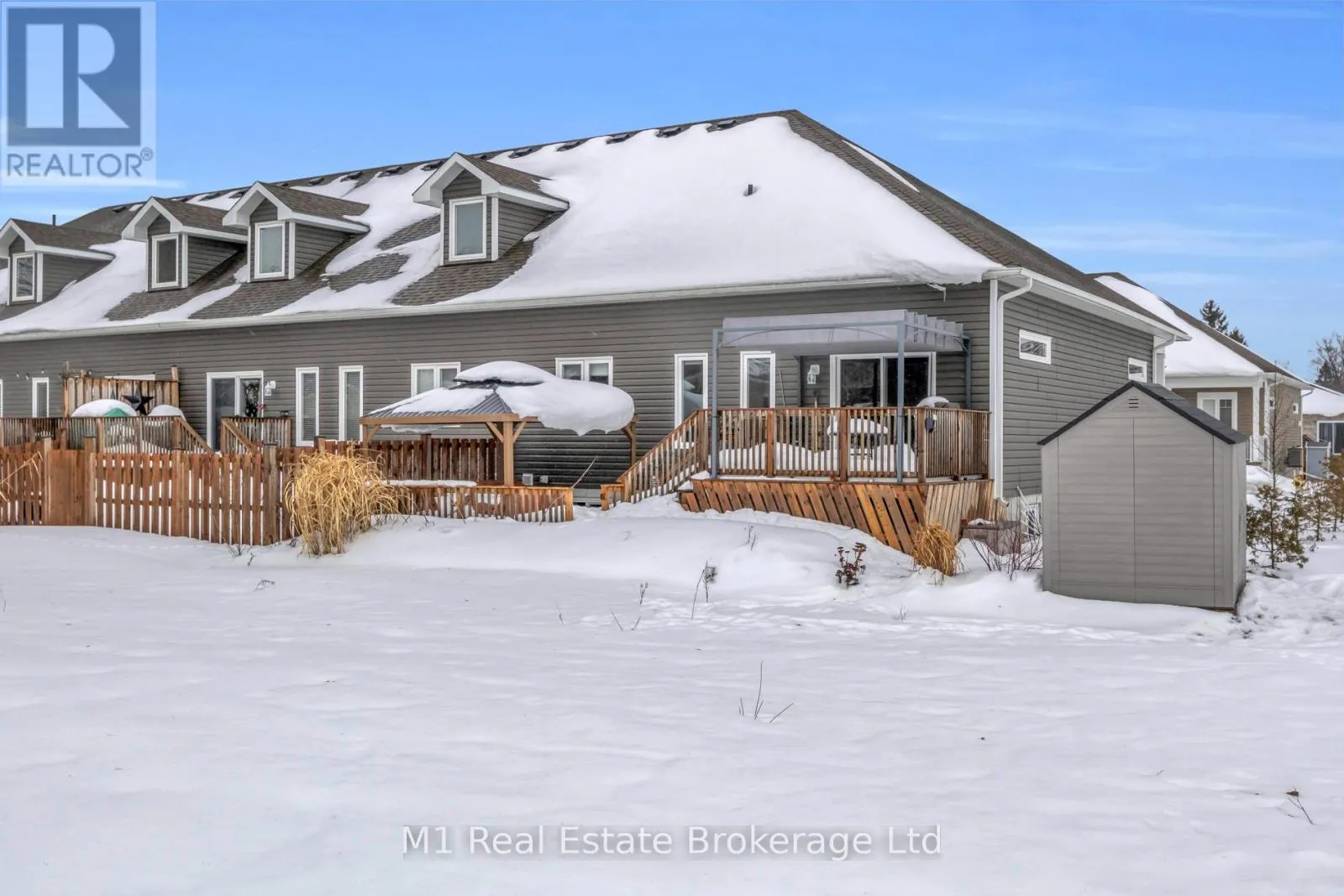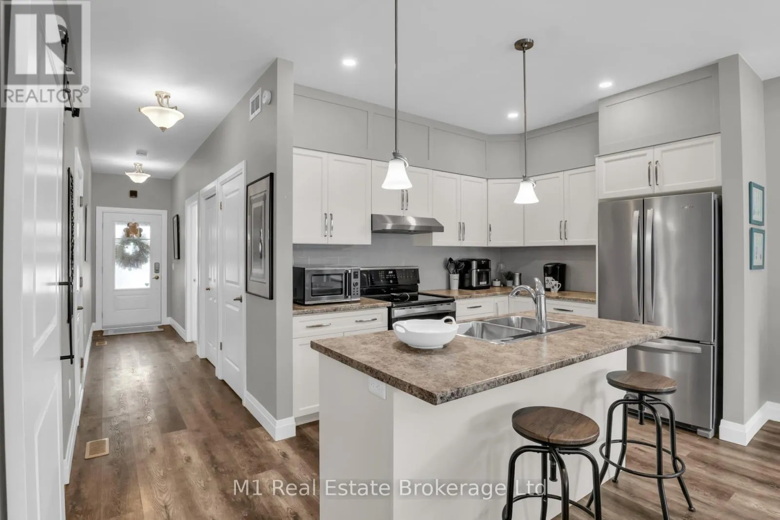 Cross Streets: Arthur St. E. ** Directions: Turn North onto George St. N. from Arthur St. E. Welcome to 24 George Street Unit 23 in Harriston, built in 2021 by Quality Homes and offering over 1,650 sq/ft of finished living space in a rare end-unit position at the very end of a quiet dead-end street with no neighbours on one side and additional yard and garden space to enjoy. This move-in-ready bungalow features quality finishes, luxury vinyl plank flooring, and upgraded lighting throughout the bright open-concept kitchen and living area. The kitchen offers a functional island with breakfast seating, stainless steel appliances, and ample storage, with convenient main floor laundry nearby. The main level includes two bedrooms and a full bathroom, while the professionally finished basement expands the home with a third bedroom, second full bathroom, spacious rec room, bonus office space, and restored vintage doors that add warmth and character to the lower level. Step outside to a large two-tier deck providing excellent outdoor living space and added privacy thanks to the end-unit setting. Located within walking distance to town, shopping, schools, and amenities, and within commuting distance to Guelph and the Tri-Cities, this home offers low-maintenance living with upgraded finishes, flexible space, and a layout that suits a variety of lifestyles. (id:27476)