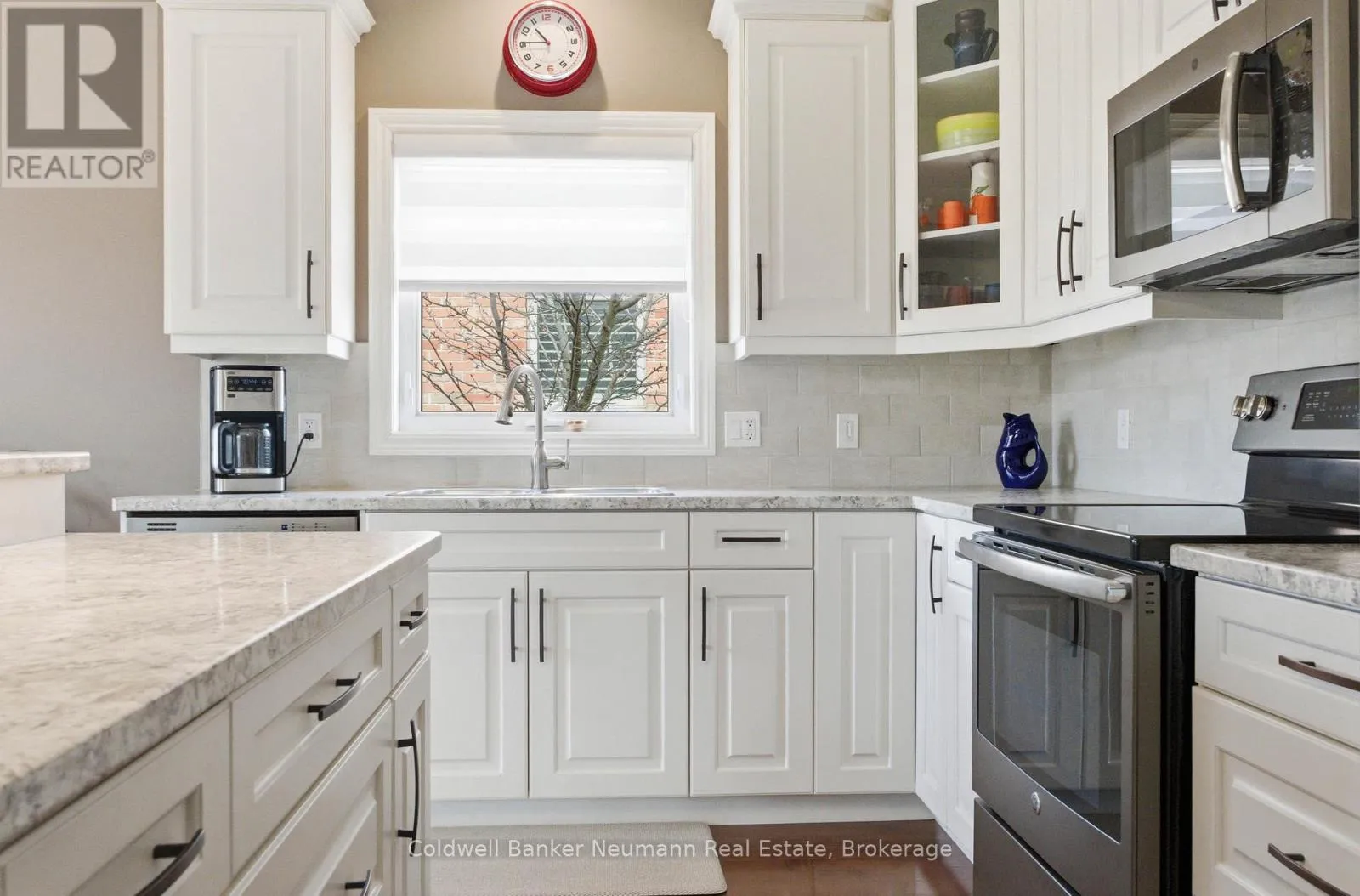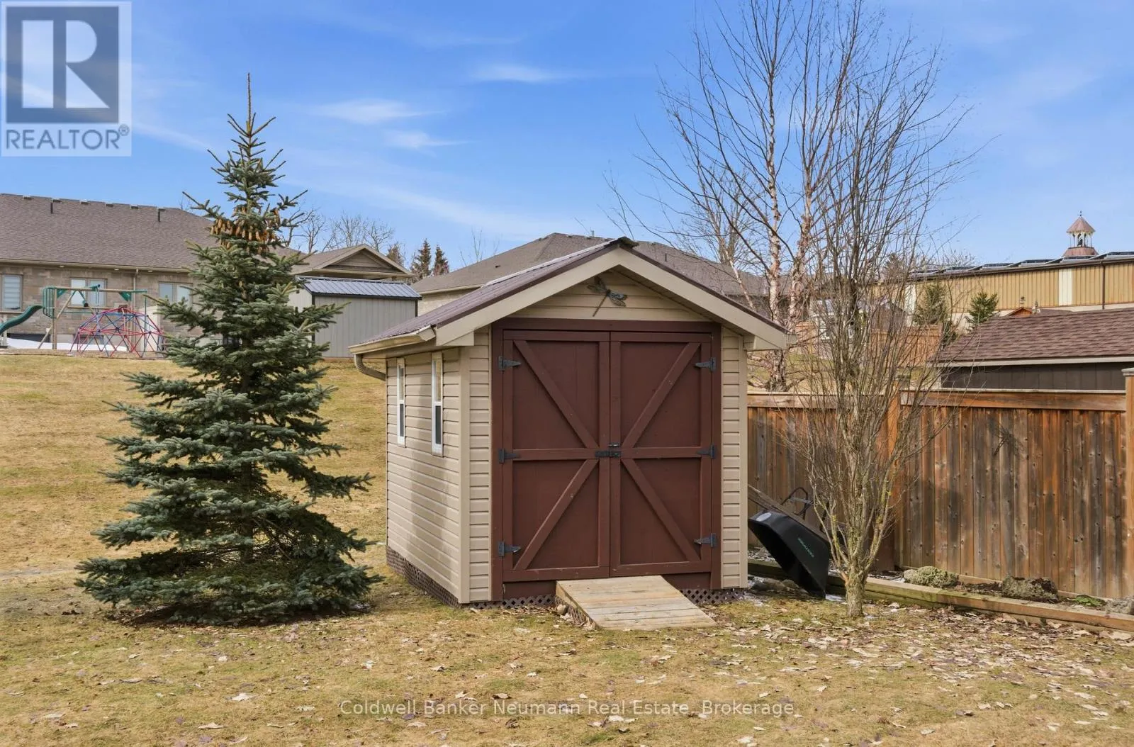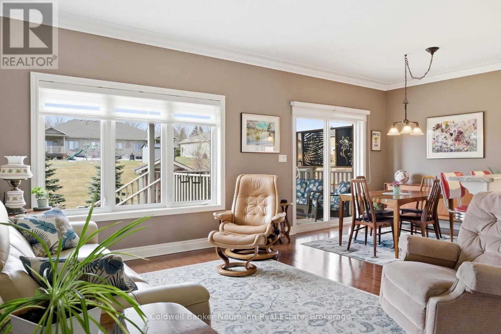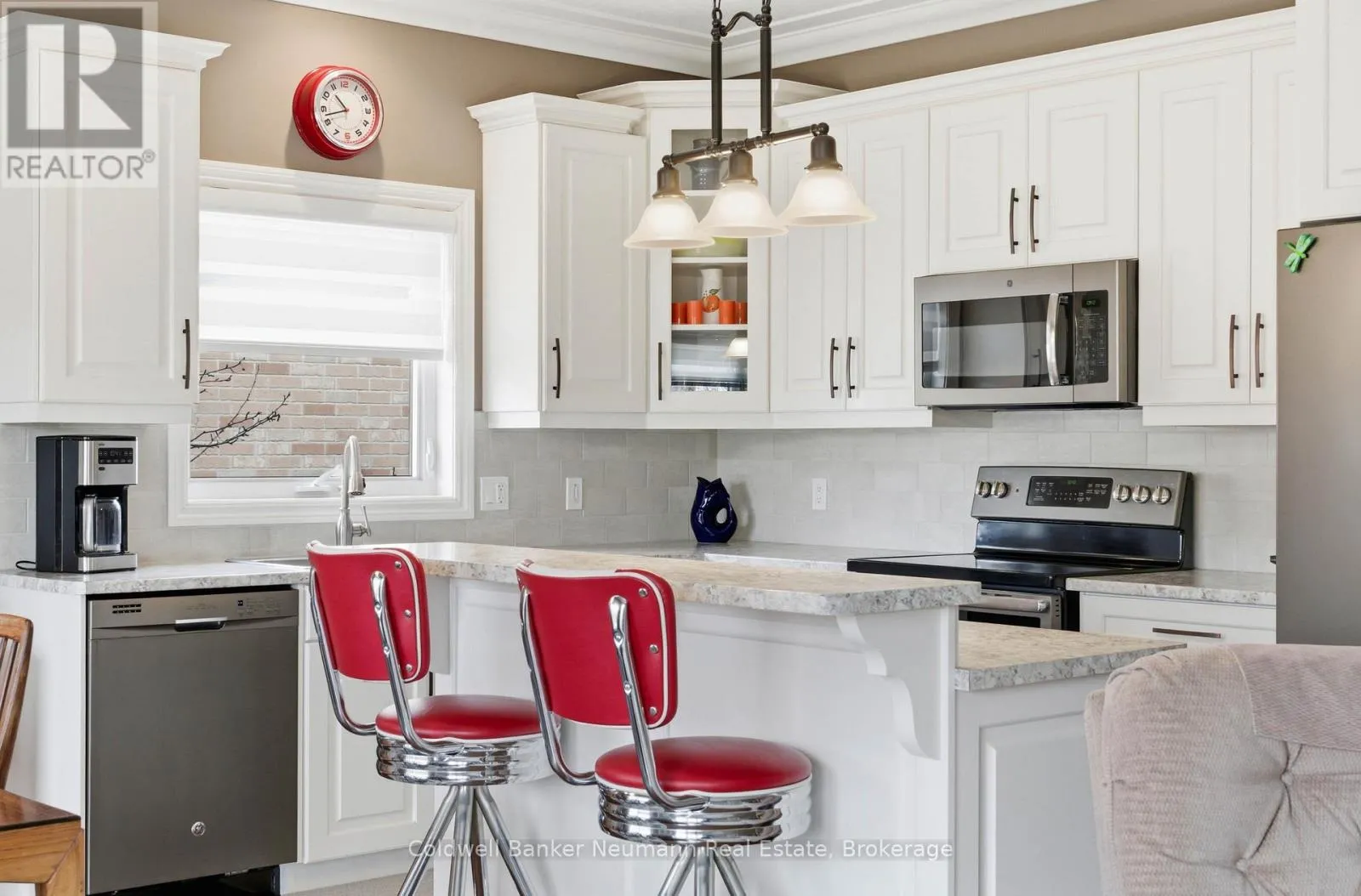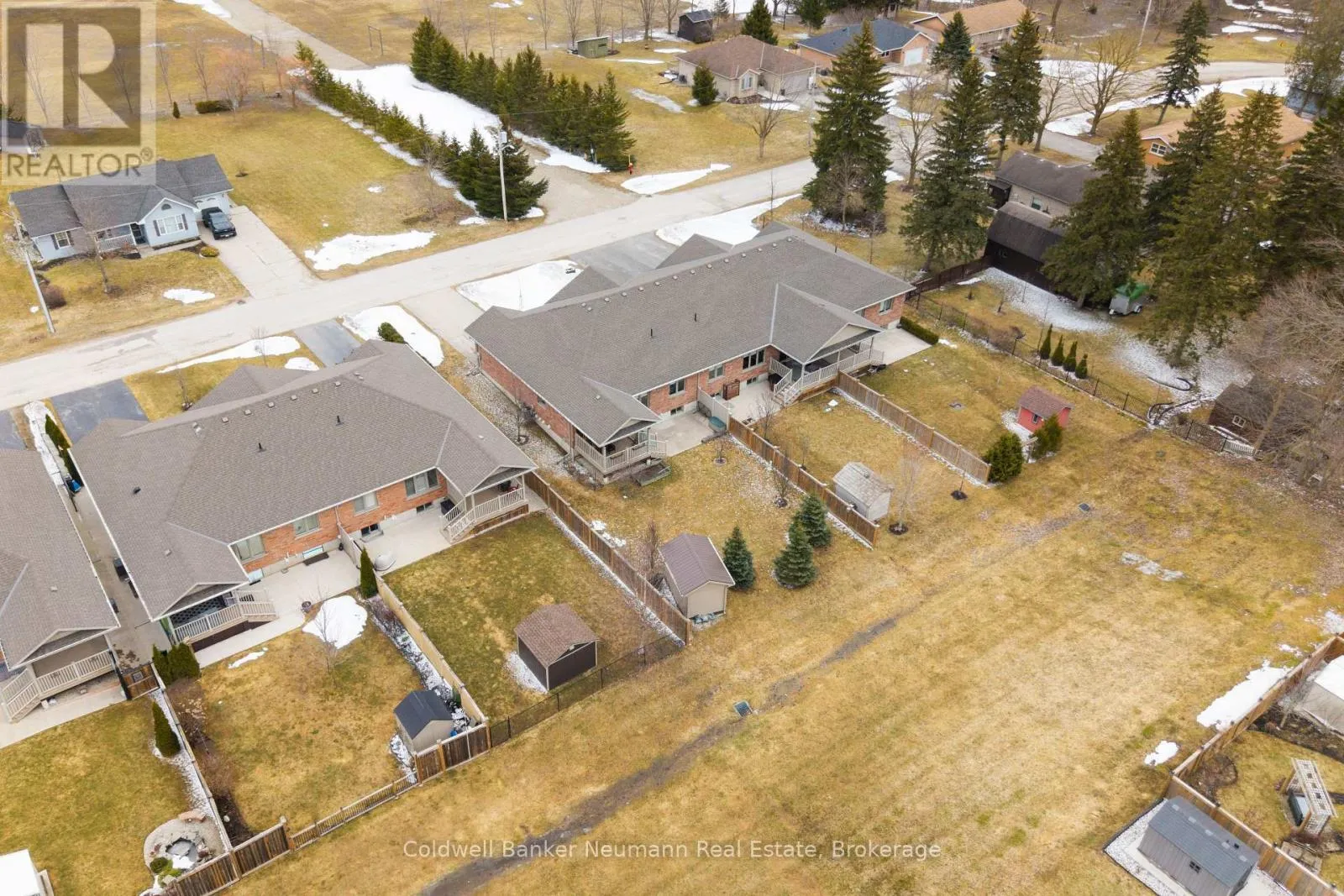 Cross Streets: Nelson Street E/Allan Street E. ** Directions: Into Clifford on Arthur-Kincardine Rd/9, north on Nelson Street E. (turns into Brown Street S.), property on left. Welcome to this beautifully maintained, freehold 2+1 BR end-unit bungalow townhome, situated on a quiet street in the heart of Clifford. With the convenience of open concept, main floor living, this home offers style and functional coziness all at once. Immediately evident are high quality details like 9' ceilings and crown moulding, as well as a carpet free main floor. The bright kitchen features plenty of cabinetry, a working island w/bar seating, stylish bronze hardware & soft, muted subway tile backsplash. There is a convenient nearby pantry, & laundry closet with stackable machines. The adjacent dining area is spacious to host family dinners, open to the living room, while also leading out through sliding doors to the covered, spacious, composite rear deck. The landscaping has beautifully evolved over the years, with perennial bushes and trees, including pyramidal oaks, service berry and flowering pear tree, while also incorporating privacy features and a handy 8x12 garden shed. Plus, the lower patio area features a gas line for BBQing. Back inside, there are 2 main floor BRs, with the primary featuring a spacious 3pc ensuite, as well as a main floor 4pc bath. The basement is completely finished, w/large rec room, bedroom w/walk-in closet, 3pc bath, and abundant storage in the utility room. There is an oversized 1-car garage and parking for 2 in the driveway. Clifford is a charming and growing small-town community, all while being strategically positioned within reach of several key urban centres, making commuting or day trips both simple and efficient. Enjoy being near larger towns like Hanover, Listowel & Mount Forest, approx. 60 mins to Lake Huron/Bruce Power, KW & Guelph, and approx. 2 hrs to Toronto/the GTA, and the year round recreation offered around Georgian Bay. Whether you're downsizing or seeking a quiet lifestyle within reach of major centres, this home delivers exceptional value in a location that balances connectivity with country charm. (id:27476)