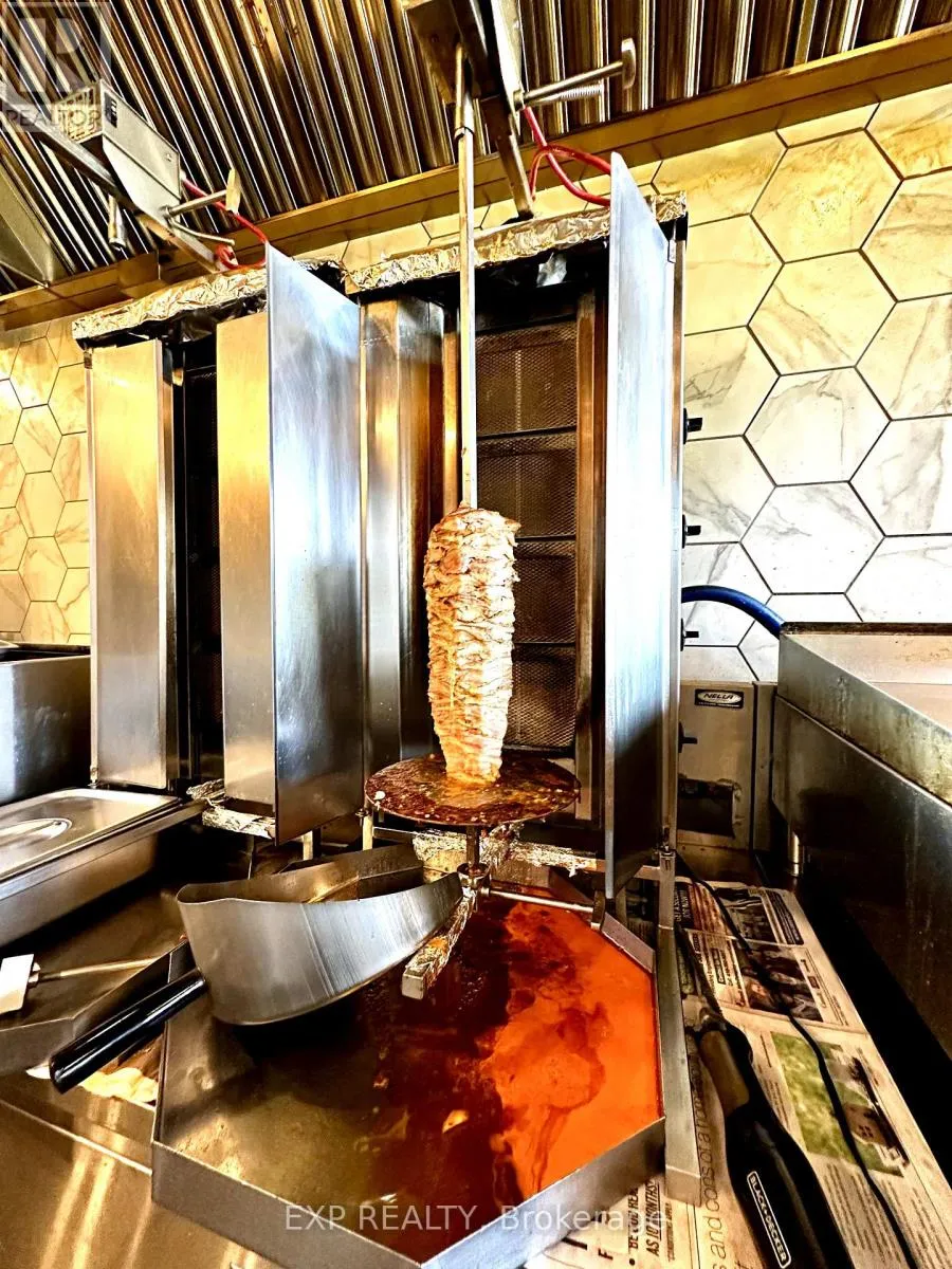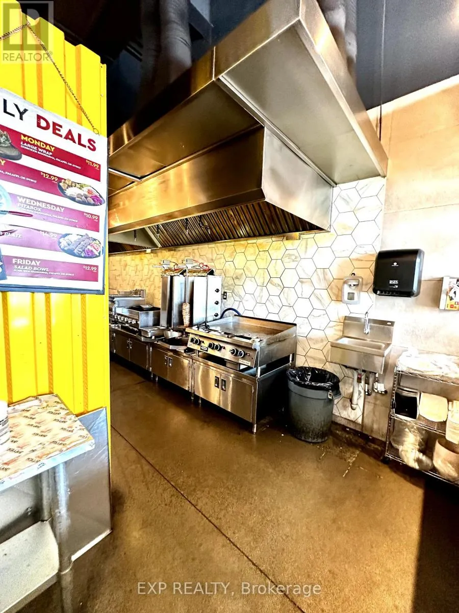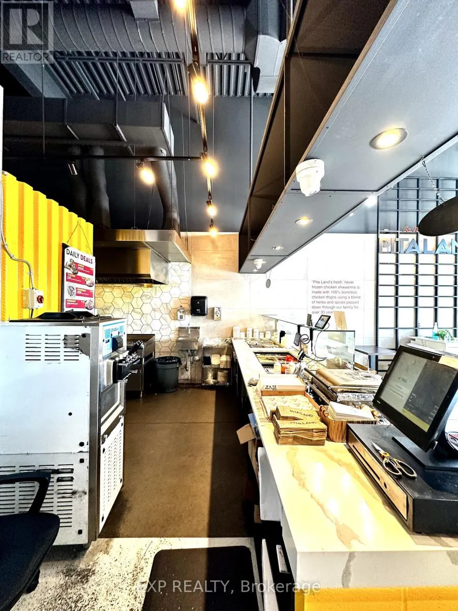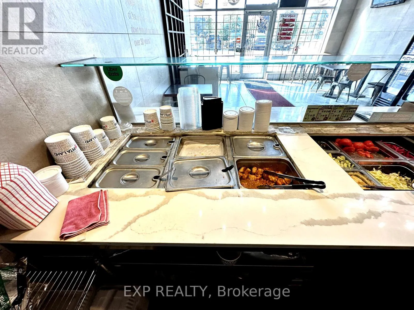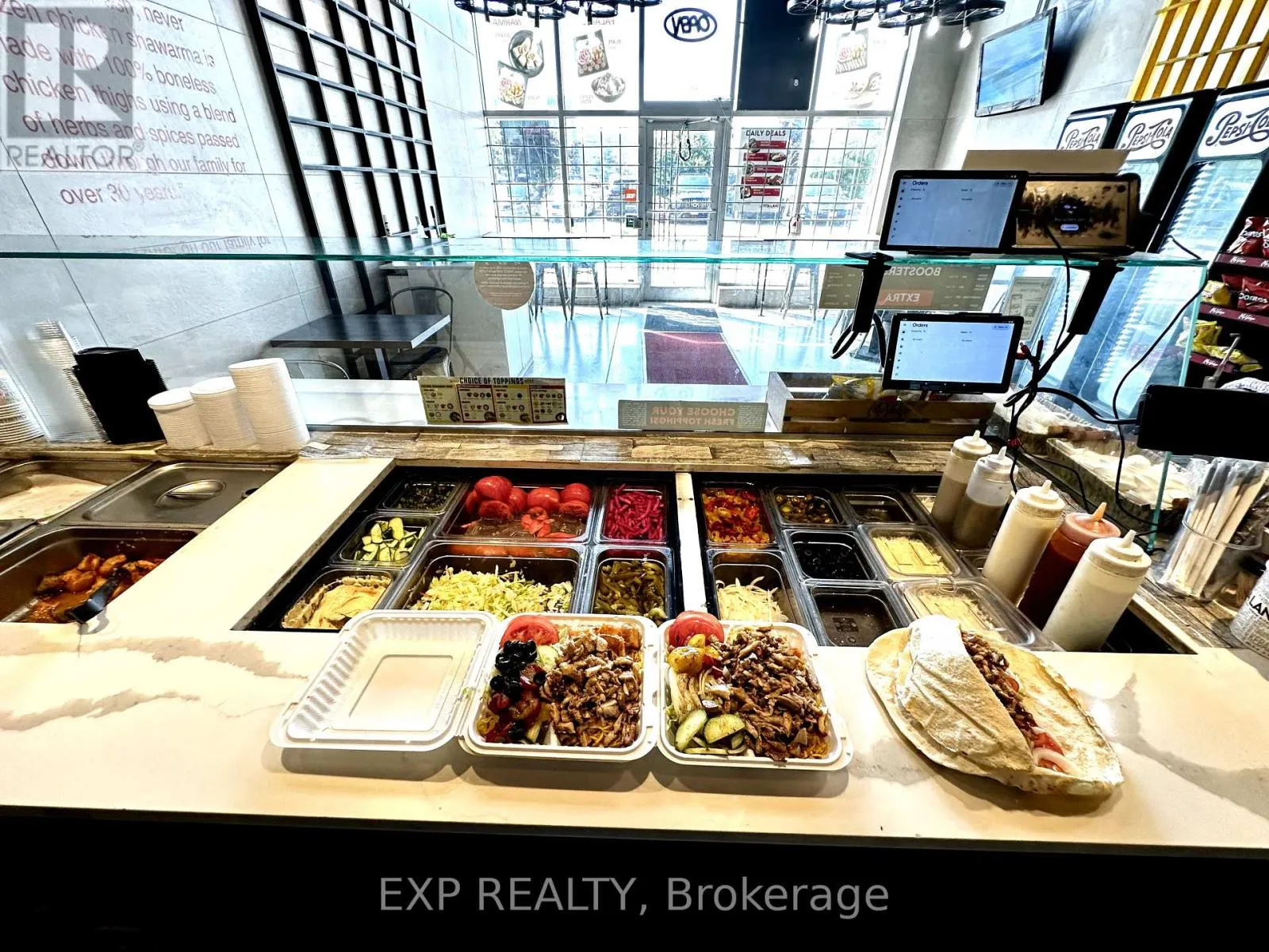 Hurontario St / World Drive Fantastic Pita Land Franchise For Sale in Prime Mississauga Location! Turnkey opportunity to own a fully equipped Pita Land restaurant located at 70 World Dr, just off 401 & Hurontario St in the heart of Mississauga's thriving commercial and industrial corridor. This strategically positioned plaza location offers exceptional exposure, surrounded by high-density office condos, busy industrial hubs, and a strong residential population. Ideal for lunch rush and dinner traffic, this unit is also perfectly situated for meal prep and delivery services like tiffin or catering especially with Amazon's massive fulfillment center nearby. The current setup features a state-of-the-art commercial kitchen with 24 feet of double hood ventilation, ideal for high-volume cooking operations. All equipment and leasehold improvements are in pristine condition. The existing Pita Land franchise is performing well with solid monthly sales and potential for rapid growth under active ownership. Rent is affordable at approx. $6,400/month (TMI included). Long lease available. This is an excellent opportunity for owner-operators or food entrepreneurs looking for a central Mississauga location with built-in clientele and room to scale. (id:27476)