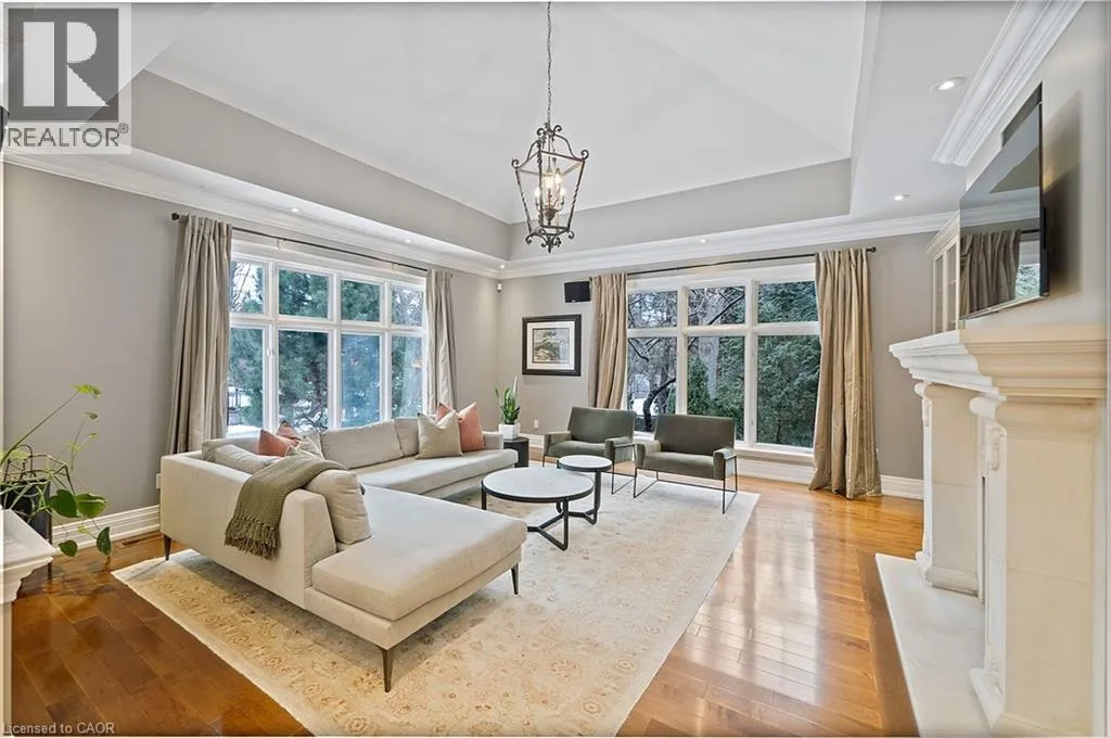 Lakeshore Rd to Meadow Wood South of Bob-O-Link, Mississauga Spectacular home designed by David Small and built by Venchiarutti Builders. This home is steps from Lake Ontario, Rattray Marsh walking trails, Meadow Wood Tennis Club and Meadow Wood Lakefront Park Mississauga. Uniquely designed inclusive of optimal areas for family living and entertaining. Should you require a main floor primary bedroom for a family or guests with ensuite, sitting room and walkout to private deck you have found home. If desired, this space can be transformed into a Formal Dining Room and Living Room. The Gourmet kitchen features quartz counters, oversized centre island, appliances feature a gas Wolf cooktop, Miele Dishwasher, KitchenAid refrigerator & ovens, built-in bar fridge and wall to wall glass windows inclusive of walkout to yard. Stunning open concept family room with built-ins, wood burning fireplace and picture views of mature setting. Private yet welcoming main floor study/office with built-ins to suit all ones needs. Upper level of residence is most impressive with high ceilings, secluded main primary bedroom along with oversized ensuite. Picture windows throughout the entire upper level share views of the rising sun, sunsets and when they are open the simmering sound of the waves touching the shore. Lower level welcomes the activity area of lower family room with gas fireplace, gym area with glass for loads of light, wet bar and a separate nanny's suite. One may consider this entire level for a family member or simply a house guest to enjoy. Attention to detail is evident throughout from the impeccably maintained interior to breathtaking private treed backyard oasis inclusive of pool, waterfall, hot tub, pergola, shed, covered outdoor kitchen area and underground irrigation system Once in a lifetime opportunity to purchase and enjoy this special home. (id:27476)