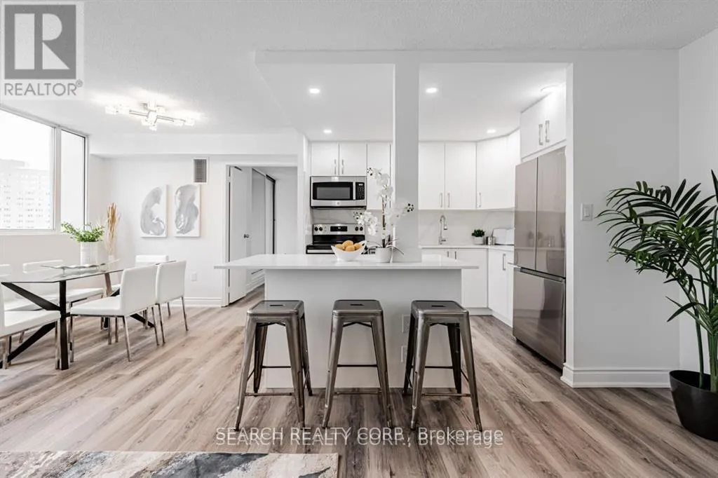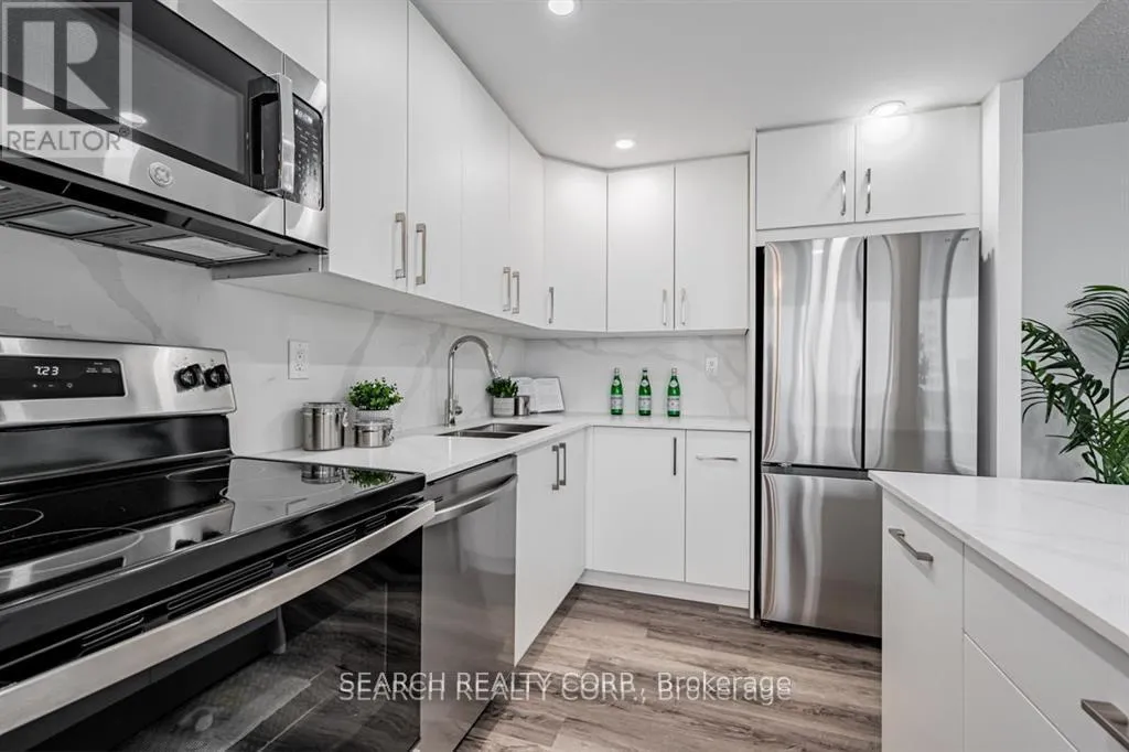 Hurontario/Burnhamthorpe Welcome to this stunning, fully renovated 3-bedroom, 1-bathroom condo offering 1200 sqft of modern living space. Situated in a highly sought-after building near Square One Mall, this condo was completely transformed in November 2024, boasting high-end finishes, exceptional amenities, and a prime location.The kitchen is a true showstopper, featuring quartz tile backsplash, quartz countertops, brand-new custom cabinetry, and top-of-the-line appliances. A spacious center island serves as a perfect gathering spot for meals or entertaining. The attention to detail is carried throughout the home, with brand-new light fixtures illuminating every room, fresh paint creating a bright and inviting atmosphere, and sleek new laminate flooring. Bathroom has been fully upgraded with modern finishes w new bathtub. Each of the three bedrooms is generously sized, featuring brand-new mirrored closets with ample storage. In-suite laundry area is equipped with a brand-new washer and dryer. This condo also includes owned underground parking, located close for secure and convenient access. Condo fees cover heat, hydro, water, air conditioning, common elements, parking, building insurance, with 24/7 security & concierge services ensuring a worry-free lifestyle. Fully equipped fitness center, indoor pool, sauna & party room. Ample visitor parking for hosting friends & family. Located steps from Square One Mall, Mississaugas best dining, shopping, & entertainment. Proximity to top-rated schools, parks, & community centers, next to 403, 401, and QEW, public transit, and the upcoming Hurontario LRT. (id:27476)
