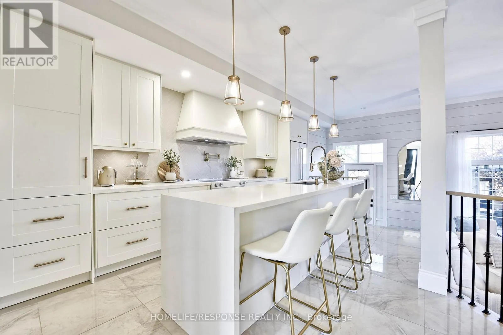 EGLINTON AVE WEST/NINTH LINE Welcome to 1 of a kind renovated throughout executive freehold town in great Churchill Meadow Neighbourhood. This fully modern renovated town offer approx. 2000 sq. feet of living space of modern sophistication. Around 200 k renovations include: New Roof, Kitchen, Bathrooms, Flooring, Stairs, Doors, Pot lights, Smooth Ceiling throughout, finished basement w/ 3pcs bath and decorative wall details throughout the house, beautiful light fixtures. Almost Every detail of this house has been thoughtfully upgraded. Extended kitchen with new modern cabinets, extended quartz island, premium white appliances, unique pot filler over the stove, garburator in the sink, porcelain flooring and backsplash. Primary bedroom offers fully renovated 4pcs modern ensuite with freestanding bath, separate shower, heated floor for you comfort. Electric fireplace and amazing decorative wall detail in primary bedroom offers exceptional atmosphere. Carpet free house with modern engineering floor on ground and 2ndlevel and good quality laminate floor in the basement. Basement finished with 3 pcs bath and rough in for wet bar/kitchenette. This is truly one of a kind house in the area with great location, close to great schools, highways, public transportation, shopping and more. 15 hour public parking on the street in front of the house. (id:27476)