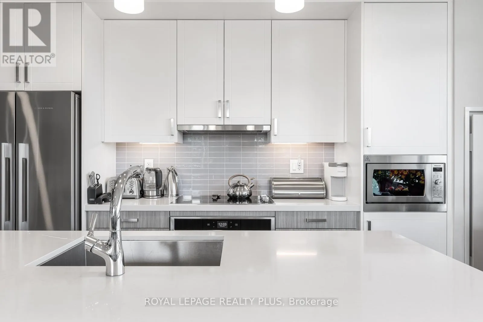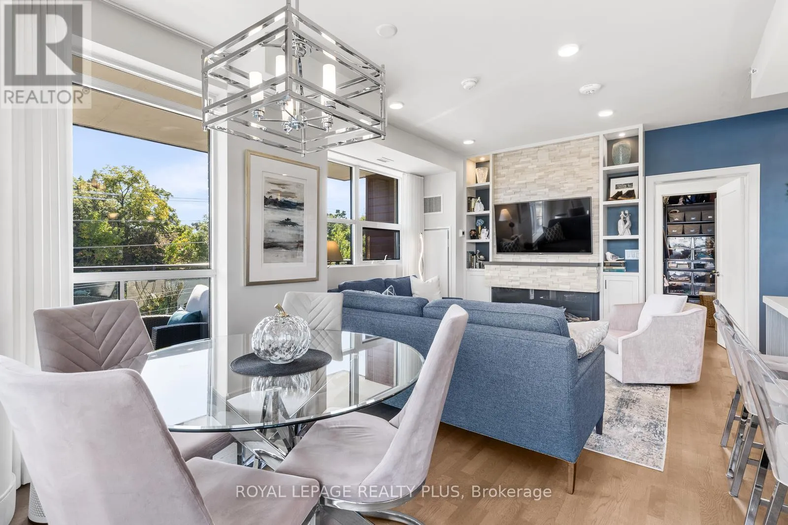 CLARKSON RD/MEADOWOOD Rich quality features and upgrades throughout this gorgeous corner unit with unobstructed southeastern views! The entry foyer leads to an open private space that is ideal for a computer center. Living room floor to ceiling custom built wall unit has electric fireplace, TV outlet, storage plus indirect lighting over open display cubes. Walk-out to balcony from corner dining area, beautiful large surround windows. The Kitchen is marvelously complete! Stainless steel appliances, double door fridge, pot drawers, extra shelves, cupboard organizers, granite counters, large island plus a built-in credenza with upper shelves. Primary bedroom, 3-pc ensuite, organized walk-in closet and blind on remote. This split bedroom model also has a 4 pc bath with jetted tub. Full size washer/ dryer. Hardwood throughout. Parking space, electric car charger, locker on suite floor. Conveniently located this well designed 2-bedroom condo is filled with custom upgrades and so much more! (id:27476)