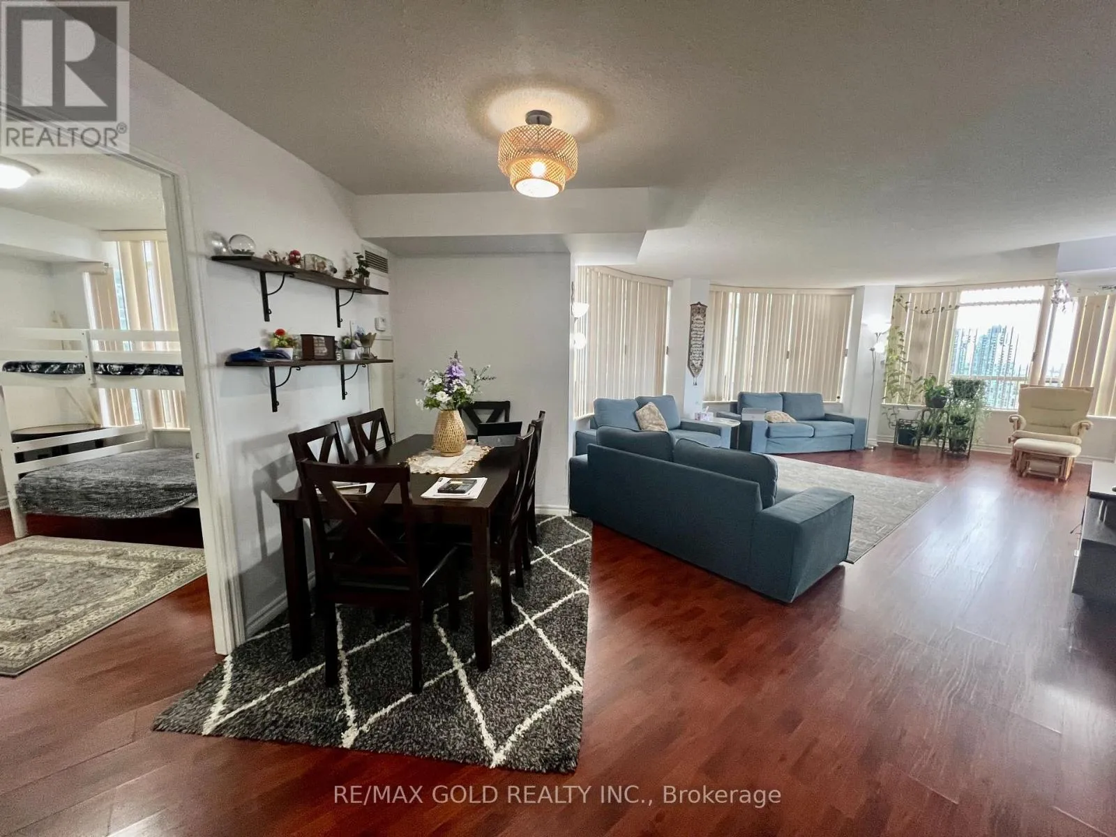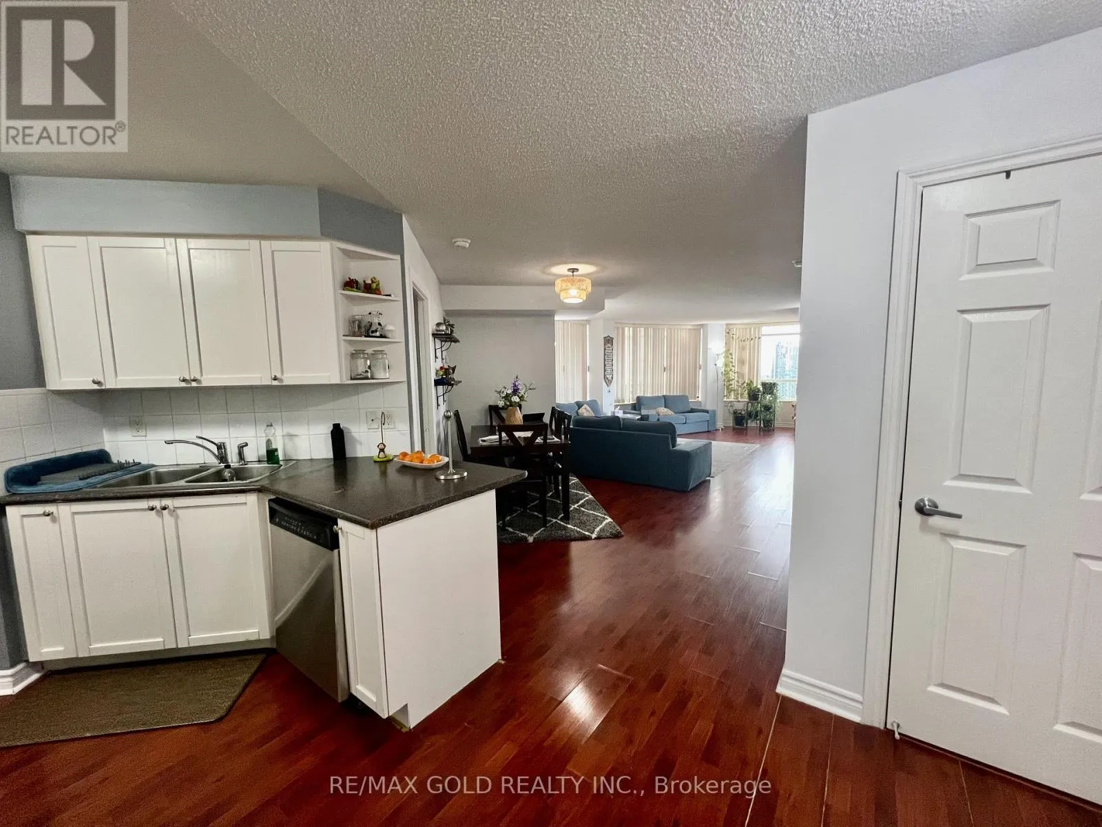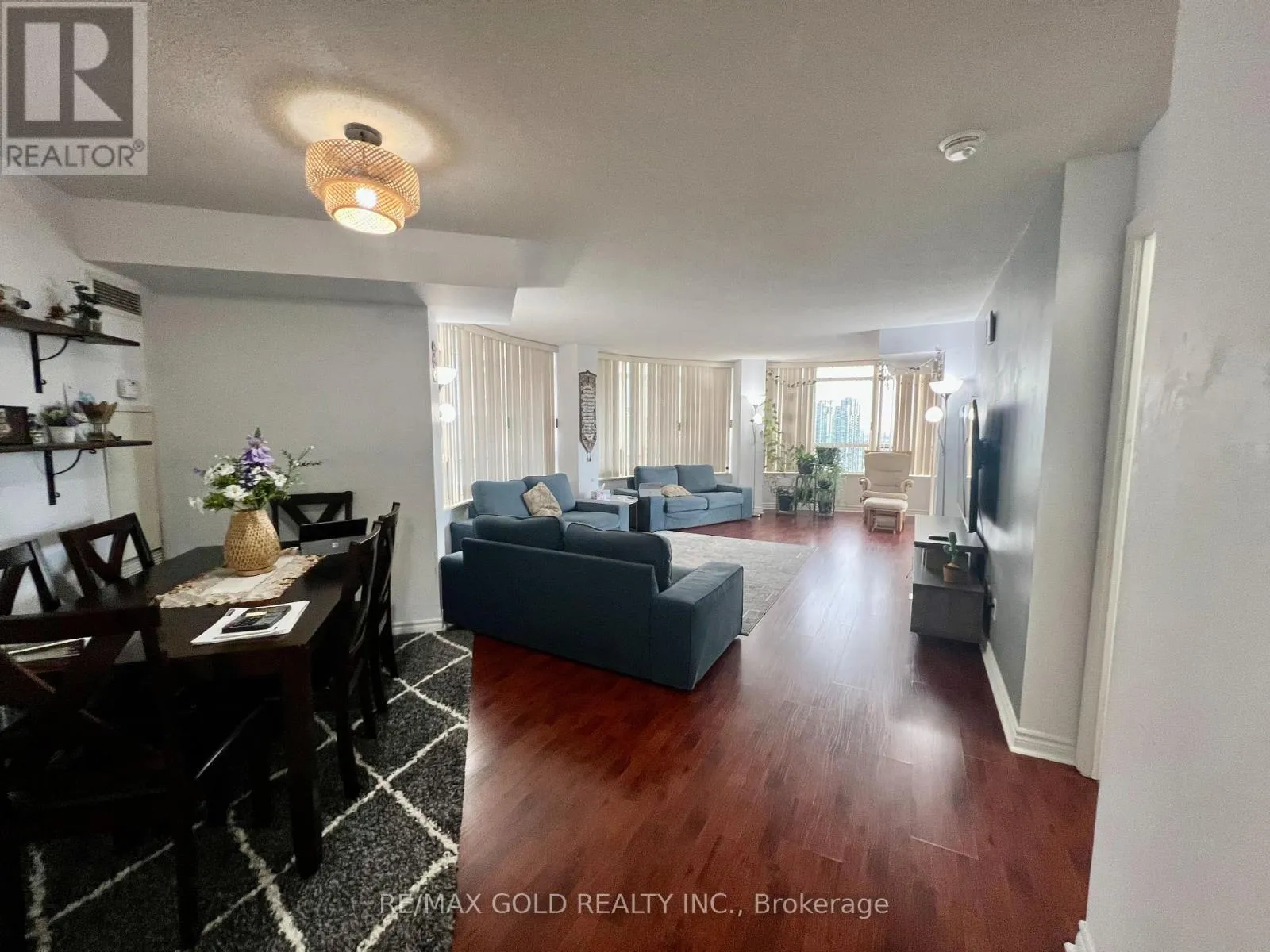 Burnhamthorpe/Hurontario Beautiful and bright corner unit with 2 bedrooms, 2 bathrooms, and a large separate den that can be used as a 3rdbedroom. The unit has an oversized living room with an open-concept kitchen, stainless steel appliances, and abacksplash. Enjoy the south view from your living room and balcony, where you can see the lake and CN Tower!The spacious primary bedroom includes a 4-piece ensuite, and the second bedroom is also a great size. The den iscompletely separate with double doors, giving you privacy to use it as an office or bedroom. Hardwood-stylelaminate floors run through the entire unit. Maintenance fees cover all utilities and the unit comes with one parkingspot. The building offers amazing amenities including a 24-hour concierge, gym, indoor pool, sauna, party room,bowling alley, games room, theatre, guest suites, and outdoor BBQ area. Located in the heart of downtownMississauga, youre steps away from Square One Mall, Celebration Square, restaurants, parks, schools, publictransit, and Highway 403. A rare find, bright, spacious, and move-in ready with everything included! (id:27476)