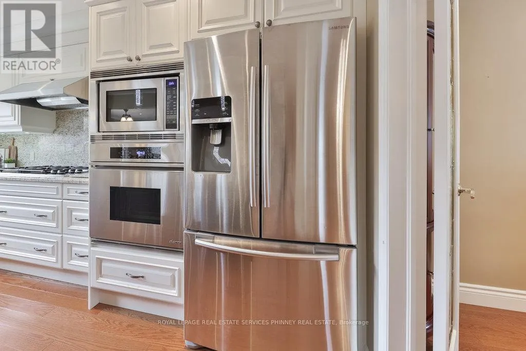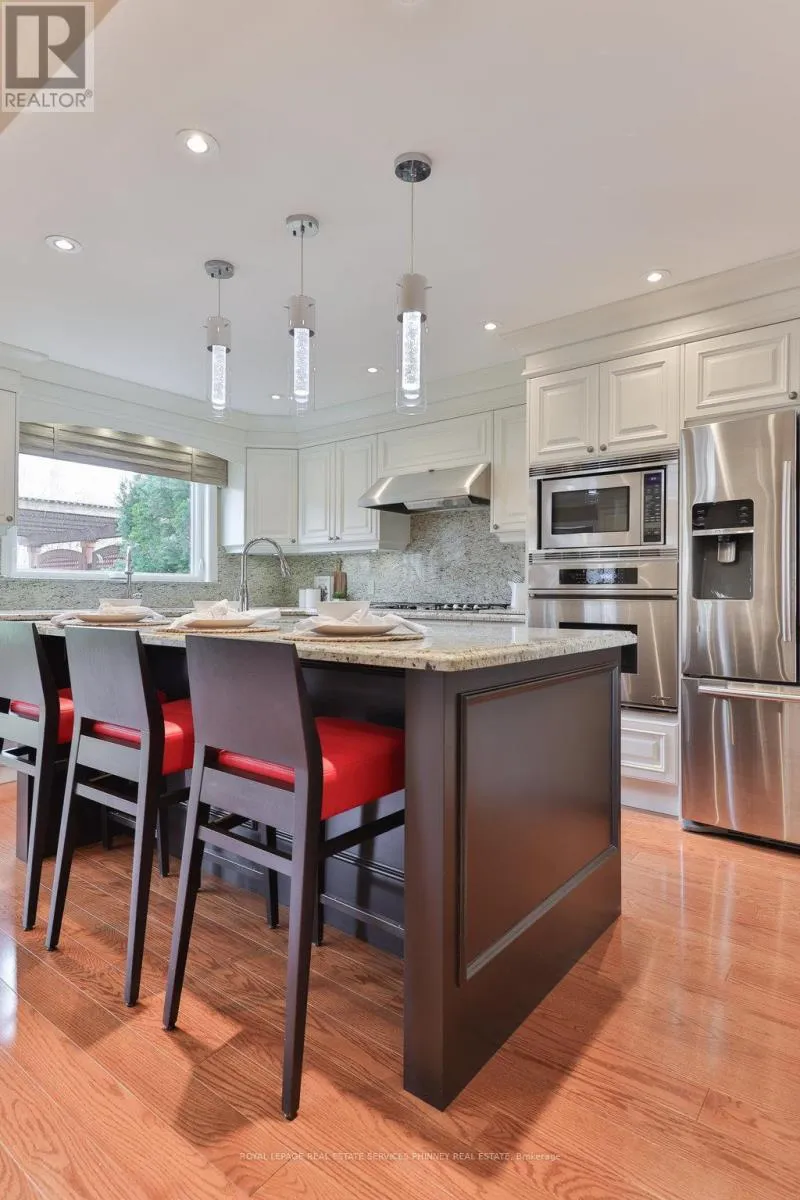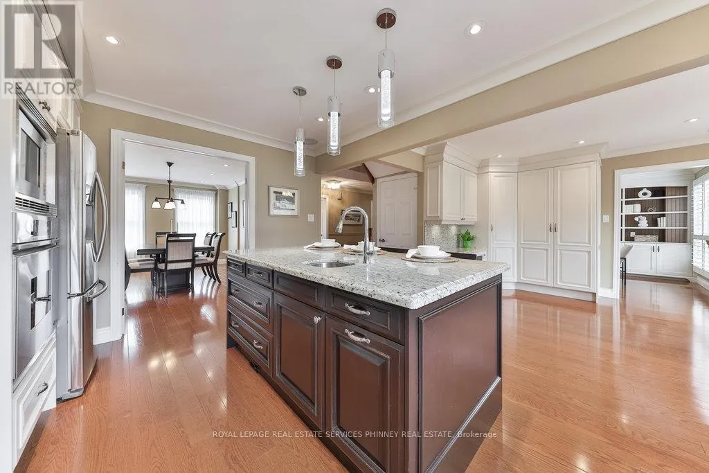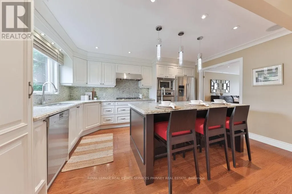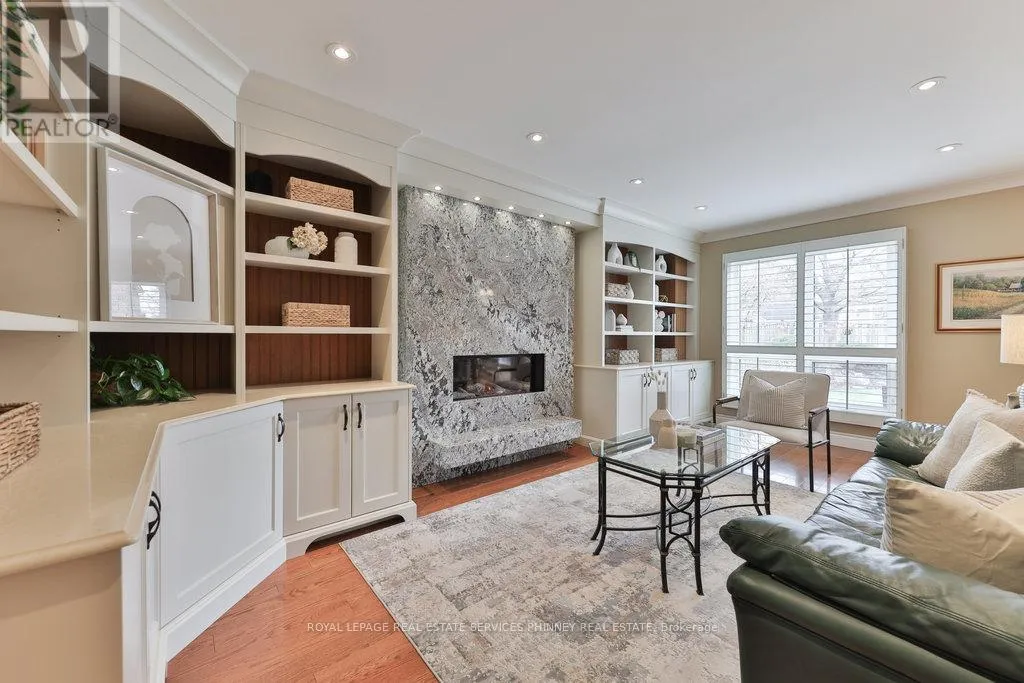 Joycelyn and Theodore Extensively renovated 4+2 Bedroom/4 Bath home with extensive custom upgrades, a flexible open floorplan, professionally landscaped grounds on a cul-de-sac location in prime Streetsville Village! Close to charming shops, dining, and excellent schools and lots of conveniences. With over 3400 square feet of finished living space, you will notice the quality throughout from its high end appliances, granite & quartz counters, slab granite backsplash, a floor-to-ceiling single slab linear fireplace, all custom cabinetry with interior wood drawers, multiple pullouts, built-in file drawers in the Family Rm, quartz counters even in the Laundry Rm over the front load appliances. Every detail was impeccably thought out! Hardwood floors are carried throughout the main & upper levels with full oak staircase. The fully renovated baths also have custom vanities & quartz counters and you will notice the Primary suite is exceptionally large. The lower level is also finished featuring a large recreation area with bar, 2 bedrooms/offices, lots of storage, and 2pc bath and wood burning fireplace. Upgrades include: metal roof (2020), new furnace & AC (2024), Pergola, patio & beautiful selection of trees, shrubs and perennials in a professional plan with sprinkler system, Epoxy garage floor. Centre island Kitchen has Dacor double wall ovens, 6 burner gas stove top, microwave, Miele dishwasher, & Samsung refrigerator with French doors. Close to GO Station. Quick access to 401/403/407, Credit Valley Hospital, & Erin Mills Town Centre. (id:27476)