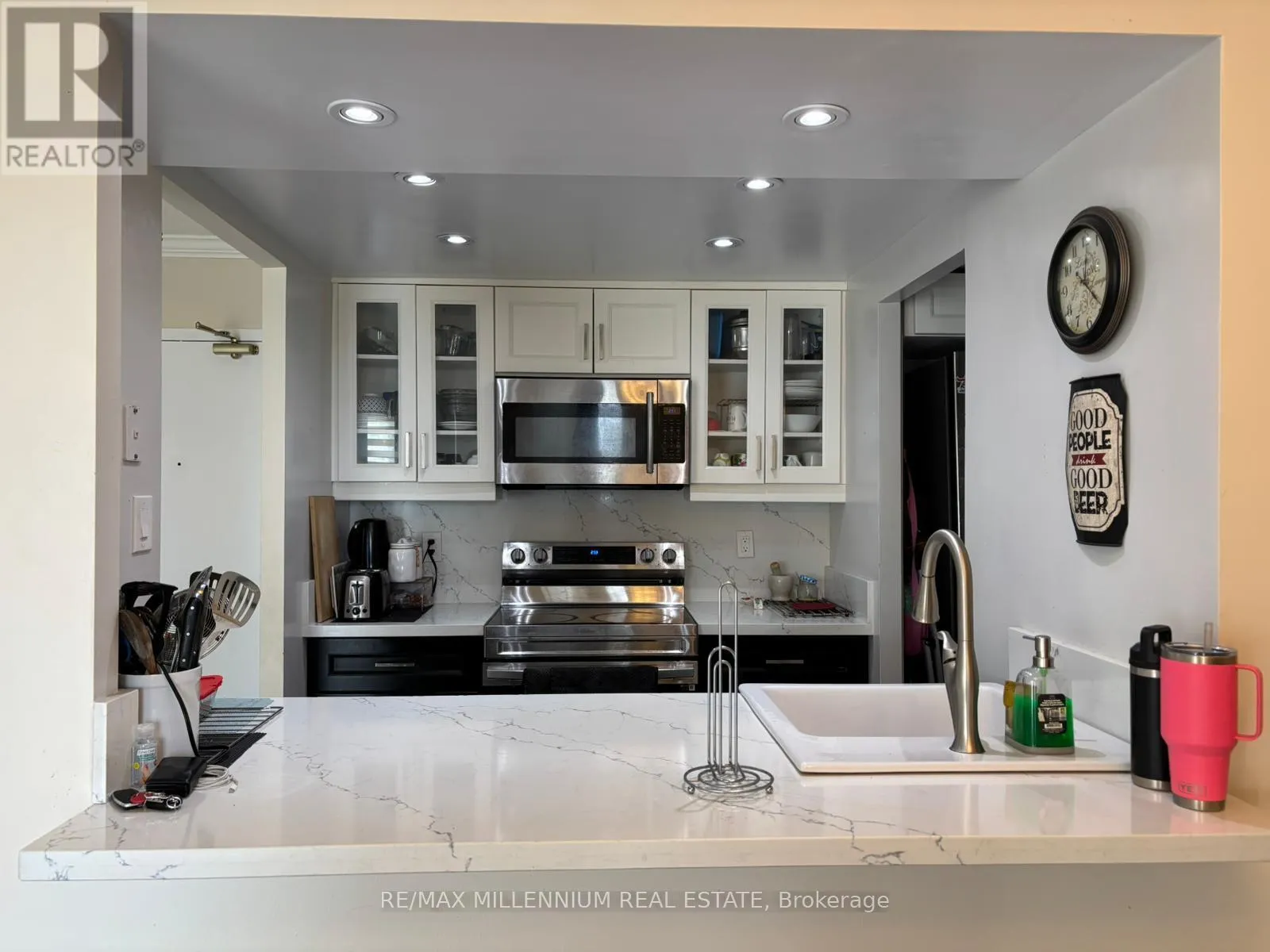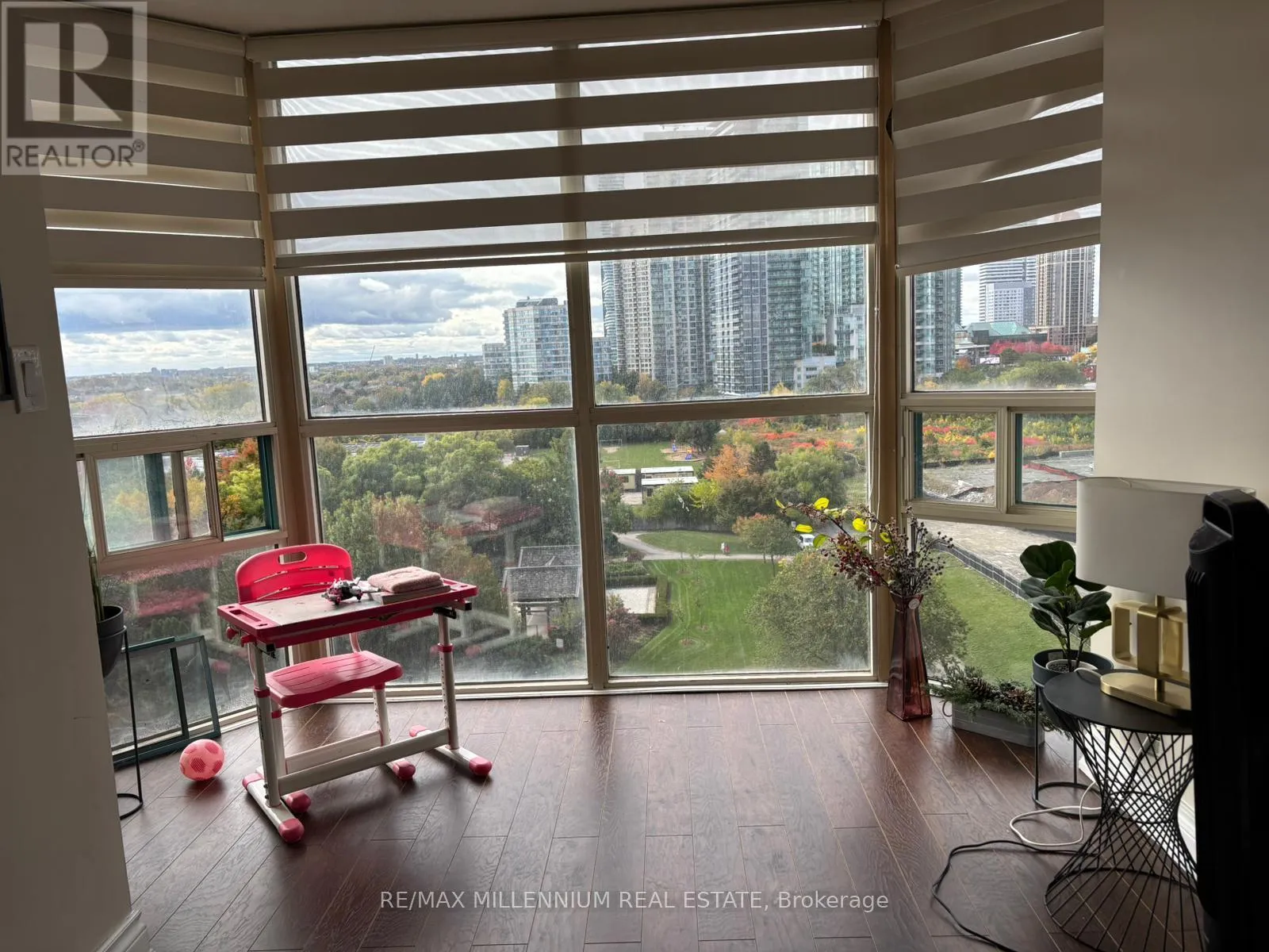 Burnhamthorpe & Hurontario Come see this beautifully upgraded, sun-filled suite offering over 900 sq. ft. of open-concept living in the heart of Mississauga! Featuring 2 spacious bedrooms, 2 full bathrooms, a bright solarium, and large windows with unobstructed views of Kariya Park, Celebration Square, andSquare One Mall.This thoughtfully renovated home features modern laminate flooring, custom baseboards, crown moulding, and fresh paint. The elegant galley-style kitchen showcases upgraded cabinets, quartz countertops, a farmhouse sink, and stainless-steel appliances. Both bathrooms have been tastefully redone with quartz vanities, new fixtures, and lighting.Enjoy the perfect blend of comfort and style in a well-maintained building, just steps to transit, shopping, dining, and all downtown Mississauga amenities.Very Clean, Well Maintained,Rare Find. Must See To Appreciate. (id:27476)
