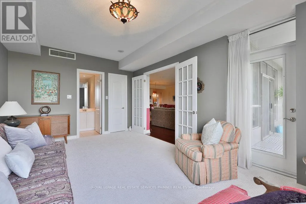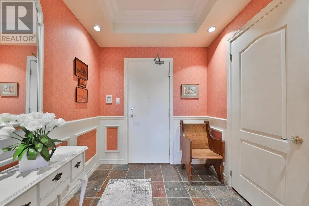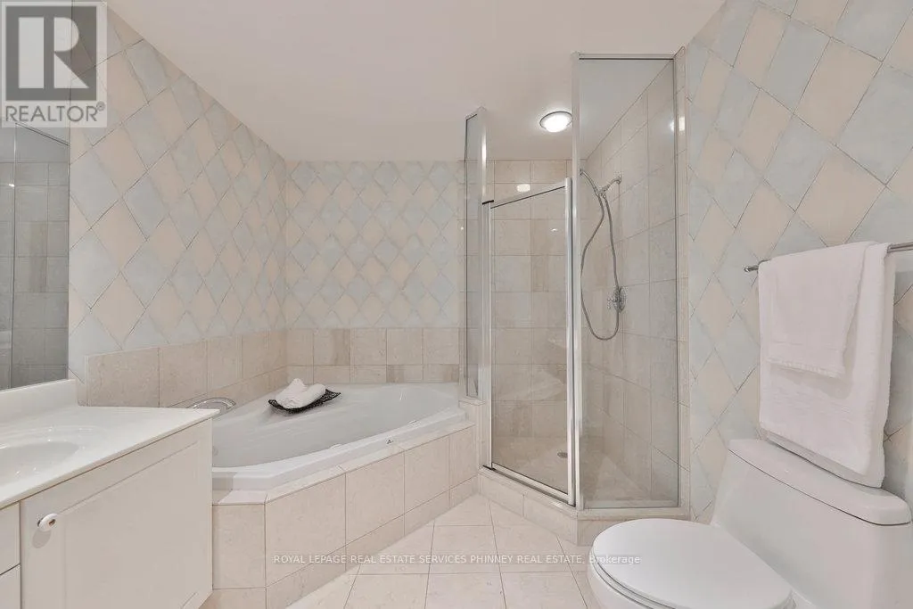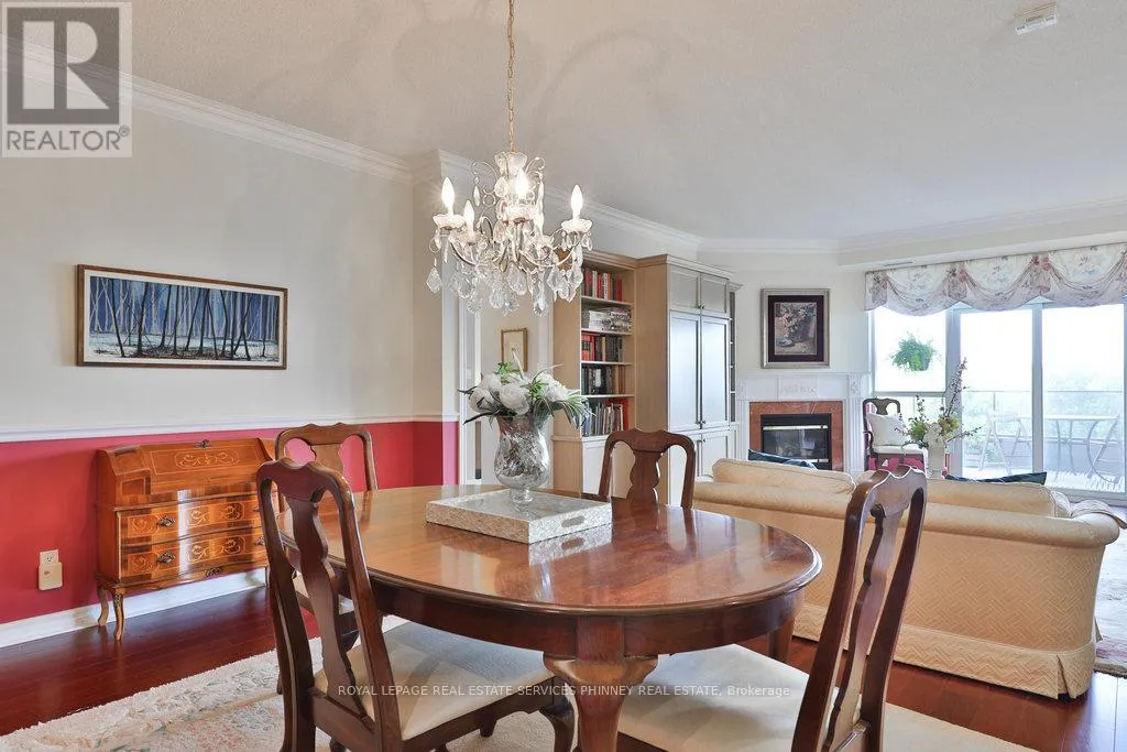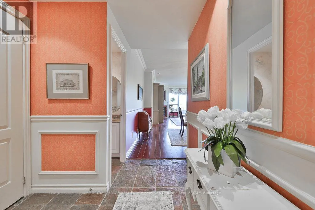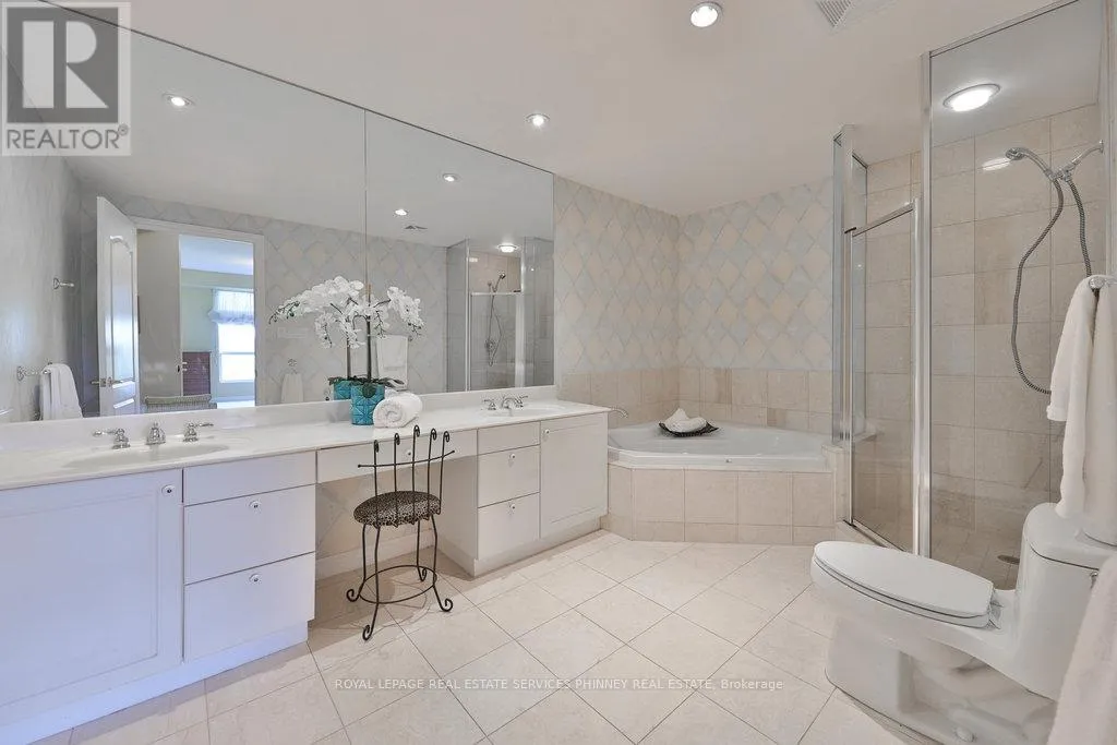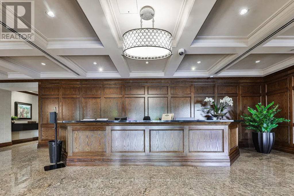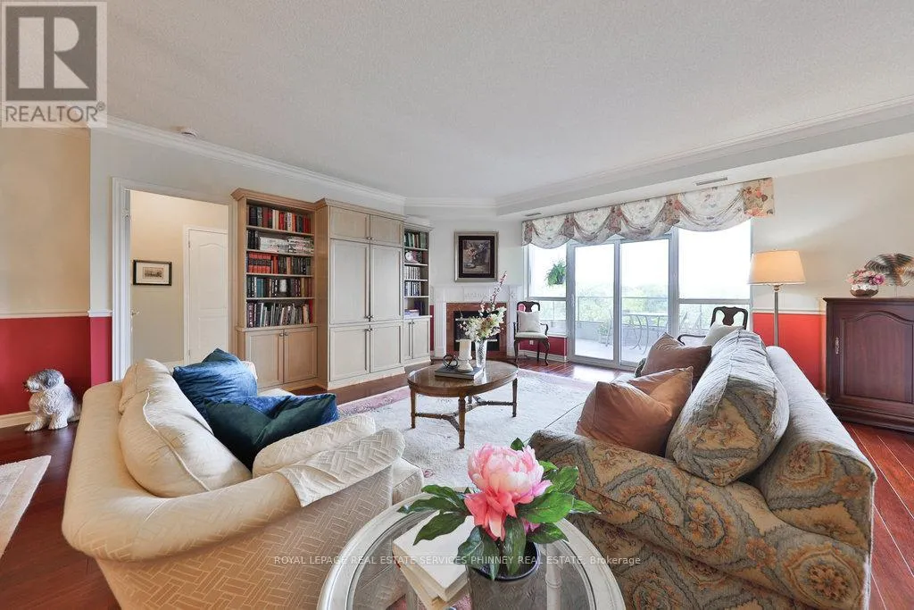 The Collegeway & Mississauga Rd Welcome to The Palace, one of Mississauga's most prestigious and highly sought-after condominium communities. This upscale residence offers a wealth of amenities, including concierge, fitness centre, indoor pool, car wash station, underground visitor parking, and more. This desirable 2-bedroom, 2.5-bath "07" model boasts a tranquil easterly exposure, offering treetop views of the picturesque Sawmill Valley Trail. Spanning 1,732 sqft, the unit features a thoughtfully designed and functional layout. The tasteful open-concept living and dining area is perfect for everyday life, accentuated by stylish wainscoting and complete with a cozy gas fireplace and custom built-in bookshelves. The kitchen provides ample storage and sightline into the main living spaces, making it both practical and inviting. The spacious primary bedroom includes a walk-in closet, a luxurious 5-piece ensuite, and walk-out access to the oversized balcony. The second bedroom, accessed through elegant French doors, also features a walk-in closet, its own 4-piece ensuite, and walk-out to the balcony. Life at The Palace offers sophisticated, resort-style living with all the conveniences of a central location-yet comfortably removed from the city's hustle and bustle. Experience refined living at its finest. One underground parking space close to the elevator and a sizeable storage locker also included (id:27476)