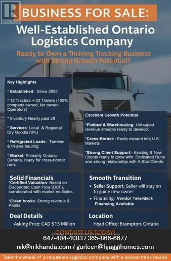 Dundas St E And Mattawa Ave A rare chance to own a profitable and well - established trucking company in Mississauga. Acquire a thriving trucking operation with over 20 years of continuous growth and an excellent reputation. This business strategically located in a high demand Mississauga industrial hub. Offer a turnkey solution for any serious buyer. Financials: The company boasts a healthy cash flow , positive financials, and a consistent track record of growth, supported by loyal, repeat clients and dedicated runs with A - class Vendors. Operational Excellence: With a satisfactory CVOR rating and an excellent insurance track record, this business runs smoothly. The sale includes a mixed fleet of flatbeds, reefers, and long - axle trucks and trailers, all well maintained. The team consists of seasoned drivers and all dispatch and operational systems are fully in place. Expansion Potential: Currently operating exclusively in Ontario, the company holds a parked US - DOT license, offering an immediate option for the new owner to expand into cross border operations. Transition & Support: The current owner is committed to a smooth transition period and is willing to stay on as an advisor to ensure continued success. To assist with the acquisition, VTB financing is also available. CIM: CBV report and a fleet list will be provided upon signing a LOI and NDA. Full Business details, financials, and a complete fleet list will be provided upon accepted offer and receipt of the deposit. (id:27476)