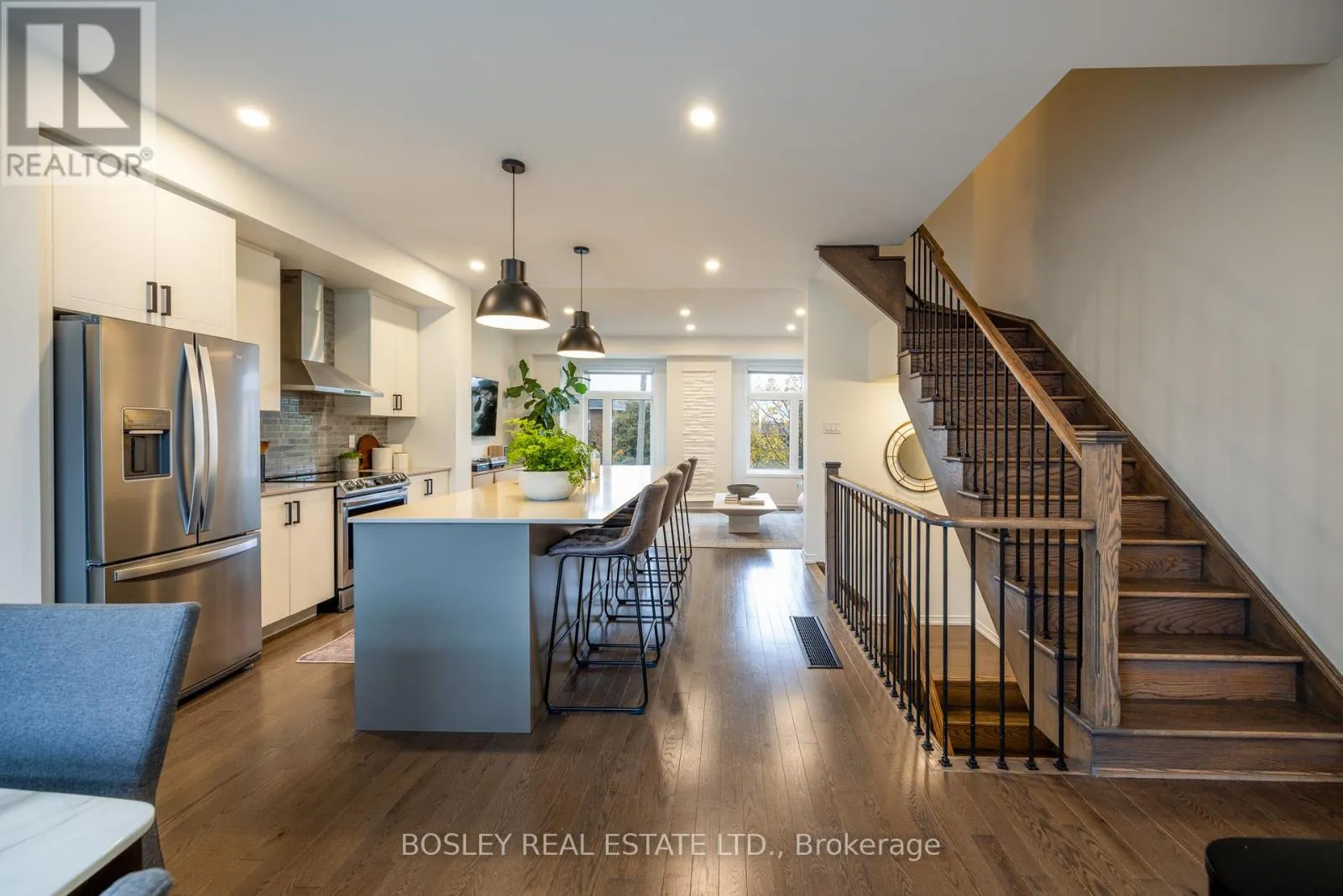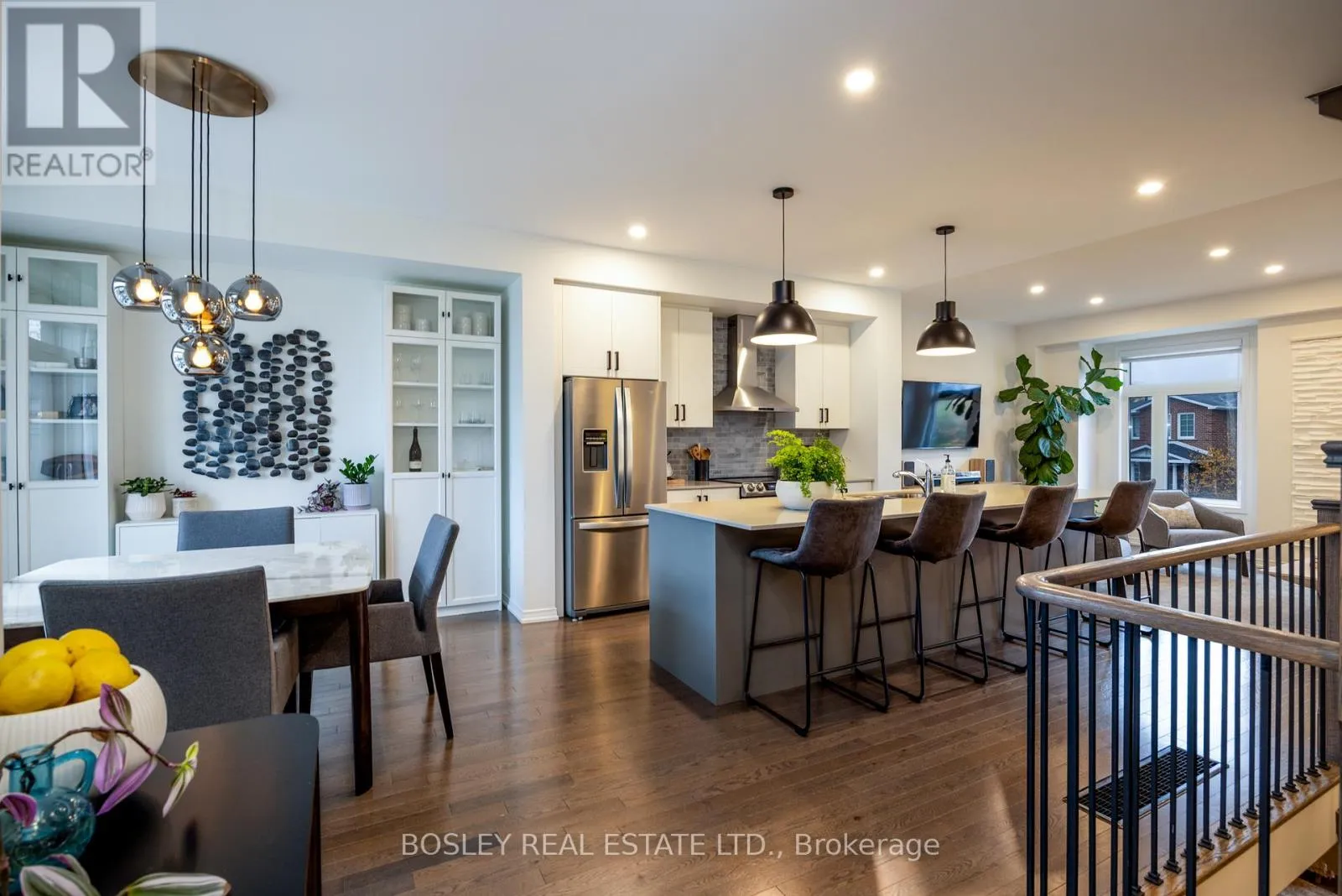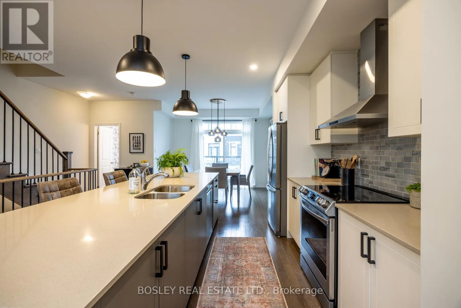 Cross Streets: Fieldgate/Eastgate. ** Directions: Fieldgate & Eastgate Parkway. Stunning Semi-Detached Home In Rockwood Village! Over 2000 sqft of total living space across four levels. This executive-style freehold home blends relaxed sophistication with thoughtful design. The main level features a mudroom-style foyer with ample space and storage for all your gear. A rarely offered, optional floor plan showcases an extra-large chef's kitchen with quartz counters, stainless steel appliances, and an oversized island. Perfectly positioned between the dining and living rooms, this space is truly the heart of the home-offering a natural gathering place for family and friends, ideal for entertaining, supervising homework, and everyday living. The spacious living and dining areas feature 9ft ceilings and abundant natural light. Upstairs, the primary retreat offers a walk-in closet and a luxe ensuite with a glass shower and double quartz vanity. Well appointed second and third bedrooms provide comfort and flexibility. The ground-level fourth bedroom, complete with a 3pc ensuite and walk-out to Audubon Blvd, is currently used as a main floor office, an ideal setup for a home based business. Additional highlights include four bathrooms, hardwood floors throughout, a single car garage plus driveway parking. This beautifully maintained home with numerous upgrades offers exceptional style, function, and convenience in one of Mississauga's most desirable communities. (id:27476)