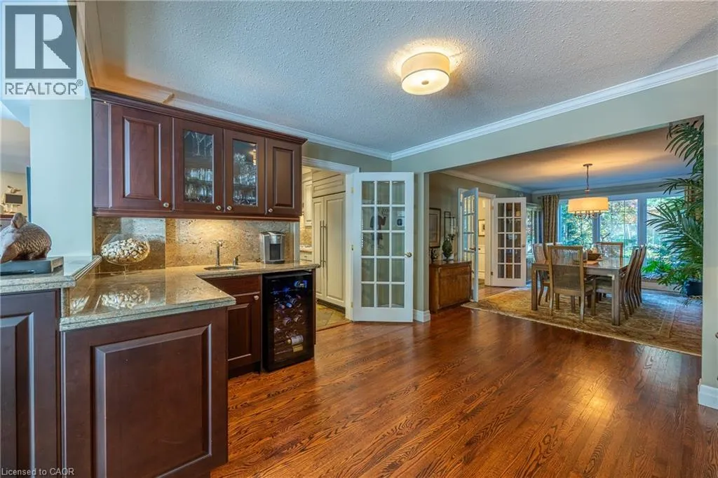 South service road to Indian Road. Indian Road to second right onto Lorne Park Road. Next left onto Royal Oaks. Next right onto Prince Albert Court. Nestled at the end of a highly sought-after court in prestigious Lorne Park, this elegant two-storey, five-bedroom residence blends timeless design with exceptional indoor and outdoor living. Ideally located within a five-minute walk of the highly rated Lorne Park High School and Lorne Park Elementary School, as well as a short walk to shopping and the local library. Upon entering, the spacious foyer leads to a dining room with a fireplace and a bright, modern kitchen featuring stainless steel appliances, an integrated refrigerator, a large island with breakfast bar, pantry, and a spacious dining area with garden doors opening to a large stone patio. Step down to the TV room, highlighted by a vaulted ceiling, cove lighting, and a two-sided gas fireplace shared with the kitchen dining area. A main-floor office with wrap-around windows and a private side entrance is complemented by an adjoining living room with a fireplace. Slate flooring extends through the foyer, kitchen, breakfast room, family room, and powder room, while hardwood floors enhance the remaining main level, adding warmth and sophistication. Upstairs, discover five generous bedrooms, including a primary suite with a luxurious five-piece ensuite and a large walk-in closet with a window, along with a four-piece main bath featuring a large glass shower. The finished basement, with cozy carpeting, provides abundant additional living space featuring a billiards room, family room, bonus room, three-piece bathroom, a large storage area, and a workshop. Enjoy outdoor living with a stone patio, lower entertaining terrace, sparkling pool and hot tub, pool house, garden shed, and a sprawling tree-lined backyard offering the utmost privacy. This is the perfect home and location for a young familyâa rare opportunity on one of Lorne Parkâs most coveted courts, combining sophistication, comfort, and everyday convenience. Make this beautiful Lorne Park home your familyâs next chapter. Book your showing today. (id:27476)