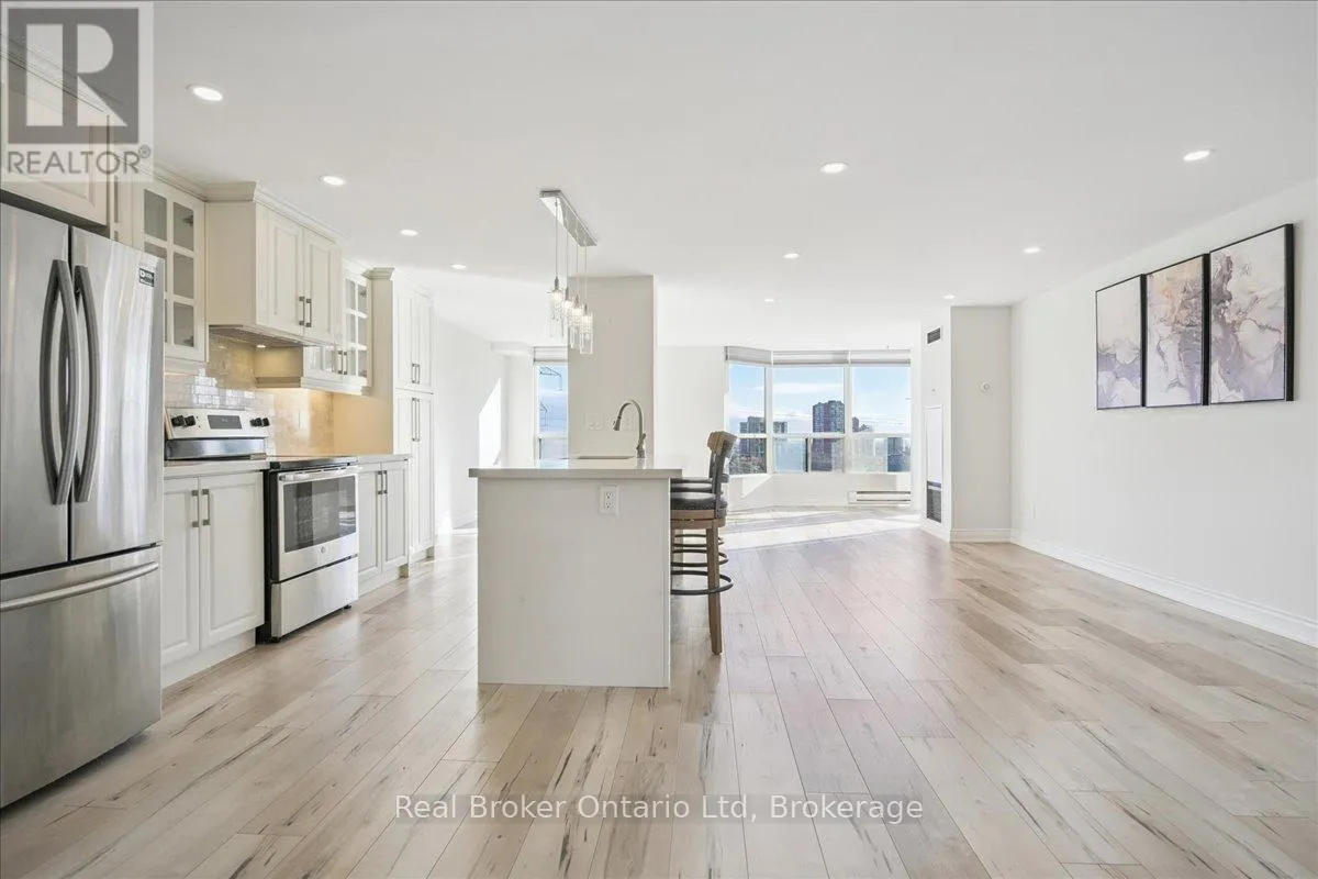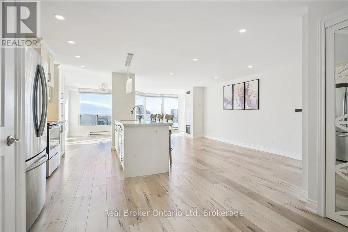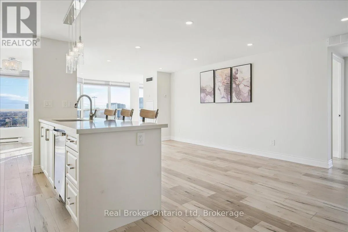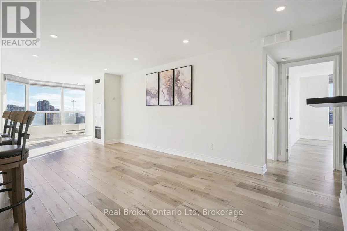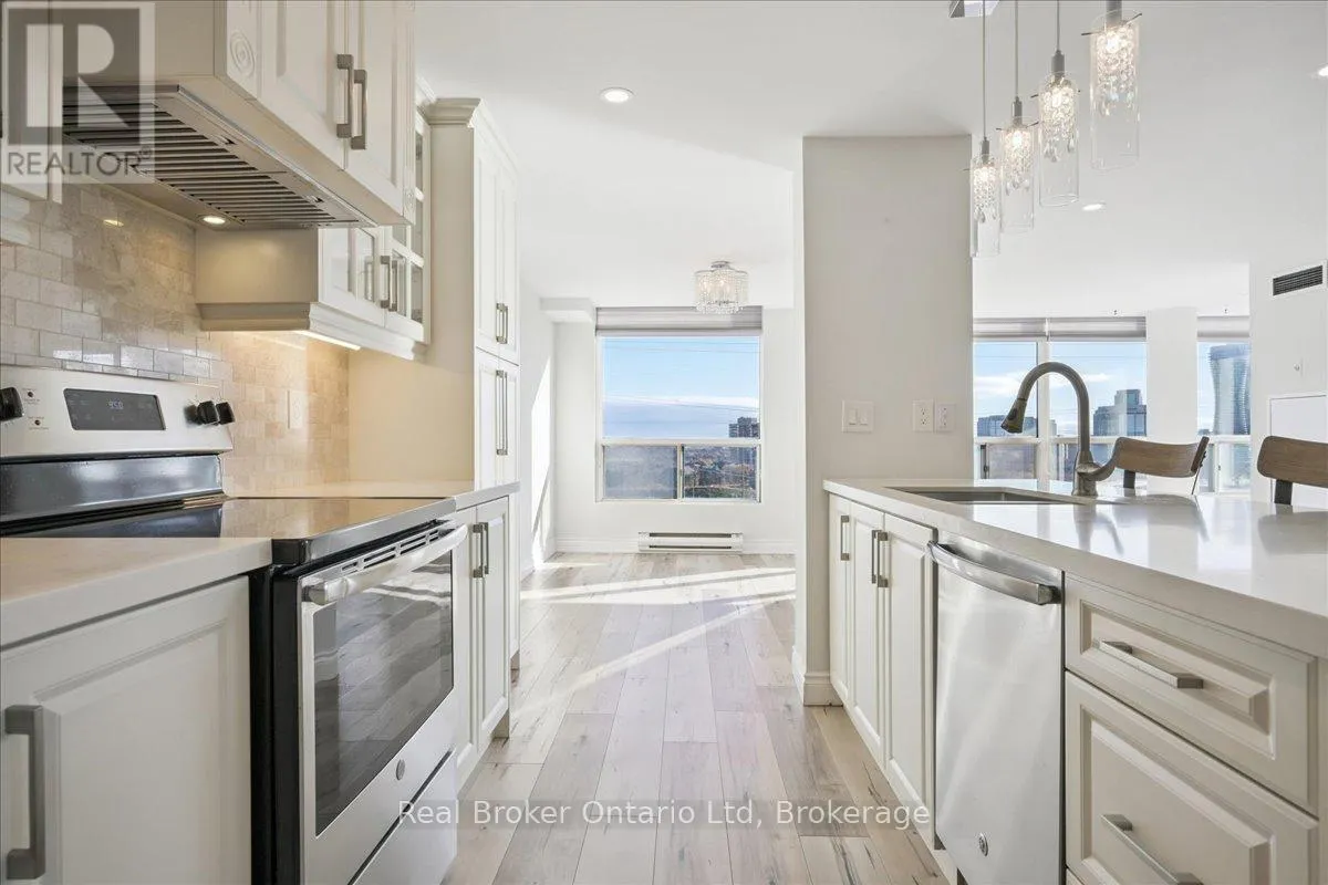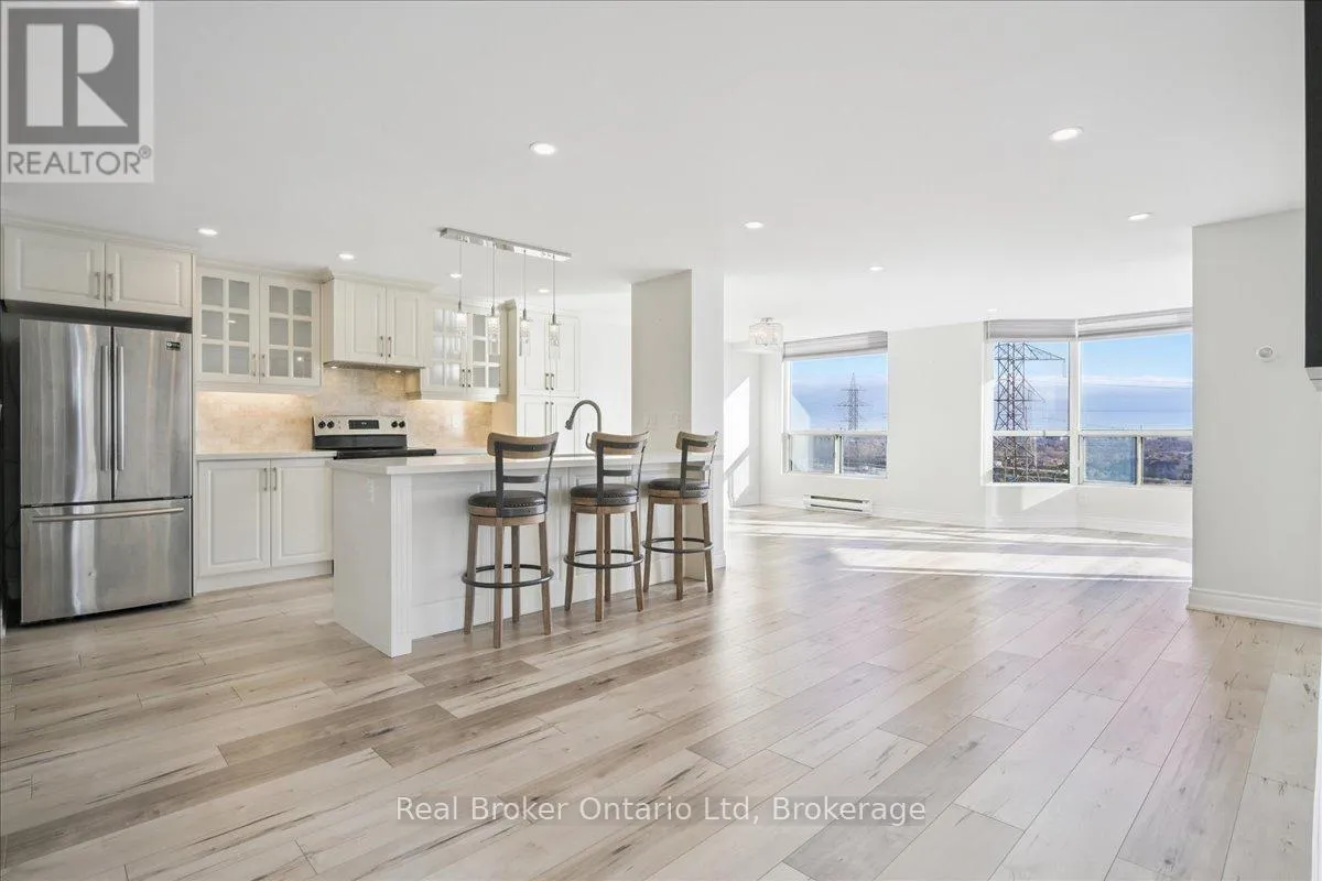 Hurontario St & Eglinton Ave Welcome to a place where the city's energy meets the calm of home, a sun-drenched 2+1 corner suite designed for the way modern professionals live, work, and unwind. Perched high above Mississauga, this fully renovated residence welcomes you with wraparound windows that frame the skyline, bathing every inch in natural light. Morning coffee tastes different here, with the sun rising across the horizon, and evenings are defined by glowing sunsets washing through the solarium, your perfect home office or creative space. The open concept layout feels effortless, centered around a custom kitchen with quartz counters, stainless steel appliances, glass cabinetry, and elegant lighting. A sleek electric fireplace anchors the living area, adding a touch of warmth and modern character to the space. The primary bedroom features a walk-in closet and ensuite, while the second bedroom and full bath offer adaptable space for family, guests, or whatever life brings. A private locker and underground parking add everyday convenience. Beyond your door, the building elevates your lifestyle with 24/7 concierge, abundant visitor parking, and amenities designed to elevate your everyday: an indoor pool with glass walls overlooking nature, a fully equipped gym, sauna, tennis court, party room, guest suites, and yes, even vending machines for those nights when a quick snack feels essential. All of this in a prime pocket just minutes to Square One, steps to Hurontario and minutes from HWY 403 with quick connections to 401 and QEW, as well as restaurants, parks, and the city's vibrant core. This isn't just a condo, it's a daily experience shaped by comfort, sunlight, and the feeling of being exactly where you're meant to be. A sanctuary above the skyline. (id:27476)