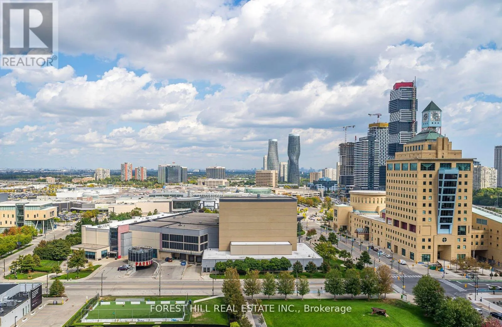 Confederation/Burnhamthorpe Come marvel at a beautifully expansive living opportunity that will make all visitors jealous! This lofty, and efficient layout will make even the most particular buyer will appreciate! This sun-soaked, southwest facing unit is one of the best in the building! Overlooking the bustling scenery of nature, and downtown Mississauga, you can bask on your beautiful patio overlooking everything, and anything the eye desires. Just steps from Square One, Celebration Square, excellent restaurants/cafe, and more of the best that Mississauga has to offer! Public transit, and the 403 just minutes away - you could be at work in no time! Access to some of the best amenities the city can offer! 24 hour concierge, pool, gym, sauna, rooftop patio, visitor parking, party room, and guest suites! (id:27476)