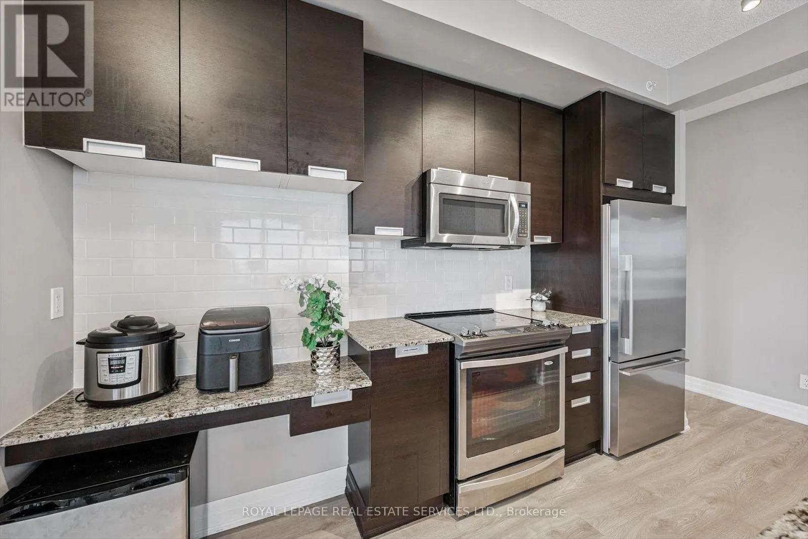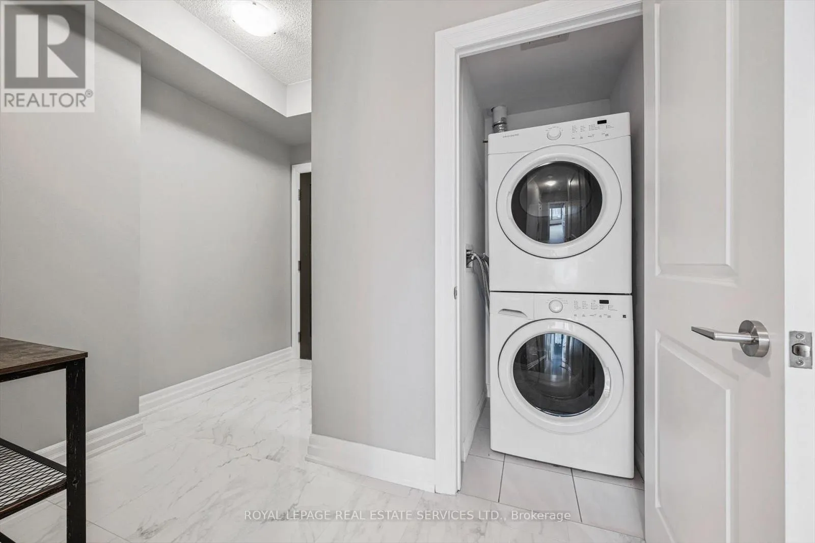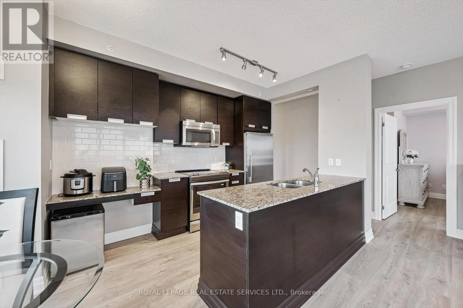 Cross Streets: Hurontario Street AND Eglinton Avenue West. ** Directions: Hurontario Street / west on Eglinton Avenue West. WELCOME TO CRYSTAL CONDOS! IMMACULATE TWO BEDROOM, TWO BATHROOM SOUTH-EAST CORNER SUITE! This exceptionally well-maintained condominium apartment offers nearly 930 square feet of refined living space, complemented by an expansive approximately 100 square foot balcony showcasing unobstructed skyline views. Floor-to-ceiling windows bathe the interior in natural light, enhancing the bright and airy atmosphere throughout. Thoughtfully designed for both everyday living and entertaining, the open concept layout features a spacious living room, a dedicated dining area with walkout to the private balcony, and a gourmet kitchen complete with granite countertops, subway tile backsplash, and stainless steel appliances. The primary bedroom boasts a walk-in closet and a spa-inspired four-piece ensuite. A generous second bedroom, luxurious three-piece bathroom, and convenient in-suite laundry complete the residence. Additional highlights include high-quality wide-plank laminate flooring, 4" baseboards, upgraded sound/heat/light-blocking roller blinds, one underground parking space, and a dedicated storage locker. An additional underground parking space, P2 #121, may be leased for $150 per month. Residents enjoy an impressive collection of resort-style amenities, including a 24-hour concierge, indoor pool and hot tub, sauna, fully equipped fitness centre, yoga studio, library with Wi-Fi workstations, theatre room, billiards and entertainment lounge, party room with full kitchen and dining area, guest suites, an expansive outdoor terrace with BBQs, and ample visitor parking. Ideally located close to grocery stores, Square One Shopping Centre, Heartland Town Centre, schools, parks, public transit, and major highways. A rare opportunity to own a premium corner suite in the heart of Mississauga. (id:27476)