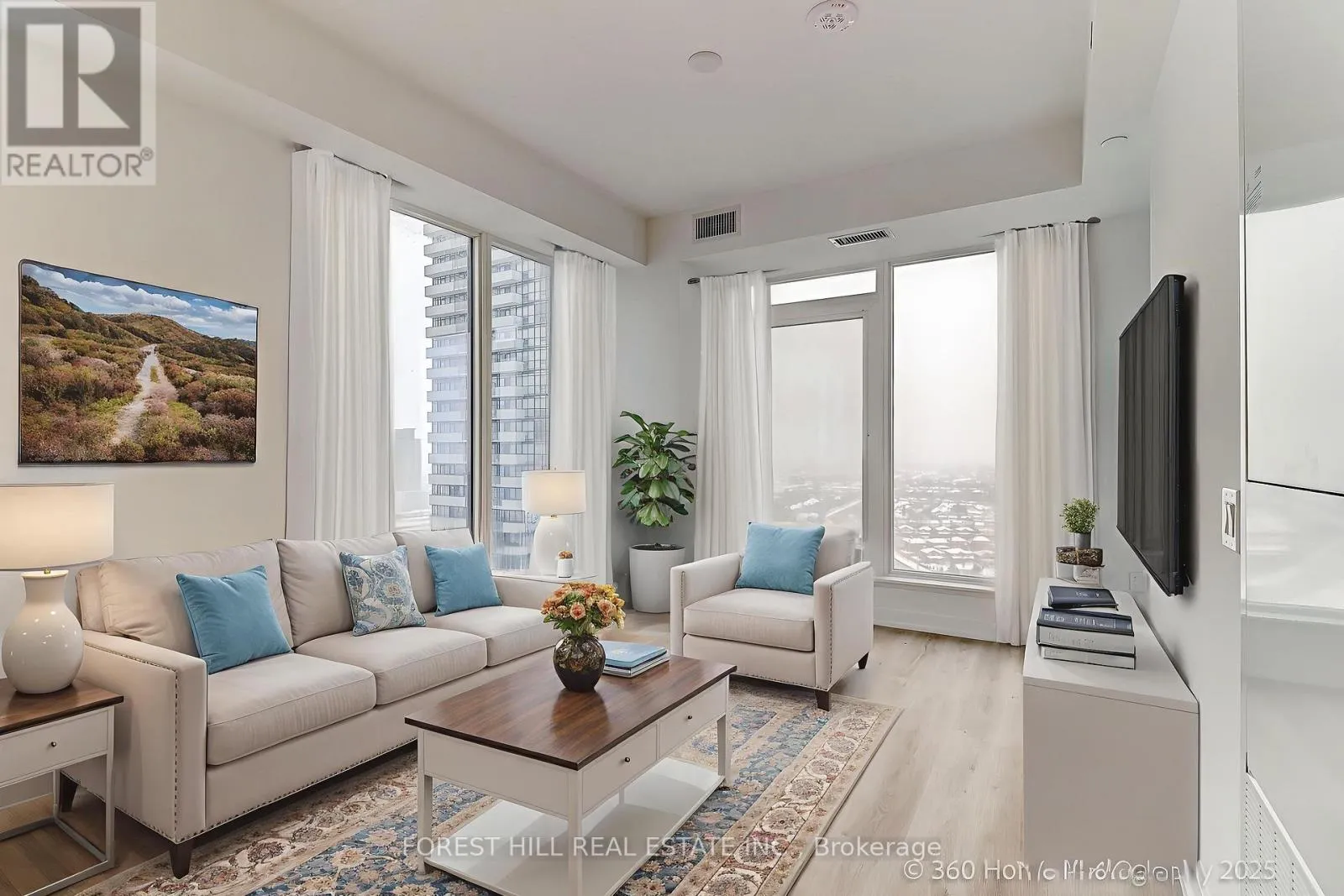 Cross Streets: Confederation & Rathburn Road West. ** Directions: S/E Corner of Confederation and Rathburn Road West. JUST FABULOUS. This corner 2 Bed-2Bath suite in the highly sought-after Daniels-built Square One District, is perfectly set in the heart of Mississauga's most vibrant neighborhood. This sun-drenched residence offers approximately 820 sq. ft. of thoughtfully designed living space (9 ft ceilings) ideally positioned for privacy and natural light. A chic, contemporary color palette creates a sophisticated yet welcoming atmosphere and the modern chef-inspired kitchen anchors the open-concept great room, featuring a functional island, quartz countertops, stainless steel appliances, and soft-close cabinetry-perfect for everyday living or entertaining in style. Step out onto the private balcony and unwind as you take in stunning views and unforgettable sunsets, offering a peaceful retreat above the city buzz. Residents enjoy access to exceptional amenities, including a basketball court, state-of-the-art fitness center, rooftop terrace, and elegant co-working spaces. A sleek, modern lobby and friendly concierge service complete the elevated living experience. With easy access to highways, Square One shopping, Transit Terminal, Sheridan College, and fine dining, everything you need is right at your doorstep. (id:27476)