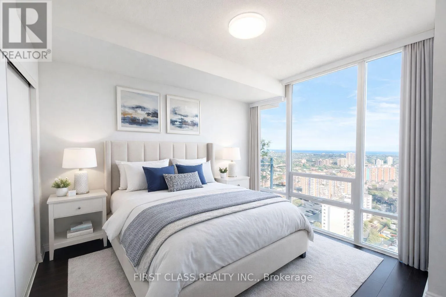Hurontario / Burnhamthorpe Prepare to be captivated. This exquisite, recent newly renovated corner unit luxury condo offers an unparalleled living experience in the absolute heart of Mississauga. From the moment you step inside, you are greeted by a bright and spacious layout flooded with natural light through walls of windows, framing breathtaking, unobstructed panoramas of the city skyline and Lake Ontario.This sophisticated retreat features a desirable two split-bedroom layout, ensuring ultimate privacy and tranquility. The expansive primary suite is a true sanctuary, boasting its own spectacular vista. Every detail of the recent renovation has been carefully curated with high-end finishes, creating a seamless blend of modern elegance and comfort (id:27476)