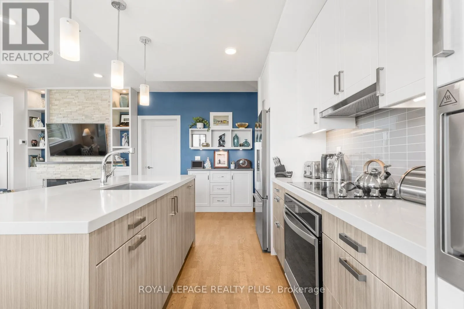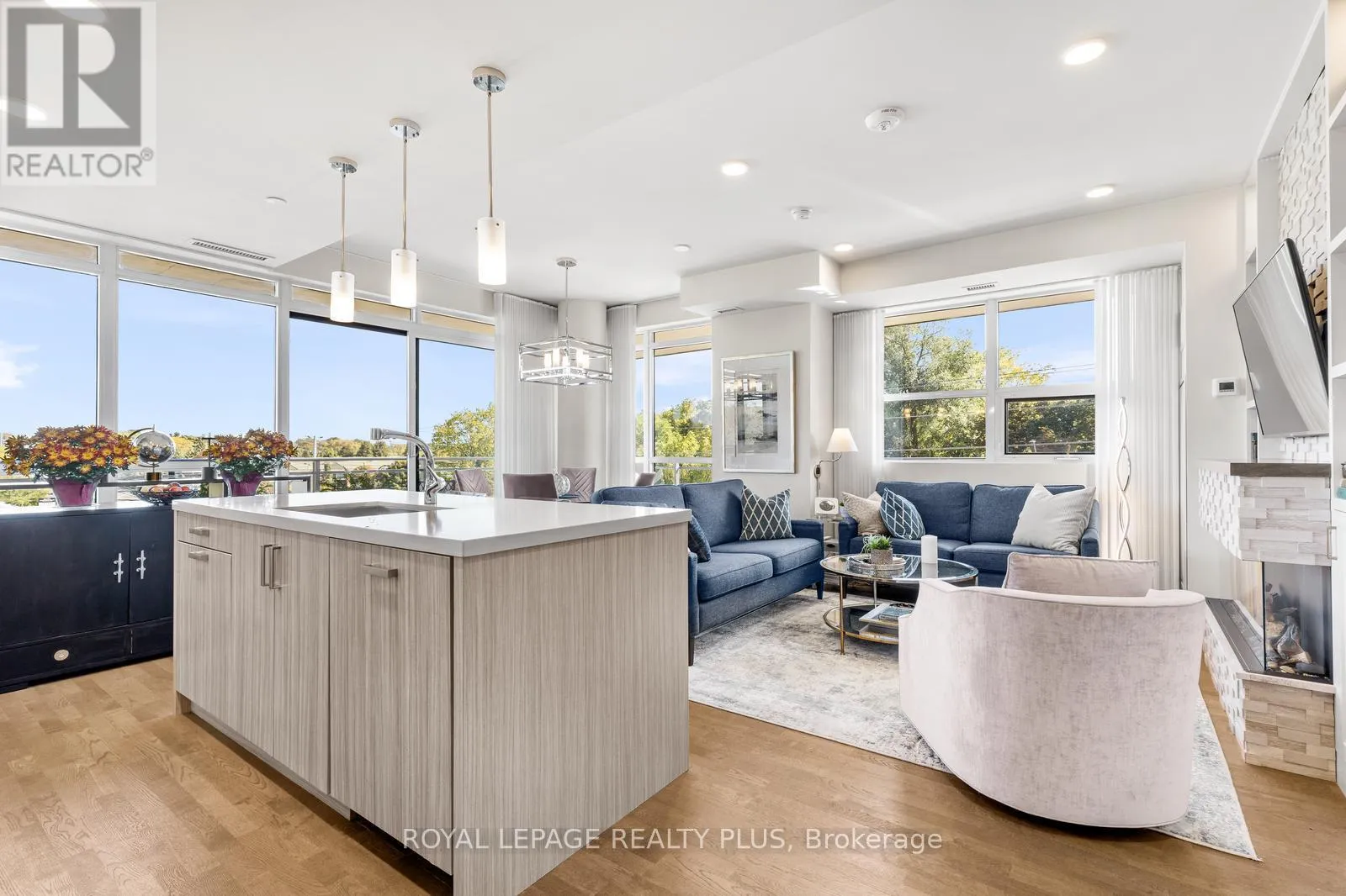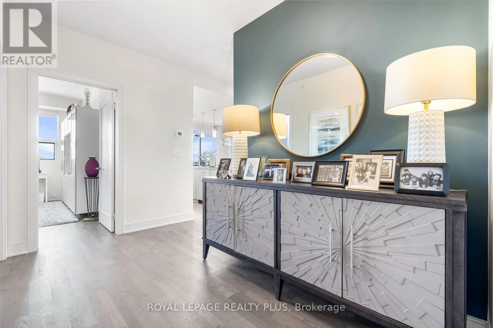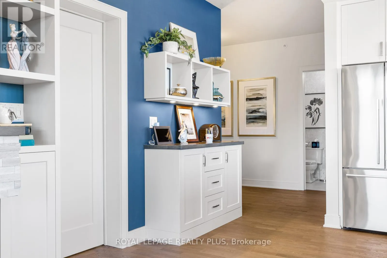 CLARKSON RD/MEADOWOOD Rich quality features and upgrades throughout this gorgeous corner unit with unobstructed southeastern views! The entry foyer leads to an open private space that is ideal for a computer center. Living room floor to ceiling custom built wall unit has electric fireplace, TV outlet, storage plus indirect lighting over open display cubes. Walk-out to balcony from corner dining area, beautiful large surround windows. The Kitchen is marvelously complete! Stainless steel appliances, double door fridge, pot drawers, extra shelves, cupboard organizers, granite counters, large island plus a built-in credenza with upper shelves. Primary bedroom, 3-pc ensuite, organized walk-in closet and blind on remote. This split bedroom model also has a 4 pc bath with jetted tub. Full size washer/ dryer. Hardwood throughout. Parking space, electric car charger, locker on suite floor. Conveniently located this well designed 2-bedroom condo is filled with custom upgrades and so much more! (id:27476)