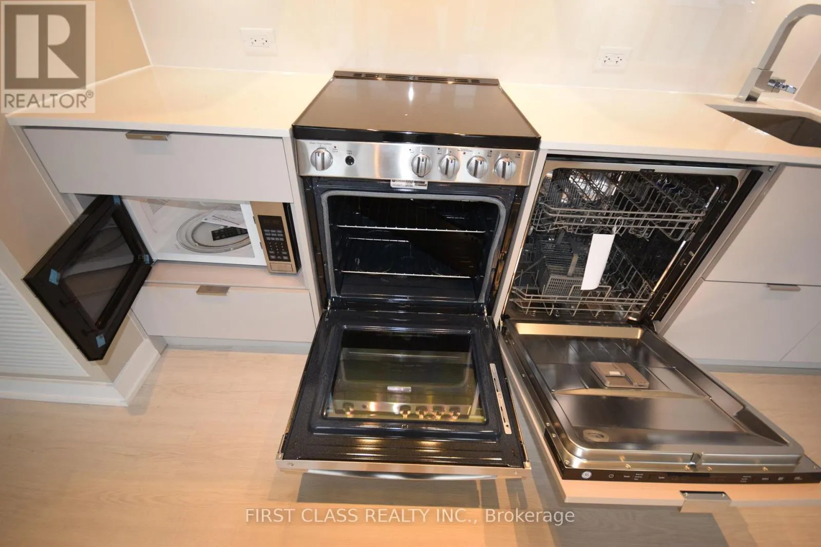 South of Burnhamthorpe/Confederation Located in the heart of Mississauga City Centre, this stunning suite features one of the largest layouts in the building, offering 891 sq. ft. of interior space plus a 228 sq. ft. balcony with multiple access points. Enjoy breathtaking, unobstructed south-facing views of Lake Ontario from the expansive balcony.This sun-filled residence boasts high ceilings that enhance the airy, open feel, while floor-to-ceiling windows bring in abundant natural light. The modern open-concept living and dining area is ideal for both relaxing and entertaining.The gourmet kitchen is equipped with quartz countertops, stainless steel appliances, an integrated refrigerator, and dishwasher. The highly functional layout offers two generously sized split bedrooms, two full bathrooms, and an additional den that can be used as a third bedroom or home office.Residents enjoy luxury amenities, including a fitness centre, saltwater pool, sports bar, movie theatre, party/event space, 24-hour security, and a children's playground. An ideal home for young professionals, students, or small families. Prime Downtown City Mississauga Location. Steps to Square One, Sheridan College, Theater, YMCA, Living Art Center, Central Bus/Go Station. Easy access to Hwy 403/401/QEW. (id:27476)