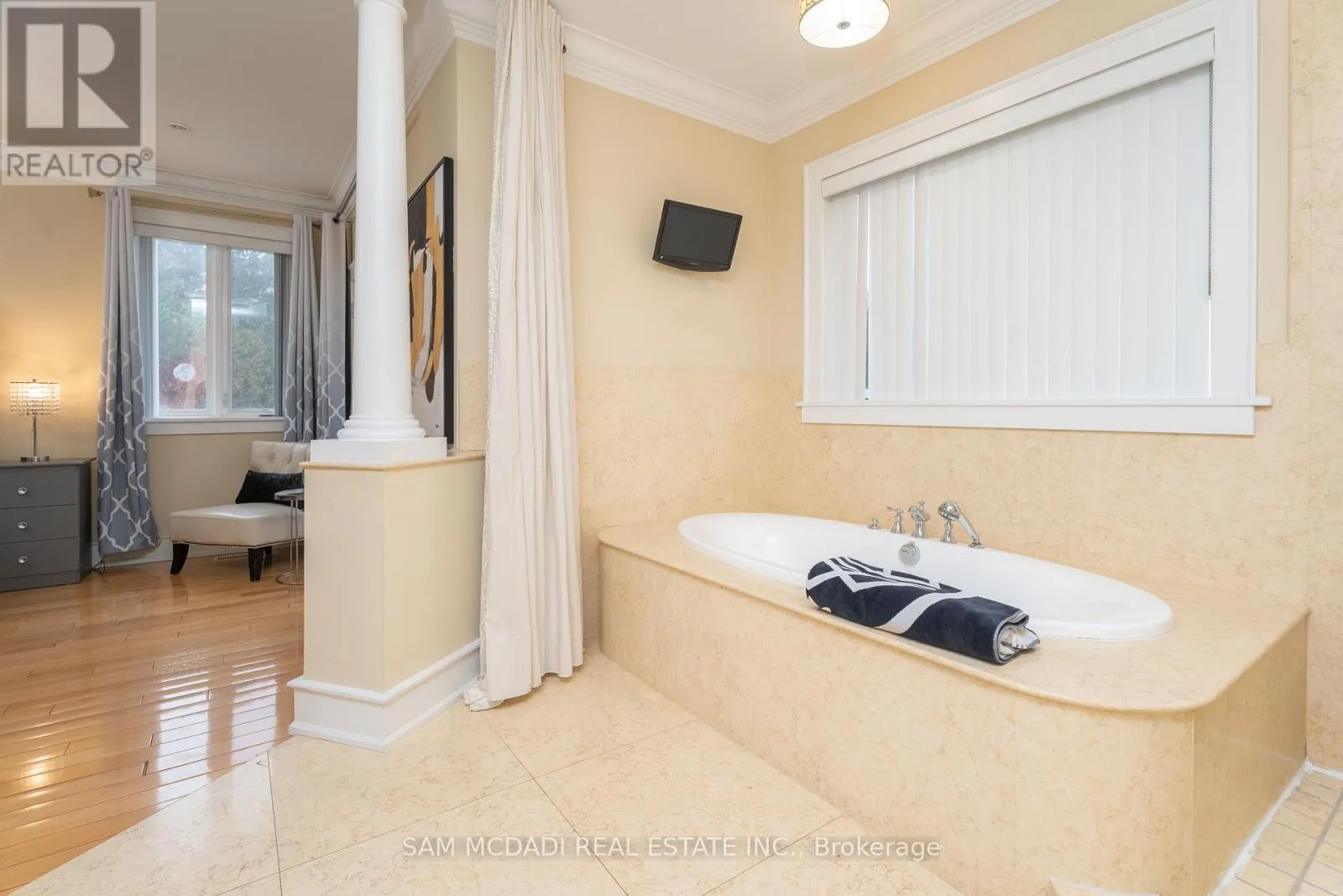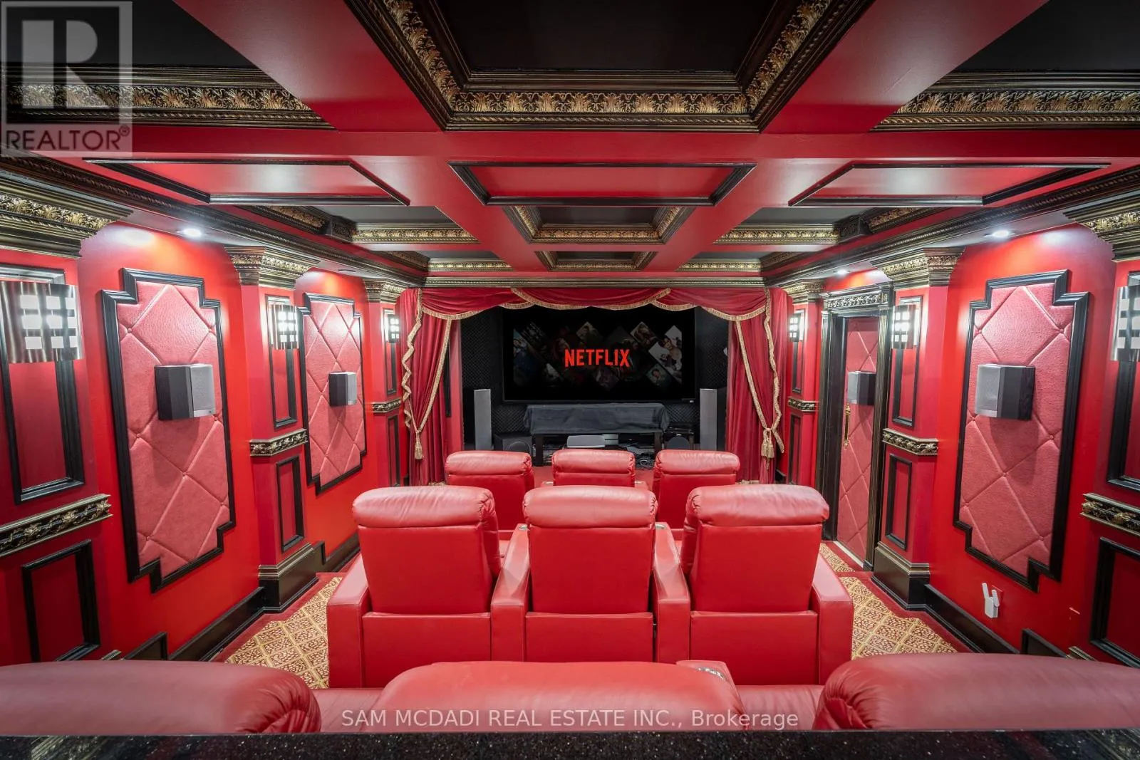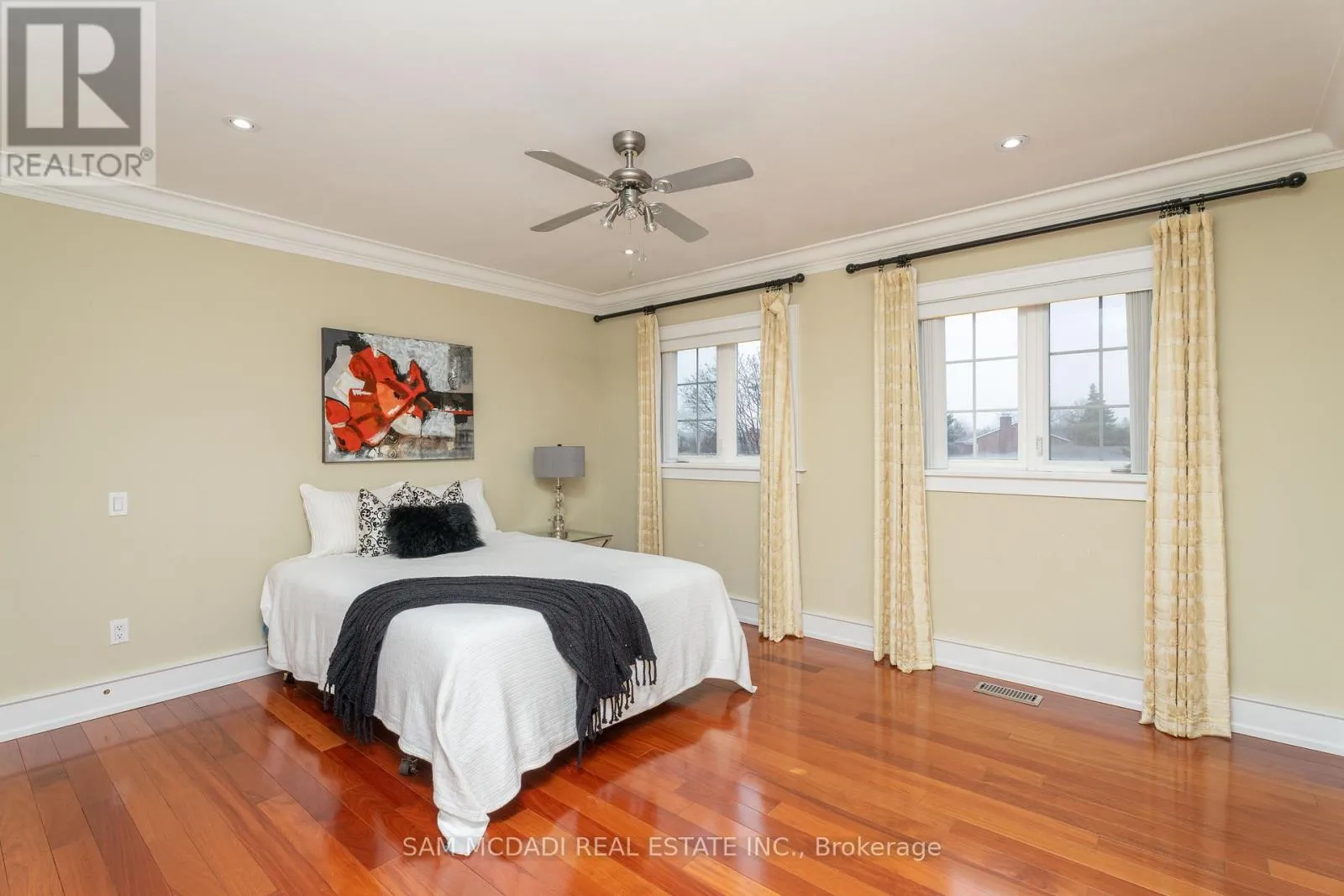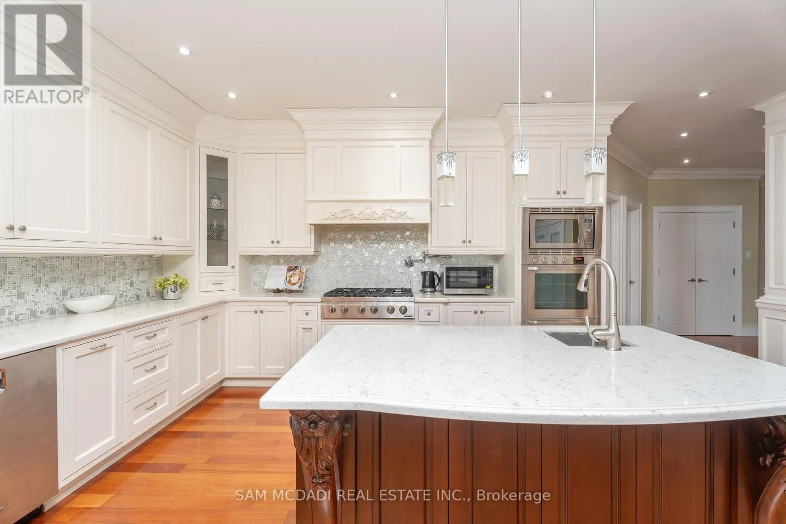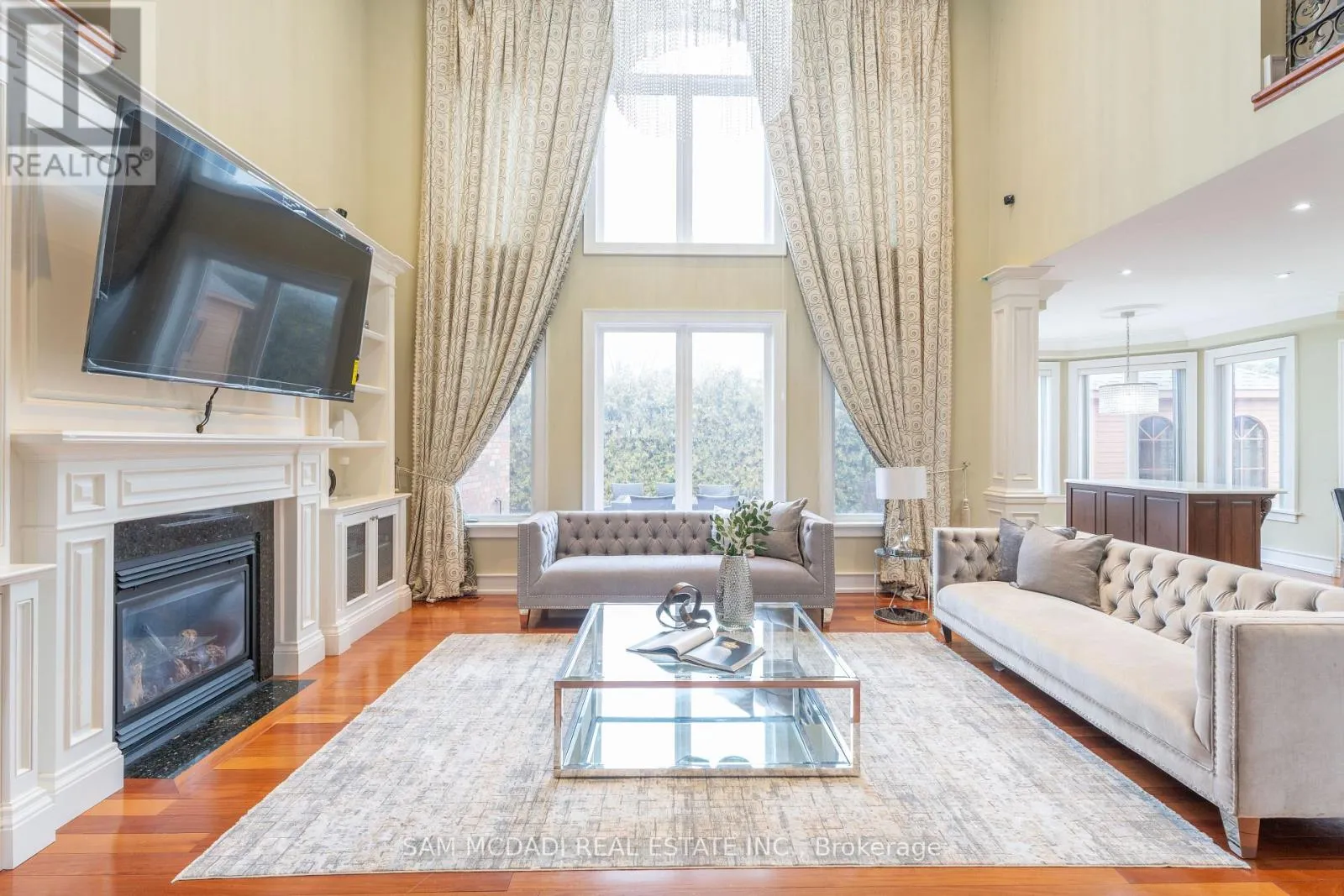 Mavis Rd/Queensway W Immerse yourself in the highly desirable Erindale community, offering close proximity to Trillium Hospital, major shopping centres, trendy restaurants, and a convenient commute to downtown Toronto via the Queen Elizabeth Way and Highway 403. This spectacular home sits on an oversized, irregularly shaped lot and features over 6,000 square feet of total living space. The open concept interior showcases expansive living areas, soaring ceiling heights with pot lights and crown moulding, cherry hardwood floors, multiple fireplaces, and more. The bespoke chef's kitchen delivers a refined culinary experience, complete with a large centre island, granite countertops, built-in appliances, and an eat-in breakfast area. The breathtaking family room features open-to-above ceilings, built-in shelving, a gas fireplace, and expansive windows that flood the space with natural light. The main level primary bedroom is thoughtfully designed with a gas fireplace, an elegant 5-piece ensuite, a large walk-in closet, and direct access to a private office. The upper level offers three additional bedrooms with ensuite or semi-ensuite bathrooms, along with a dedicated study nook featuring built-in desks and cabinetry. An exceptional investment opportunity awaits with a self-contained basement apartment that includes a kitchen, two bedrooms, two bathrooms, a large recreation area, a movie theatre, and a gym. (id:27476)