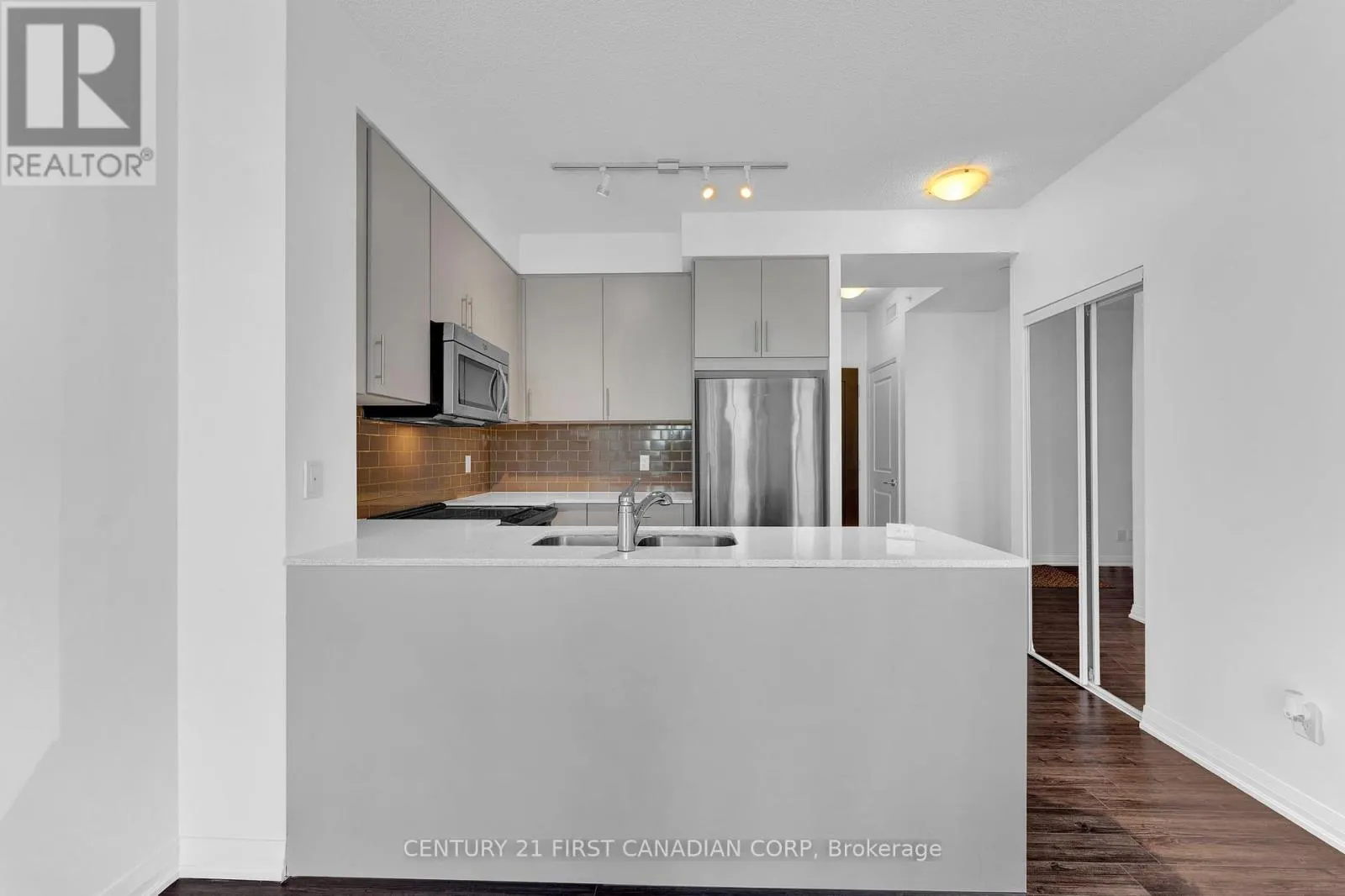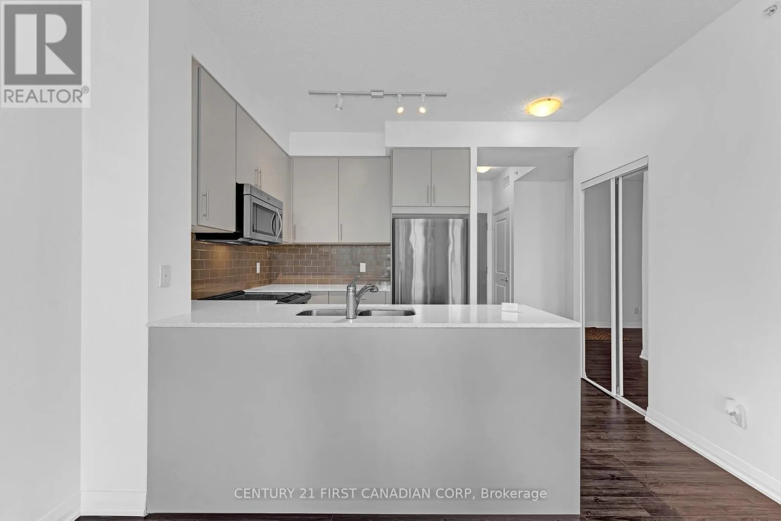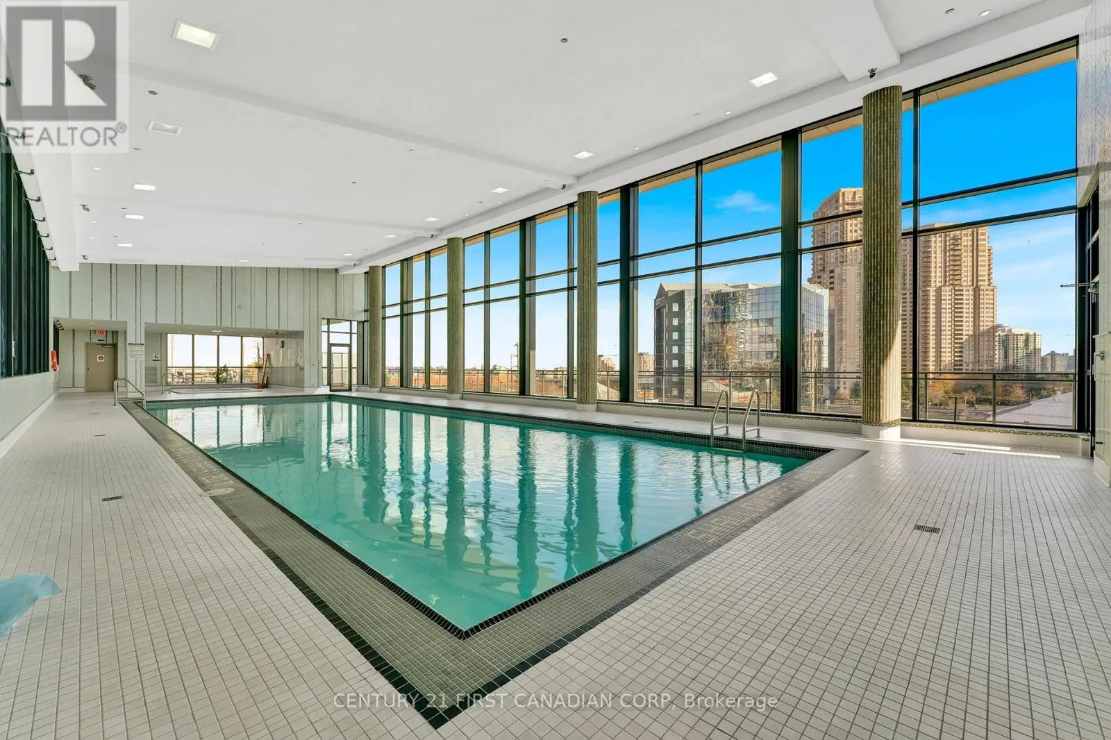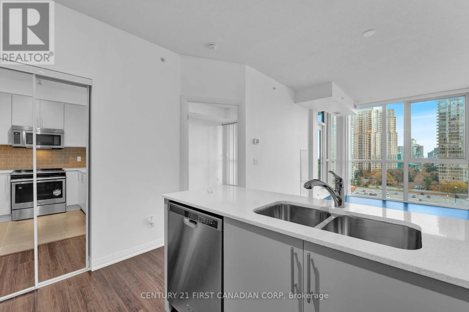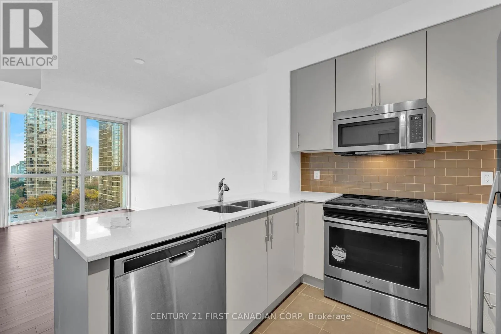 Hurontario/Eglinton Elegant 1-bedroom plus den residence featuring 9' ceilings and dramatic floor-to-ceiling windows that flood the space with natural light. This sophisticated, carpet-free suite offers a thoughtfully designed open-concept layout with a sleek modern kitchen showcasing stainless steel appliances, quartz countertops, and a designer tiled backsplash. The combined living and dining area extends seamlessly to a private balcony with a clear, unobstructed view. Includes window coverings, one locker, and one parking space. Residents enjoy premium amenities including an indoor pool, sauna, fully equipped fitness centre, and visitor parking. Ideally situated steps to shopping, dining, transit, and schools, with quick access to Hwy 403 and the future LRT-offering both convenience and elevated urban living. (id:27476)