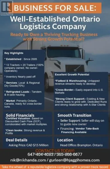 Dundas St E And Mattawa Ave A rare chance to own a profitable and well - established trucking company in Mississauga. Acquire a thriving trucking operation with over 20 years of continuous growth and an excellent reputation. This business strategically located in a high demand Mississauga industrial hub. Offer a turnkey solution for any serious buyer. Financials: The company boasts a healthy cash flow , positive financials, and a consistent track record of growth, supported by loyal, repeat clients and dedicated runs with A - class Vendors. Operational Excellence: With a satisfactory CVOR rating and an excellent insurance track record, this business runs smoothly. The sale includes a mixed fleet of flatbeds, reefers, and long - axle trucks and trailers, all well maintained. The team consists of seasoned drivers and all dispatch and operational systems are fully in place. Expansion Potential: Currently operating exclusively in Ontario, the company holds a parked US - DOT license, offering an immediate option for the new owner to expand into cross border operations. Transition & Support: The current owner is committed to a smooth transition period and is willing to stay on as an advisor to ensure continued success. To assist with the acquisition, VTB financing is also available. CIM: CBV report and a fleet list will be provided upon signing a LOI and NDA. Full Business details, financials, and a complete fleet list will be provided upon accepted offer and receipt of the deposit. (id:27476)
