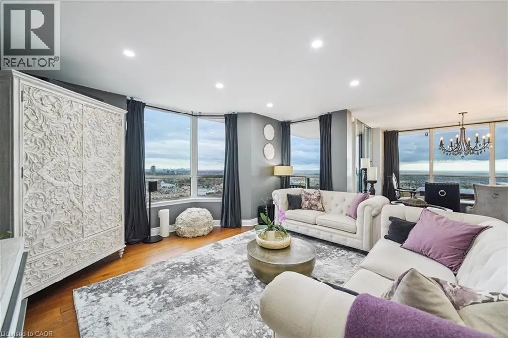 Mavis Rd/ Burnhamthorpe Rd W Set majestically high on the 26th floor of the Phoenix Condos, this rarely offered corner suite offers 1,280 sq. ft. of elegant living space with panoramic, unobstructed city and lake views. Featuring southeast facing exposure with a private balcony, this fully renovated residence combines style and functionality in a prime location just minutes from Square One, GO Transit, major highways, shopping, schools, and parks. Beautifully appointed interior upgrades include walnut-stained engineered hardwood floors, extra-deep baseboards, smooth ceilings and pot lights (2024). The modern kitchen is equipped with high-end Fisher & Paykel, Bosch, Sharp and Asko appliances, custom cabinetry, quartz counters, and a hidden stackable washer/dryer. The inviting open-concept layout separates two spacious bedrooms for maximum privacy, each offering walk-in or built-in California Closets. Two fully renovated bathrooms (2021) feature premium fixtures and spa-inspired finishes. Additional highlights include a full mirrored entry wall (2021), custom window coverings (2024), gallery-style hallway, two furnaces (with new fan coil insulation 2024), and two owned parking spaces. Residents enjoy resort-style amenities including a 24-hour concierge, indoor whirlpool, sauna, fitness centre, tennis court, squash court, party room, library, and landscaped outdoor spaces. (id:27476)