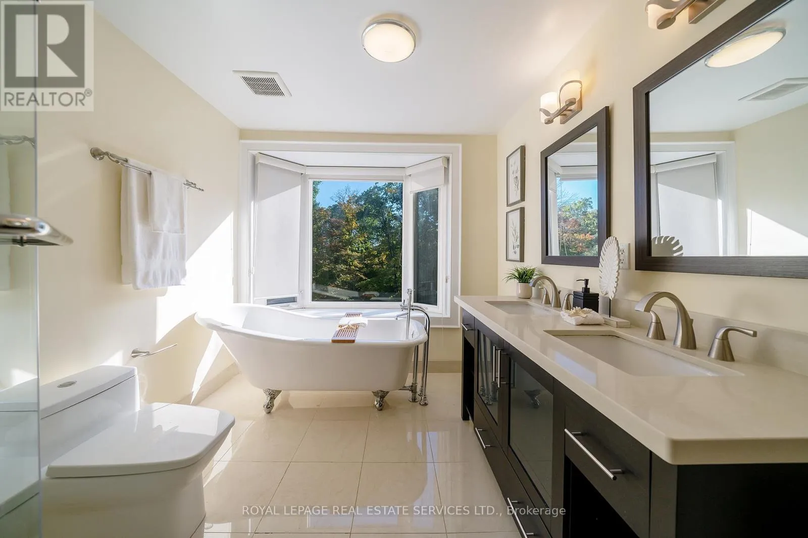 Cross Streets: Credit Height & The Credit Woodlands. ** Directions: Dundas St W- The Credit Woodlands- Credit Heights. Grandly renovated 4-bedroom detached home with walkout basement on a rare 75' x 229' ravine lot in Mississauga's prestigious Credit Woodlands, featuring a saltwater pool, pond, and gazebo backing directly onto the Credit River. This luxury family home is within walking distance to 222-acre Erindale Park and the scenic Culham Trail, minutes from Mississauga Golf and Country Club, and offers quick access to major highways and GO Transit for easy commuting to Toronto and Hamilton. A mature, tree-lined street leads to a deep double driveway accommodating 8 cars plus a 2-car garage. An interlocking stone walkway and covered front veranda overlook perennial gardens with sprinkler system. The backyard is a private oasis with a massive deck, covered terrace, terraced gardens, custom saltwater pool with waterfall, serene pond with sheer descent waterfall, private gazebo, and expansive green space framed by ravine views. Recent upgrades include freshly painted interior, deck and gazebo, new furnace, air conditioner, pool heater and cover, some updated main floor windows and new backyard fencing (2025), plus a newer roof. Inside, hardwood flooring, crown mouldings, pot lighting, upgraded trims, two fireplaces, and three walkouts enhance sophistication. The skylit oak staircase opens to elegant living and dining rooms, a family room with fireplace, and a chef's kitchen with custom cabinetry, stone counters, stainless steel appliances, large island, and oversized breakfast room with walkout to deck. Upstairs, a sitting room, 2 bathrooms, and 4 spacious bedrooms are available, including a refined primary suite with a spa-like 5-piece ensuite featuring a claw-foot tub and a glass shower. The finished walkout lower level includes a recreation room with fireplace, coffered ceiling and built-ins, media/entertainment area, modern 3-piece bath, and 2 walkouts to the terrace overlooking the Credit River ravine. (id:27476)