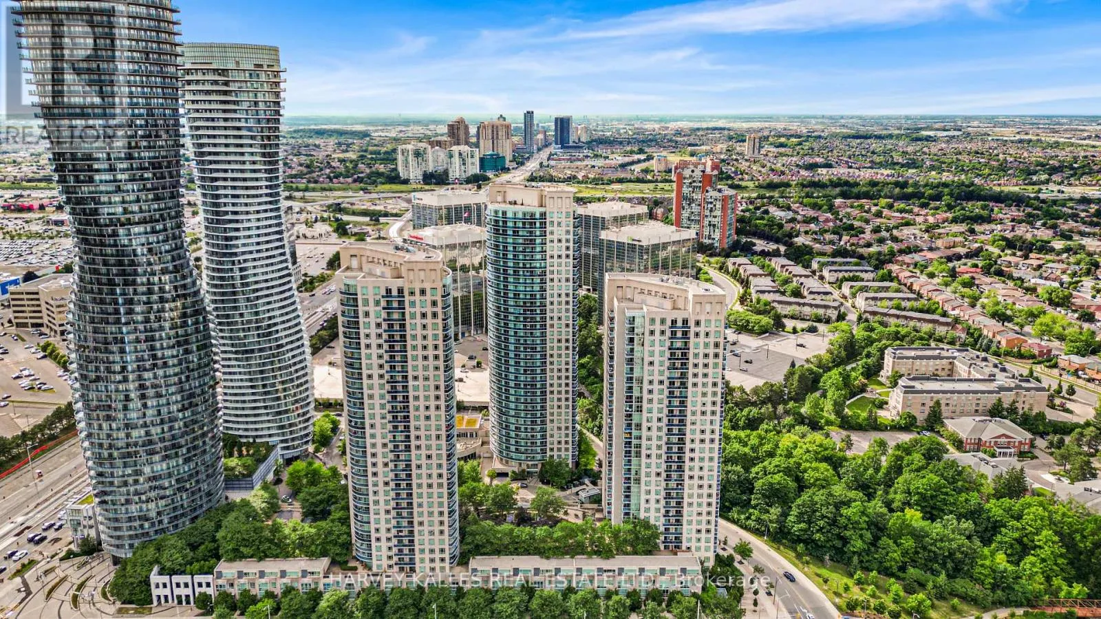Absolute Ave and Hurontario St. Welcome to this bright and spacious corner unit 2-bedroom, 2-full bathroom condo at the iconic 80 Absolute Ave, offering a rare and highly sought-after 2-car tandem parking plus a private locker and open balcony. Water and Heat Included in Maintenance. This well-designed split-bedroom layout provides excellent flow and privacy, ideal for professionals, couples, or small families. Floor-to-ceiling windows invite natural light and offer tranquil views of the lush green canopy, creating a serene backdrop year-round. This unit has been recently renovated with new flooring, fresh paint and updates made to the bathrooms and new appliances (dishwasher and stove). Located in the heart of downtown Mississauga, you're just minutes from Square One Shopping Centre, fine dining, entertainment, and the future LRT line, with easy access to HWY 403, 401, and QEW perfect for commuters. Residents of this award-winning building enjoy unparalleled amenities, including indoor and outdoor pools, a full fitness centre, squash and basketball courts, theatre room, running track, guest suites, party rooms, 24-hour concierge, and more. Only a handful of units in this building offer a 2-car tandem parking space plus your own private locker directly behind your parking spaces. This unit faces Absolute Ave and does not face the busy street, offering quiet and relaxing views from your private balcony. Don't miss your chance to live in one of Mississauga's most prestigious and amenity-rich communities! (id:27476)