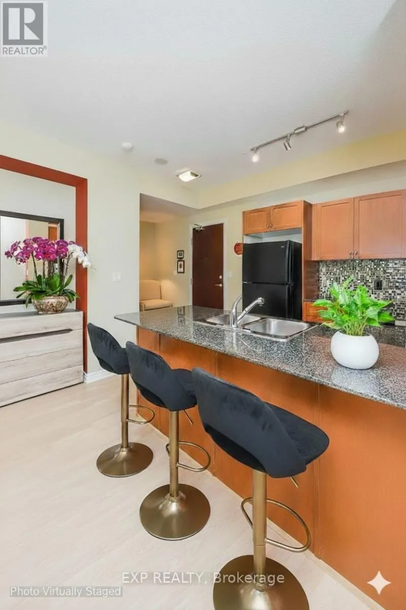 Cross Streets: Rathburn/Dixie. ** Directions: West of Dixie. Live in Luxury at The Prestigious Capri! Step into this stunning, freshly painted 1-Bedroom + Den bright Condo and experience upscale living with breathtaking, unobstructed views of the Toronto skyline right from your private balcony! This sophisticated suite boasts soaring 9-foot ceilings, an open-concept layout, and sun-drenched spaces that make every day feel bright and inviting. The modern kitchen shines with granite countertops, a stylish breakfast bar, and plenty of room to cook, dine, and entertain in style. Enjoy the ultimate in convenience with ensuite laundry, underground parking - no more winter snow scraping! Plus, ALL utilities are included - no surprise extra bills, just worry-free living! Resort-Style Amenities Include: Sparkling indoor pool, relaxing hot tub, and sauna, cozy library and billiards room, state-of-the-art fitness center, elegant party room with walkout to a lush outdoor patio and a safe, kid-friendly playground!! Prime Mississauga Location! Nestled in the heart of the city, you're steps from top-rated schools, world-class shopping, and seamless public transit. Commuting is effortless with quick access to Highways 401, 403, 427, QEW, and the GO Station. Indulge in the area's best dining, entertainment, and recreation - all just minutes from your doorstep! Don't miss out! Schedule your viewing today!!! *Note: 5 photos are virtually staged (id:27476)