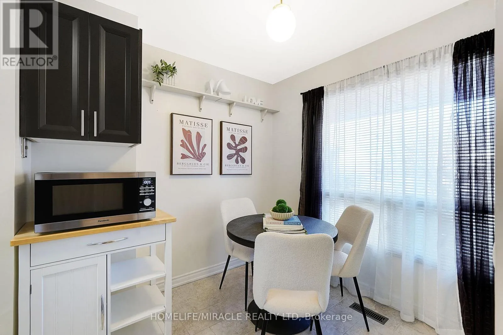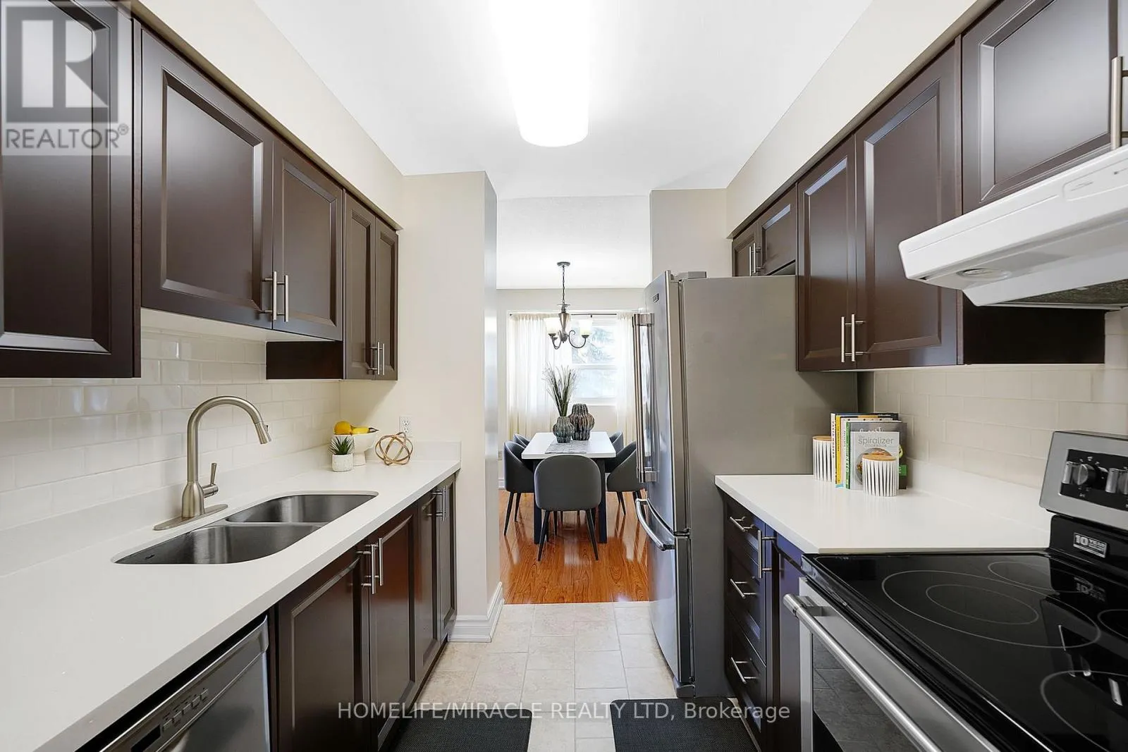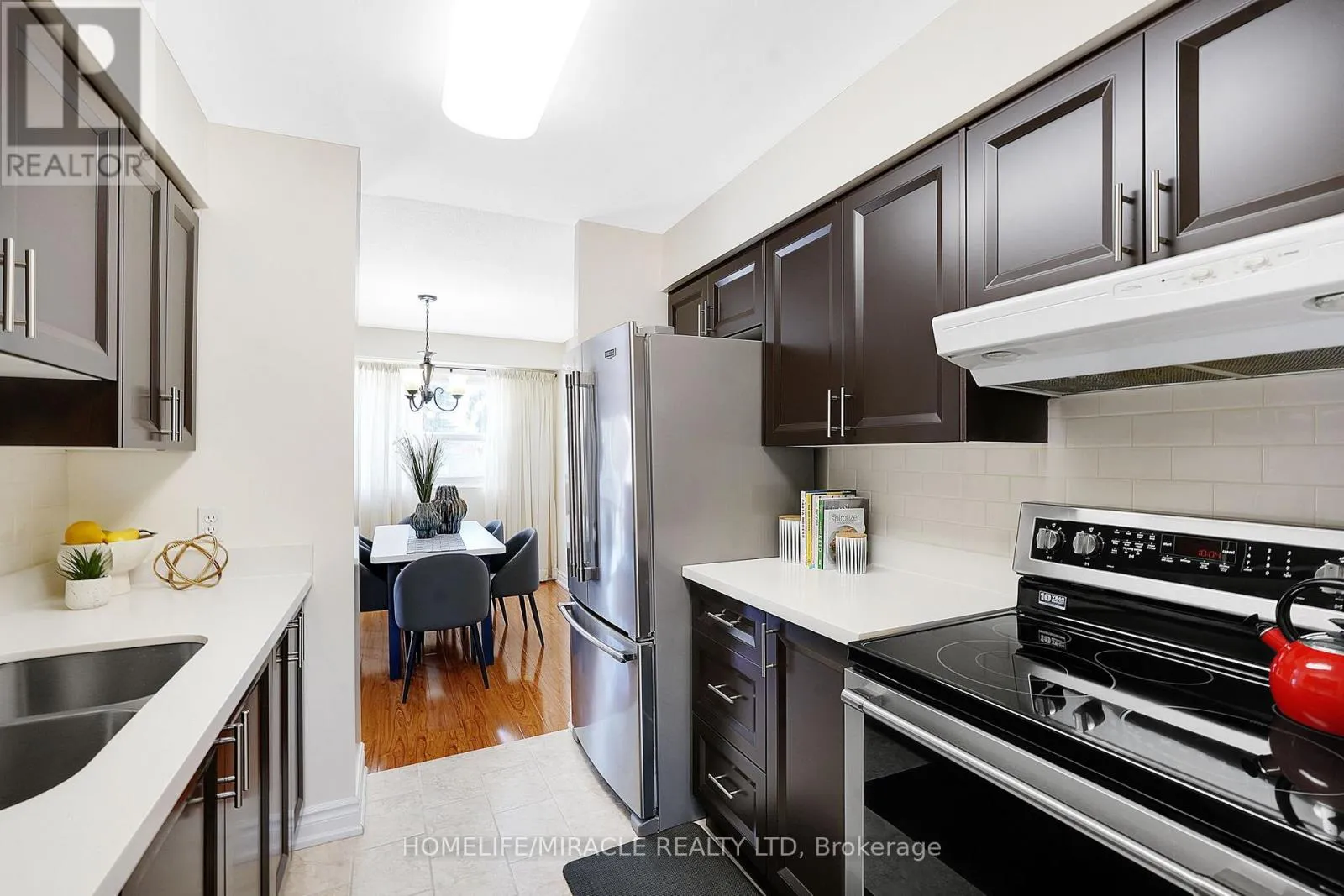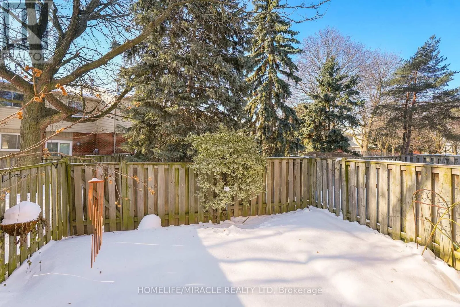 Cawthra Rd & Rathburn Rd E Renovated condo townhouse located on a quiet cul-de-sac in Forestview Village, a prime Mississauga location. This home offers 3 spacious bedrooms and a separate dining room overlooking the living room with a wood-burning fireplace. Sliding doors lead to a private fenced backyard, ideal for relaxing or entertaining. The kitchen was renovated in 2018 with updated kitchen cabinets, countertops, backsplash, and exhaust hood, and features a pantry and breakfast area. Laminate flooring throughout the main and second levels enhances the modern appeal of the home. Energy-efficient upgraded windows throughout and an upgraded patio door (2019). The finished basement, complete with pot lights, provides additional versatile living space. Conveniently located minutes to Highways 403 & 401, Square One, top-rated schools, shopping areas, transit, parks, restaurants, and everyday amenities, this home offers both lifestyle and convenience. The well-maintained, family-friendly complex features ample visitor parking and a true sense of community. Meticulously kept, thoughtfully upgraded, and full of warmth, this stunning home is perfect for those seeking comfort, functionality, and timeless charm. (id:27476)