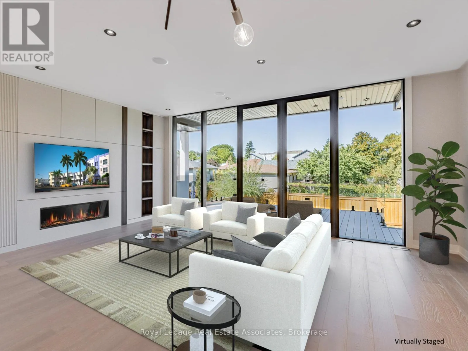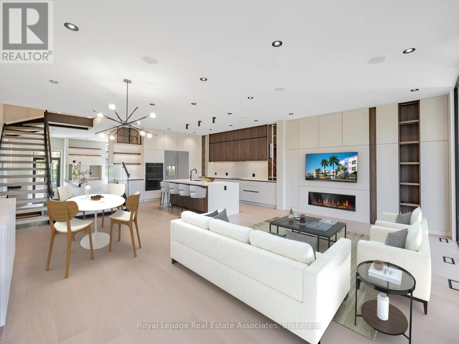 Alexandra Ave/ Halliday Ave Luxury, perfected. A Montbeck Developments masterpiece yours to move into today! This masterfully designed open-concept home exudes sophistication with white oak flooring, soaring ceiling heights, and floor-to-ceiling windows that flood the interiors with natural light. Seamless indoor/outdoor living is achieved with the living room, dining room, and kitchen each opening to a partially covered balcony patio perfect for year-round enjoyment. At the heart of the home, the bespoke designer kitchen makes a bold statement in both form and function. Outfitted with top-tier Fisher & Paykel appliances, exquisite quartz countertops with full-height backsplash, and an oversized waterfall island, its an entertainers dream. An abundance of thoughtfully integrated storage enhances both style and practicality. The adjoining living and dining spaces radiate sophistication and warmth, featuring custom millwork and a sleek linear electric fireplace that serves as a striking focal point. The primary suite boasts a spa-inspired ensuite with soaker tub, glass shower, dual-sink vanity, and a fully customized walk-in closet with illuminated built-ins and tailored cabinetry. Three additional bedrooms each offer custom desks, built-in closets, and stylish ensuites with designer finishes. The finished lower level expands the living space with a large family/recreation room, 3-piece bath, radiant heated floors, a wet bar, and a rough-in for a home theatre or fitness studio. Additional features include a versatile front room for office or formal living, integrated ceiling speakers, and an attached garage with a striking black-tinted glass door. (id:27476)