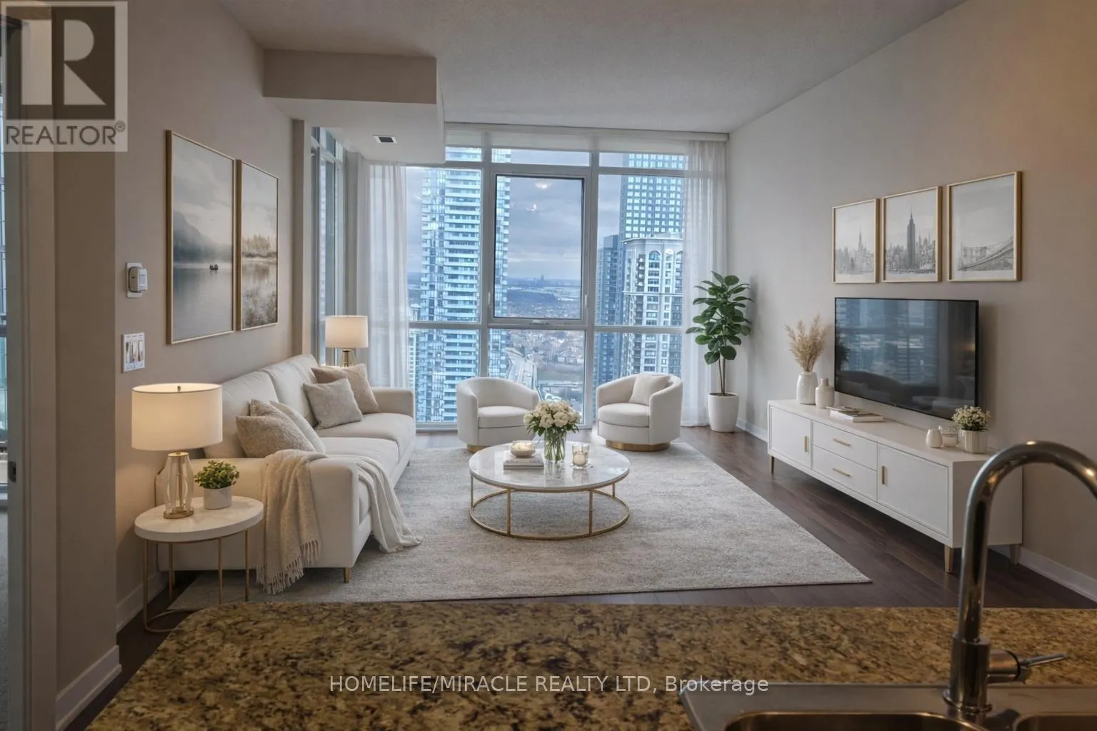 Burnhamthorpe / Confederation Welcome to this bright and spacious Beautiful Apartment on premium level, Consists of 1 Bedroom + Generous size Den, could be used as a home office or a 2nd bed. Freshly renovated with new paint, Ensuite washer, dryer, and full washroom. Water and A/C are included, tenant only pays for electricity (Alectra). Compared to Other Buildings paying around $200/month, here it's only about $50/month. This unit is located in the heart of Mississauga's Square One area! Above Starbucks!! Right Across Mississauga Library & YMCA, Featuring an open-concept layout with a combined living and dining room, this well-kept unit boasts soaring 9-foot ceilings and upgraded finishes. The modern kitchen is equipped with well maintained appliances and quartz countertops. The versatile den is large enough to accommodate a double bed or serve as a functional home office. Enjoy the convenience of ensuite laundry with a washer and dryer, an upgraded bathroom, and a walk-out balcony with beautiful city views. Steps to Square One, Sheridan College, Celebration Square, public transit, Central Library, and all major highways. Don't miss this incredible opportunity amazing value and location! Includes One Parking and A Locker. 24 Hours Concierge, building amenities include gym and recreation room. (id:27476)