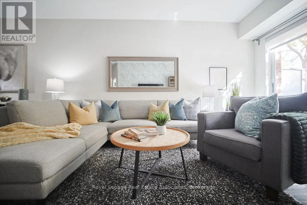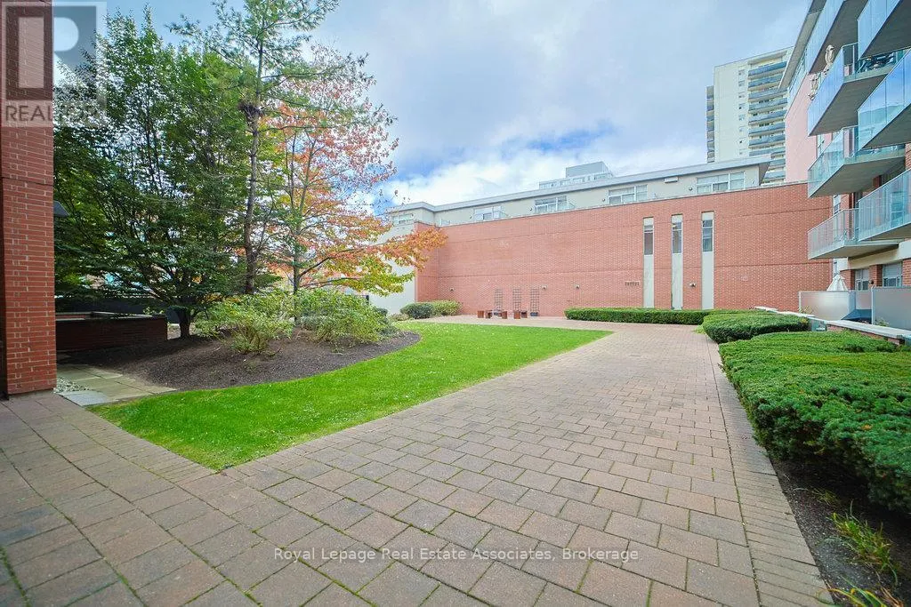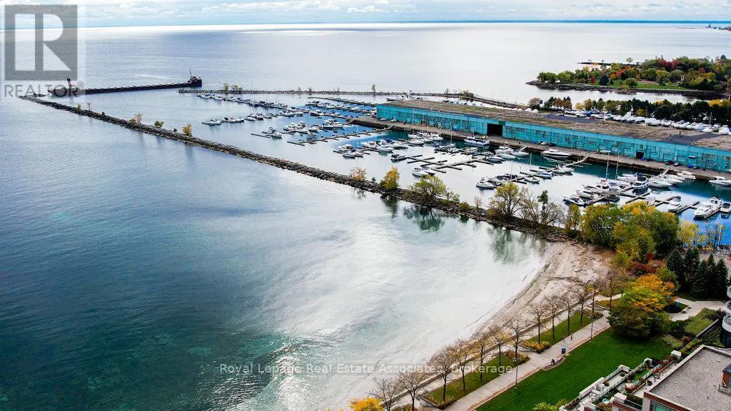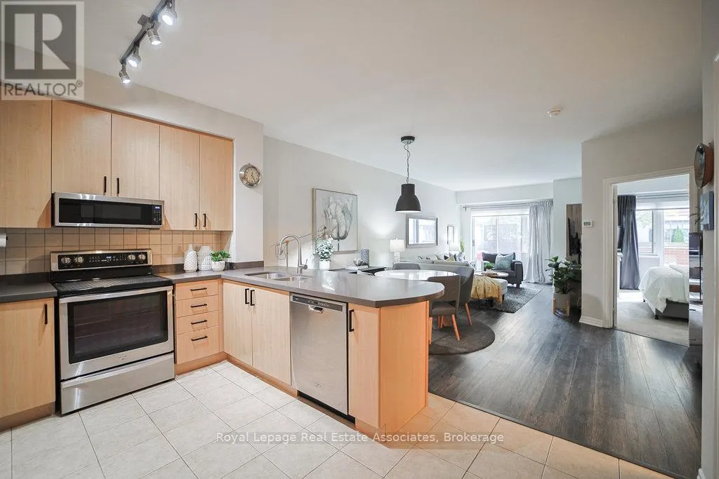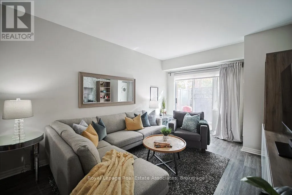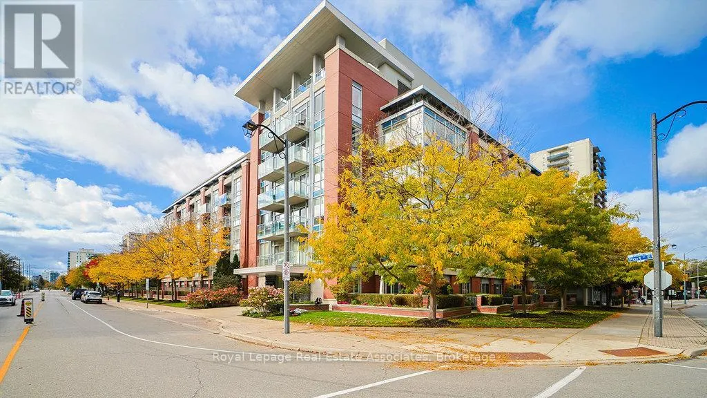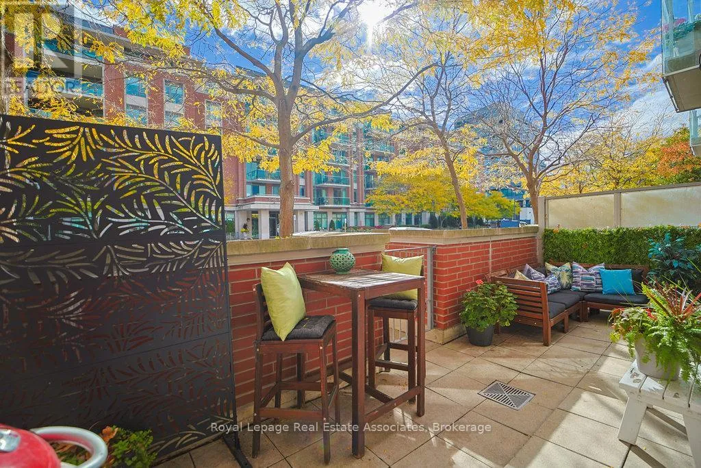 Port Street East and St.Lawrence Drive Welcome to effortless main floor living in the heart of Port Credit. This beautifully designed 1 bedroom plus den suite offers 903 sq. ft. of stylish, open concept space and the rare luxury of a true walk out terrace, not a balcony. The walk out terrace is ideal for enjoying morning coffee, gardening, and summer BBQing while creating your own private outdoor retreat.The thoughtfully designed kitchen showcases sleek grey quartz countertops, ample prep space, and a seamless flow into the spacious living and dining area, ideal for entertaining or relaxing at home. The generous primary bedroom features a walk in closet with custom organizers, while the separate den provides versatile space for a home office, guest area, or cozy reading nook.A standout feature is the walk in laundry room, offering exceptional storage and functionality rarely found in condo living. Even the storage locker is conveniently located on the same ground level for easy access.Perfectly positioned just steps to the gym, lobby, and courtyard, this suite also offers added privacy with no neighbours on one side. Skip the elevator and step directly outside to enjoy the fresh lake air.Live just moments from the waterfront, marina, boutique shops, and vibrant restaurants that make Port Credit one of Mississauga's most desirable lakeside communities. (id:27476)