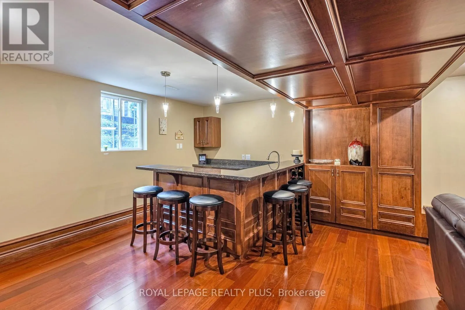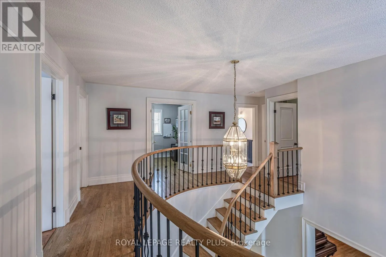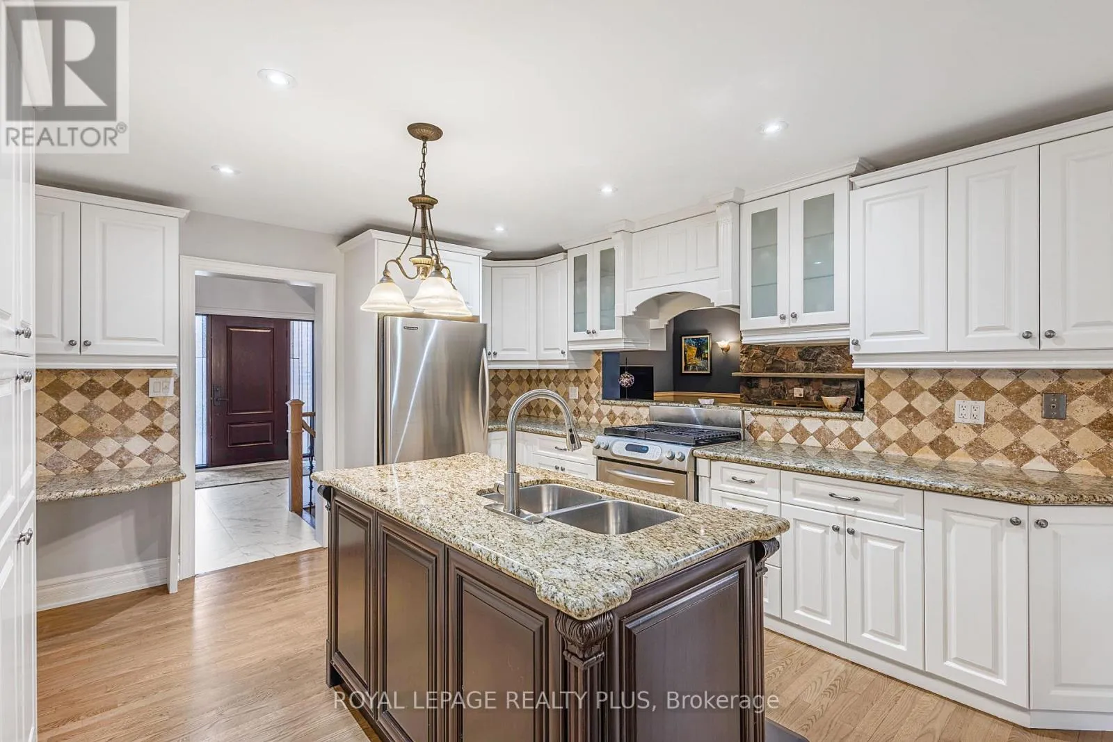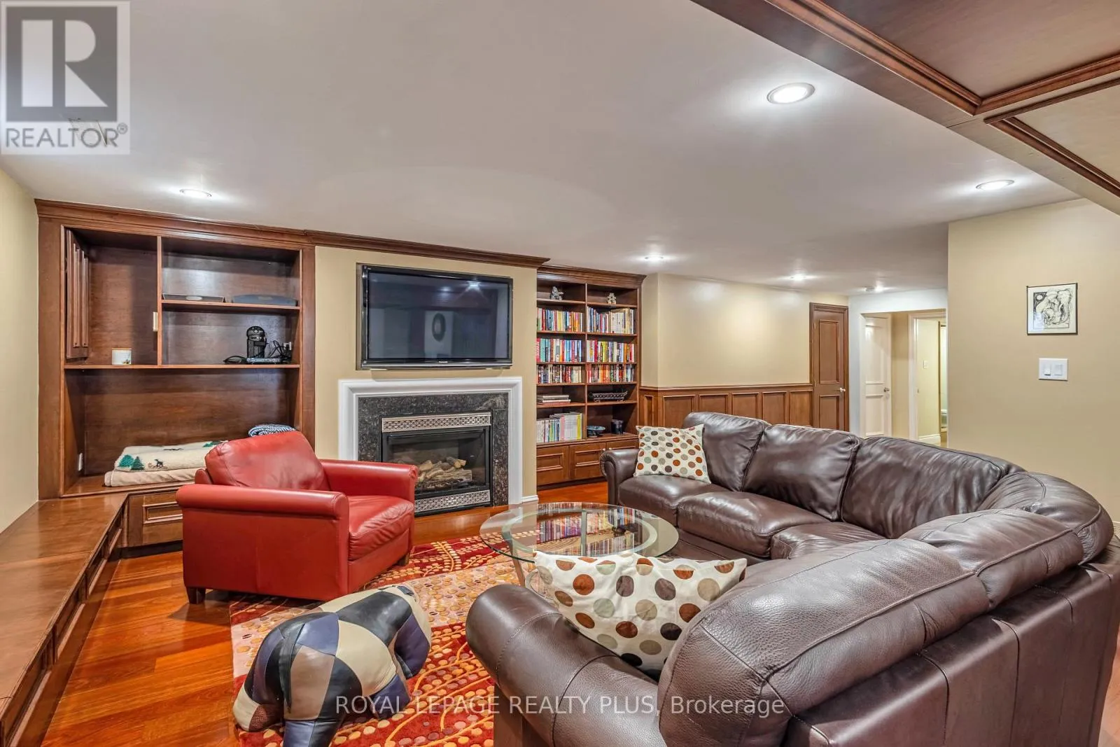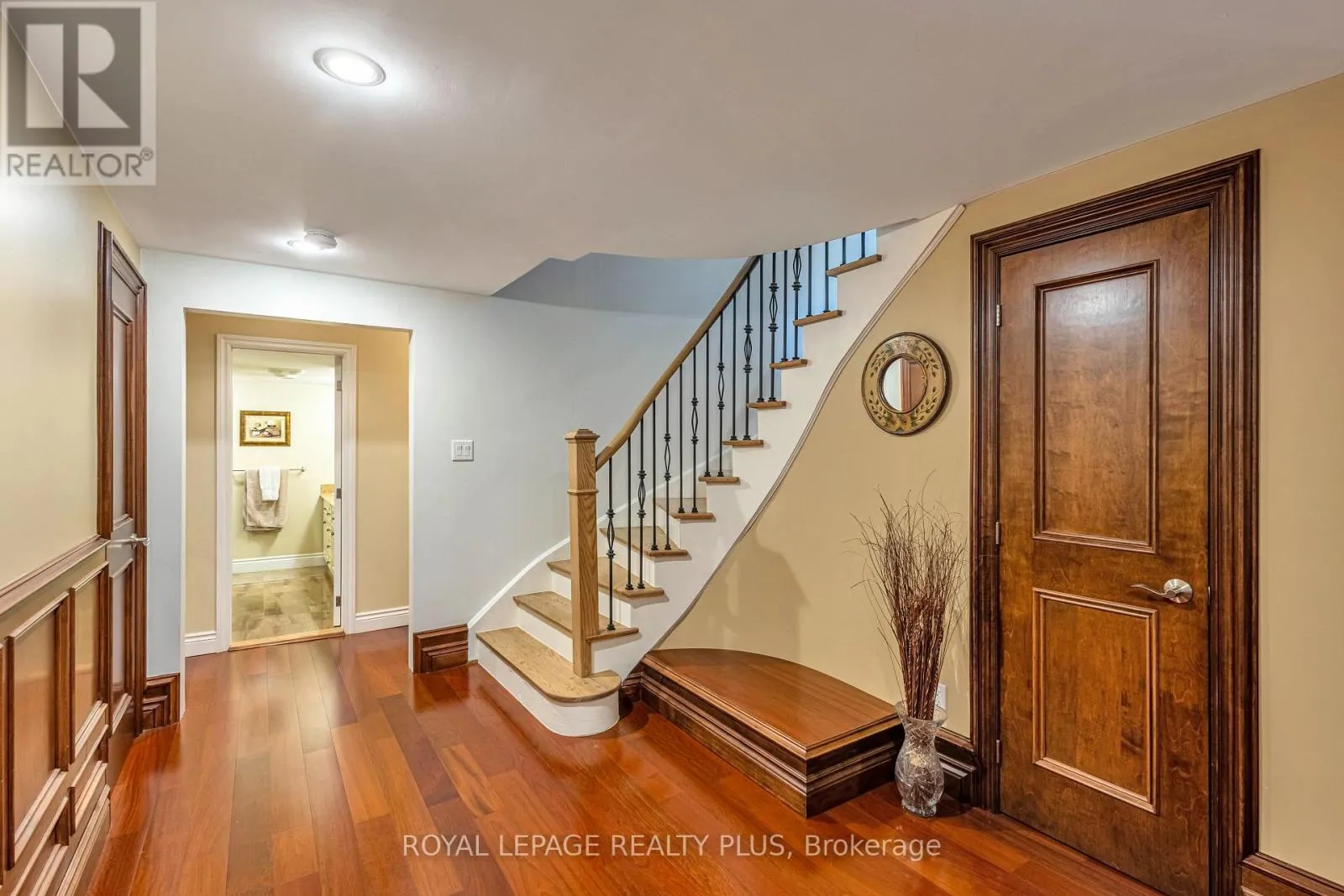 Cross Streets: Burnhamthorpe & Mississauga Road. ** Directions: Mississauga Road to Bridlepath. Welcome to prestigious Bridlepath Estates, one of Mississauga's most coveted enclaves. Set on a beautifully landscaped 62.53' x 120.01' lot, this exceptional family home offers timeless elegance, generous principal rooms and a refined layout on a quiet, tree-lined street, moments to top-rated schools, U of T Erindale, Credit River trails, GO Transit and Hwys 407 & 403.Thoughtfully updated and meticulously maintained, the home showcases quality finishes throughout. A welcoming foyer with porcelain tile leads to elegant living and dining spaces with hardwood floors, crown moulding and a gas fireplace. The inviting family room features a dramatic floor to ceiling brick fireplace and rich Tigerwood flooring. The gourmet kitchen is designed for both everyday living and entertaining, with granite countertops, stainless steel appliances, a spacious breakfast area and walkout to a stunning 2-level composite deck, and a kitchen to fam room pass-through counter. Upstairs, 5 bedrooms provide exceptional flexibility for growing families, home office or fitness needs. The primary suite is a true retreat, complete with walk-in closet and a luxurious 6-piece ensuite with heated floors, jet tub and marble countertop. The professionally finished basement extends the living space with an additional bedroom, an additional office, a 3 piece bathroom, and a huge rec/family room with stylish wet bar, built-in bookcases and built-in storage. Step outside to your private backyard sanctuary with mature trees, firepit, bubbling rock water feature, barnwood shed with electricity, gazebo with hot tub rough-in and beautiful barnwood fencing. Interlock driveway and walkway, parking for 4 on the driveway and 2 more parking spaces in double garage automatic electronic openers and keypad entry . Inground sprinklers complete the setting. Major upgrades include newer heat pump, furnace & CAC (2024), and a full Timberline HD (50y) roofing system (2015). 200 AMP service, owned tankless water heater. (id:27476)