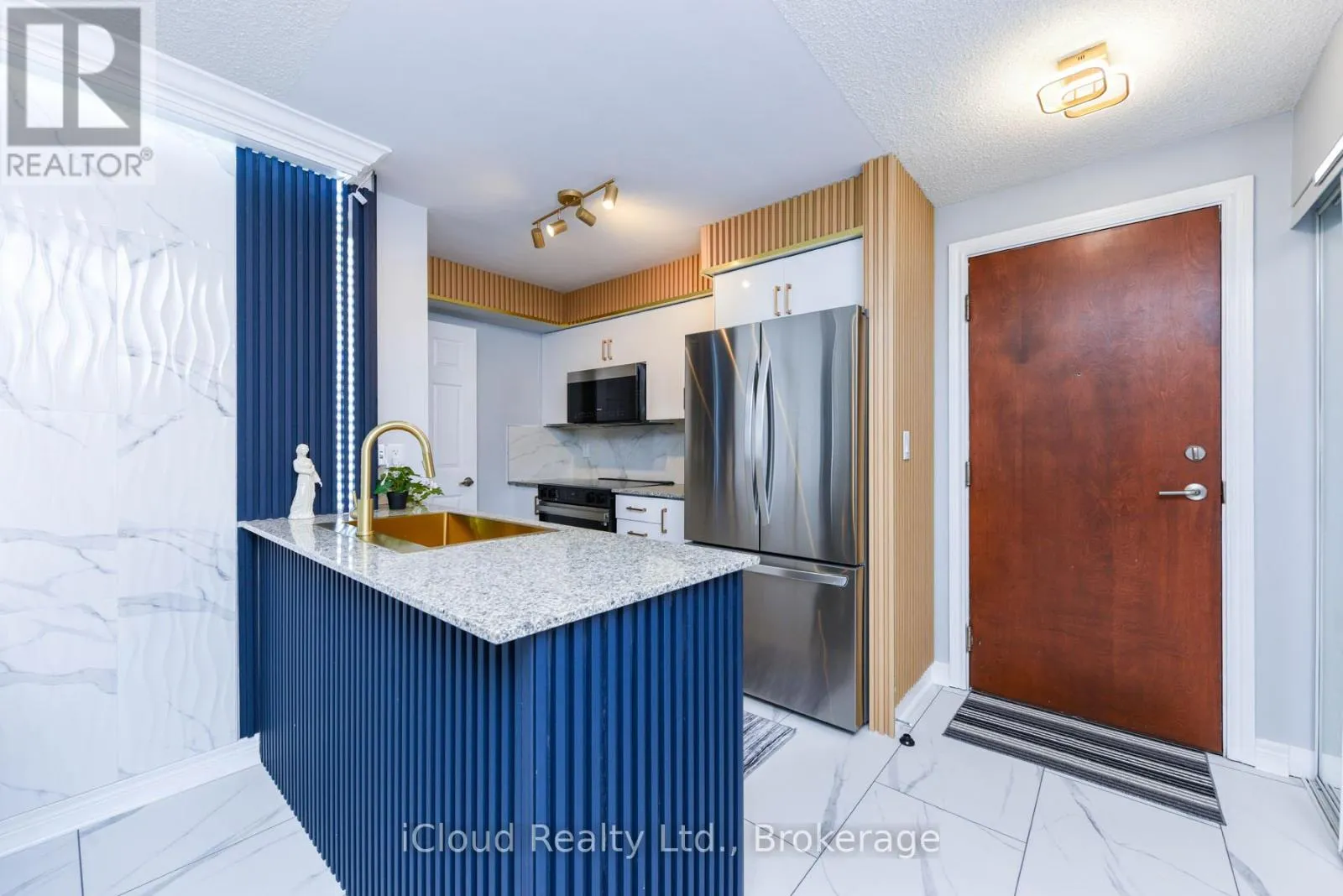 Cross Streets: Burnhamthorpe/Living Arts. ** Directions: West on Burnhamthorpe Rd, South on Living Arts. "Seeing-is-Believing"!!! Masterfully renovated to highest standards. No detail has been left unattended. New marble-look vinyl flooring throughout. LIVING/DINING: Crown moulding all around with remote-controlled diffused LED lighting for relaxing ambiance. Textured marble-look accent wall to the right, wainscotting encrusted wall to the left. A specially designed TV wall-panel surrounded by LED strip lighting with built-in console and full motion TV mount and navy blue fluted panels. KITCHEN: Brand new white melamine kitchen cabinets with soft-close doors, elegant golden handles and under-cabinet motion sensor lights. All new high-end LG/Samsung major appliances, over the range Panasonic microwave with built-in exhaust. Large modern rectangular gold-look metal kitchen sink with golden gooseneck faucet. Faux wood fluted panels along the ceiling and right wall. PRIMARY BEDROOM: Artistic head-board wall has black granite-look panel in the middle with fluted panels on either side, walk-in closet with cupboard. Attached ensuite washroom has moulded one-piece toilet and gold accent sink faucet. 2nd BEDROOM: Has fluted side panels and marble-look panel under the window. DEN: (a separate room with door, can be used as a bedroom)) : has backwall with part fluted panels and part black granite look panel. MAIN WASHROOM: Has white quartz vanity with gold/black designer faucet, molded one-piece toilet, 2 towel bars and a glass enclosed shower stall. All 3 bedrooms have exquisite LED ceiling lights with remote controls. (id:27476)