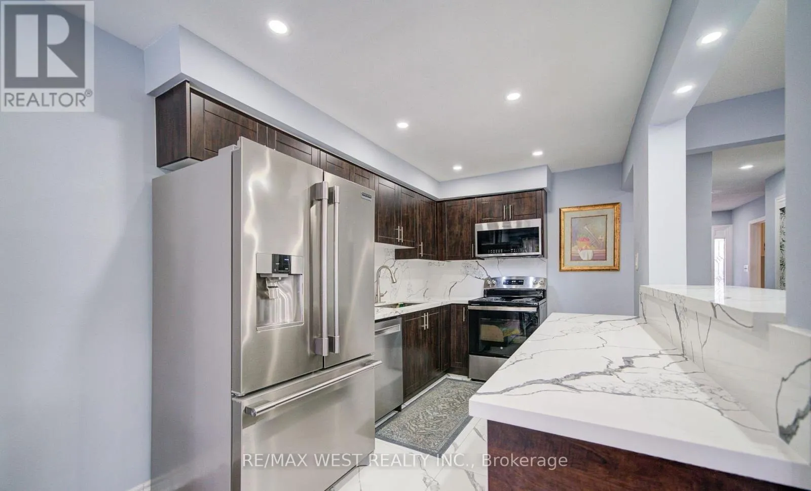 Brandon Gate Dr/ Goreway Dr Beautiful end-unit townhouse in Malton with low maintenance fees! This spacious home features laminate flooring and pot lights throughout the main floor, a stunning renovated kitchen with granite countertops and stainless steel appliances, and a functional layout with 4 bedrooms and 3 washrooms. Heated garage and private backyard add to the comfort and convenience. Finished basement includes a bedroom, bathroom, and kitchen-ideal for extended family or potential rental income. Conveniently located close to transit, major highways, and shopping (id:27476)