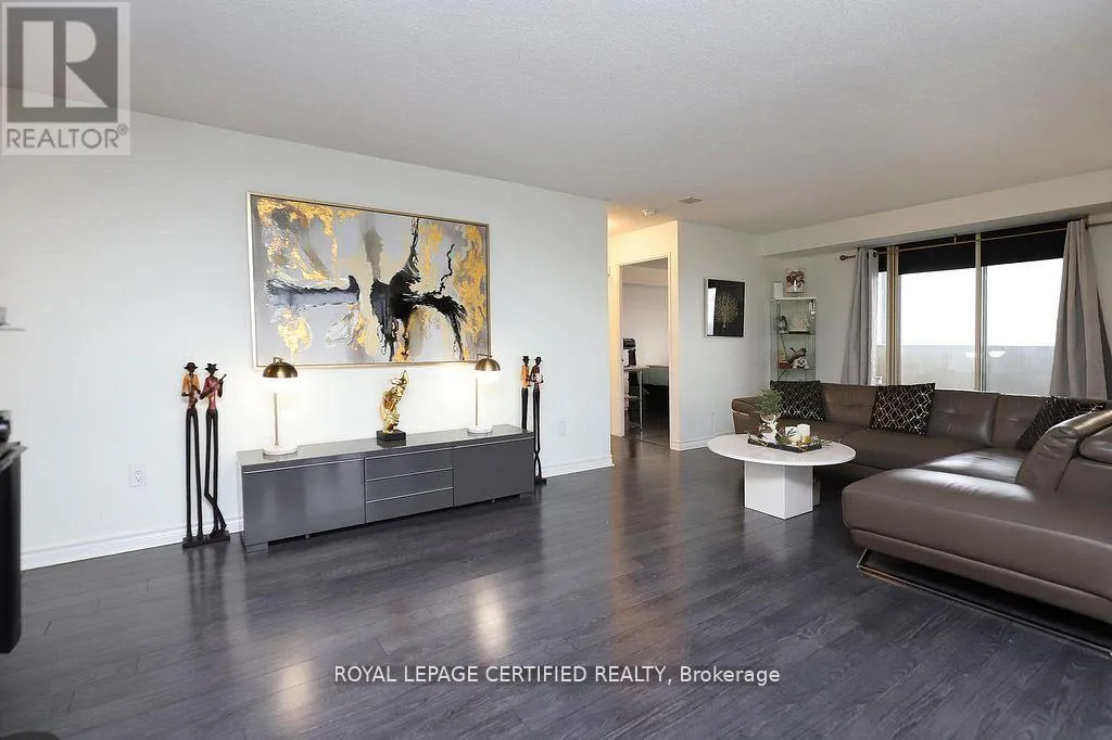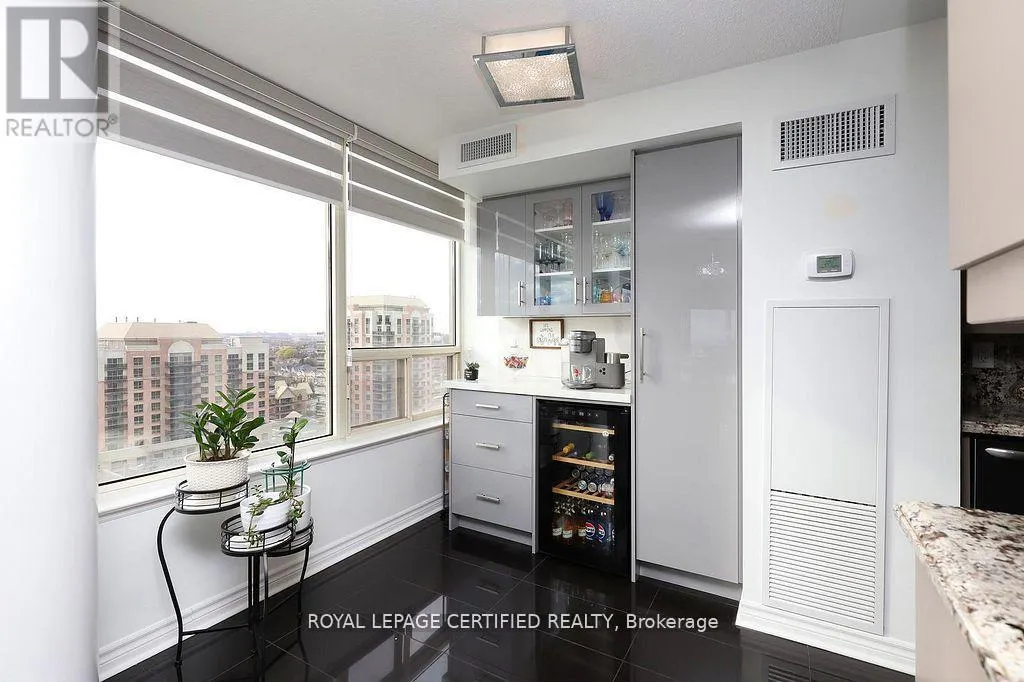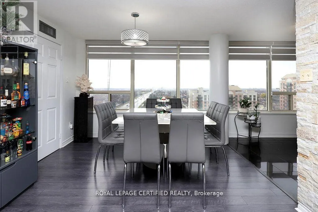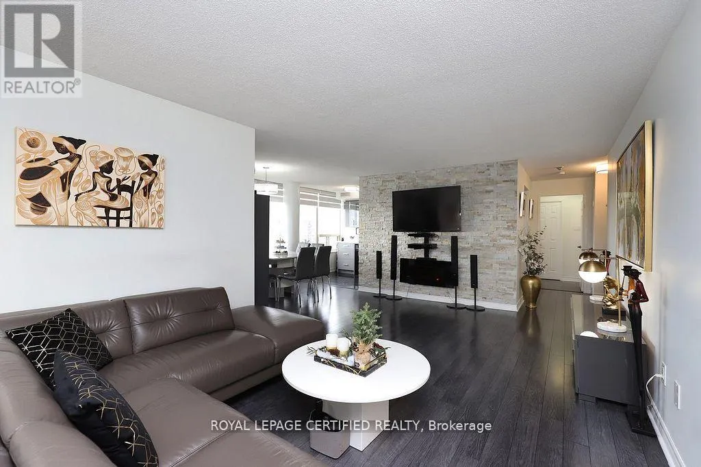 Cross Streets: Eglinton/Mavis. ** Directions: google map. Welcome to this Beautiful Sun-filled 1400+ sq ft Condo with 180 degree views boasting 2+1 bedrooms and 2 bathrooms! This meticulously kept condo features a designer kitchen that highlights granite counter tops with granite full height backsplash, a water filtration system, and a custom designed coffee bar & wine fridge with room for a breakfast area! The dinning room has an amazing view of the west and overlooks the living room. The expansive living room is highlighted with a feature wall made of stone, built in electric fireplace and a tv mount. Zebra blinds featured in Kitchen, Living, Dinning, and Primary allow for versatile control over natural light and privacy! The spacious primary bedroom has a walk in closet and a 3 piece ensuite with granite slab shower and an extra custom made cabinet for more storage. The large 2nd bedroom features a double closet and south/east views while the +1 bedroom features west and south views with custom insulated blinds! This condo also has 2 lockers & 2 parking spaces + a rented space (available to transfer). Constellation Place offers lots of amenities including, tennis/pickleball court, indoor pool, fitness room, sauna, party room and more! This condo features upgrades galore, a unique 3rd bedroom, plenty of space and is close to all major shopping and transit for all your conveniences! (id:27476)