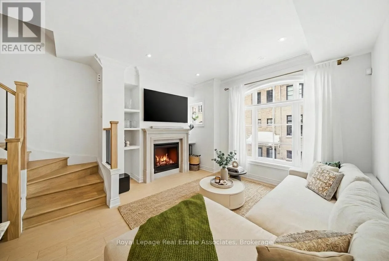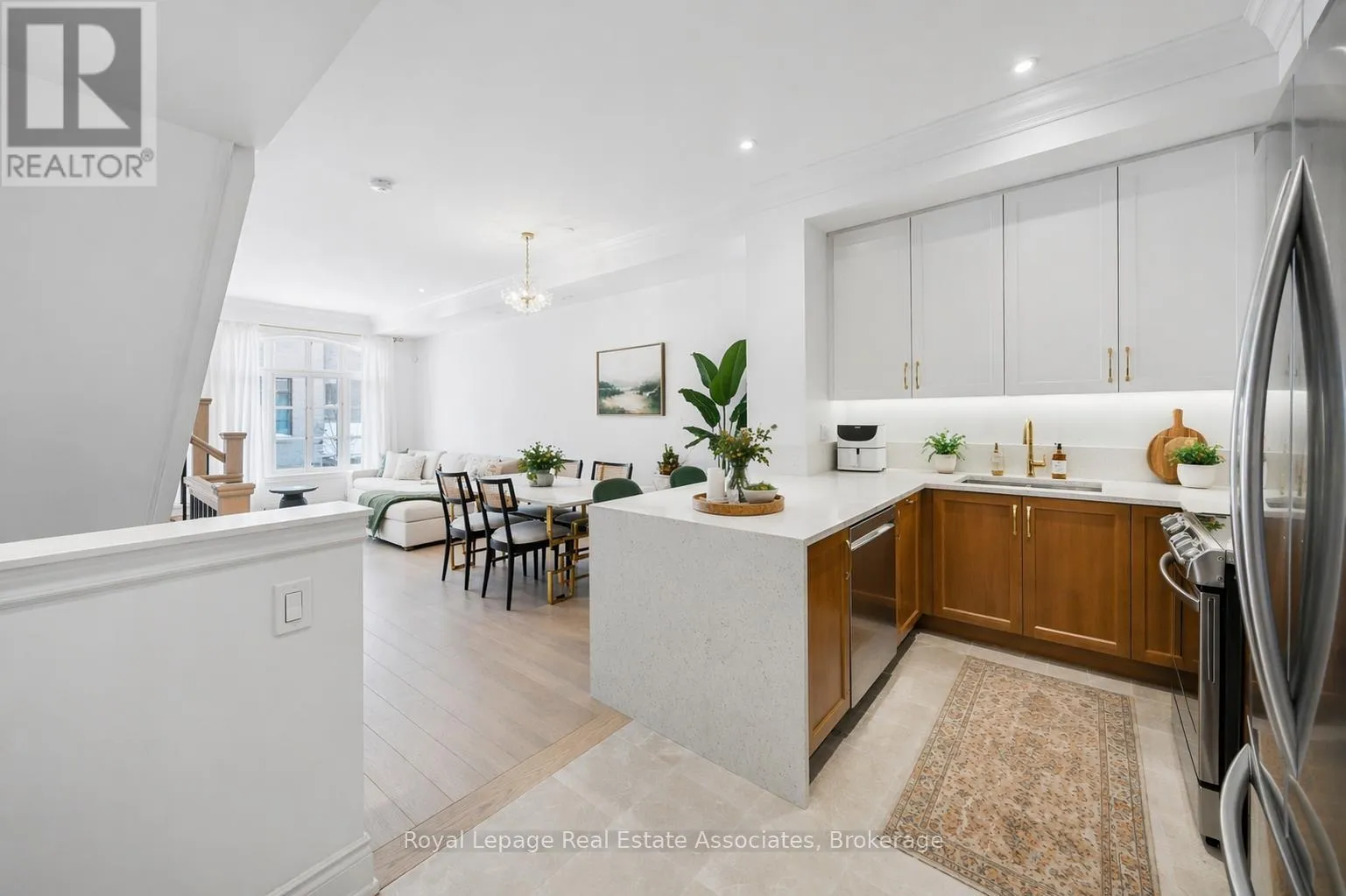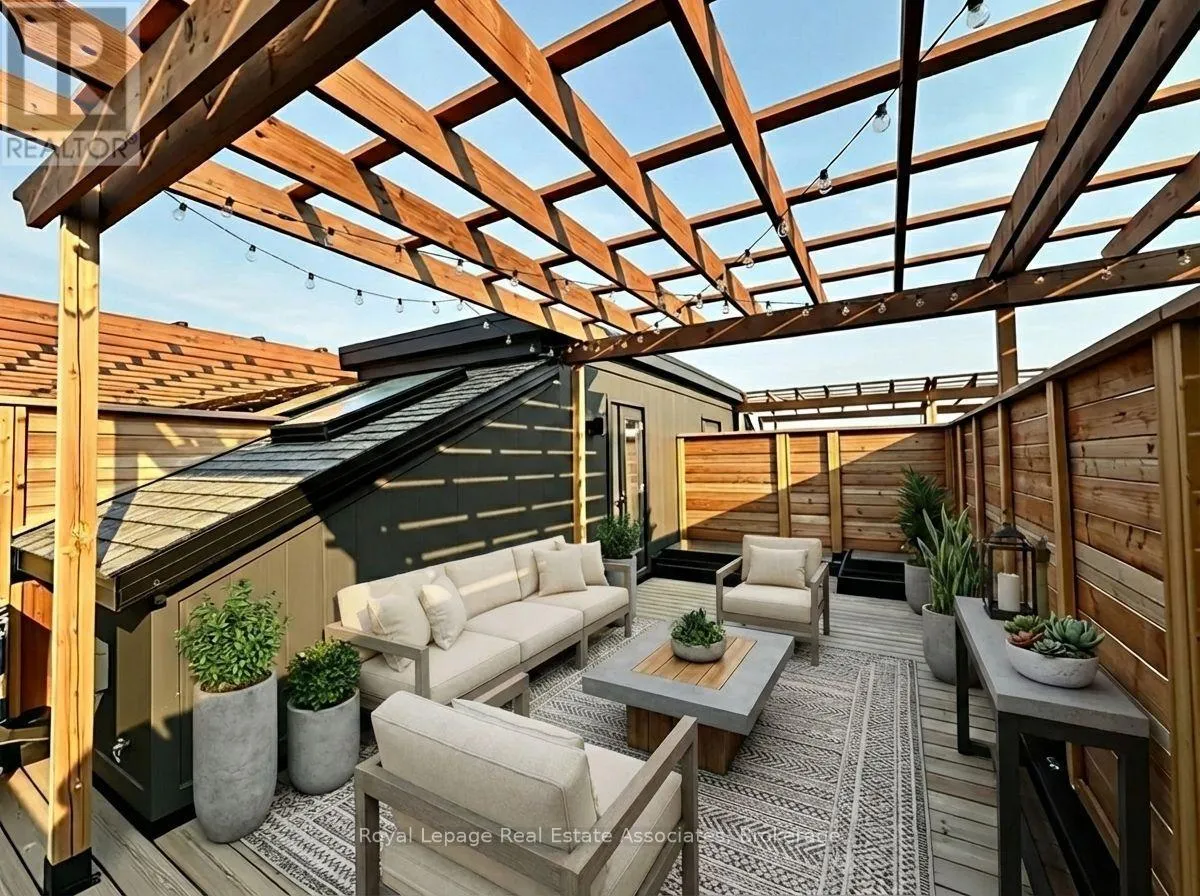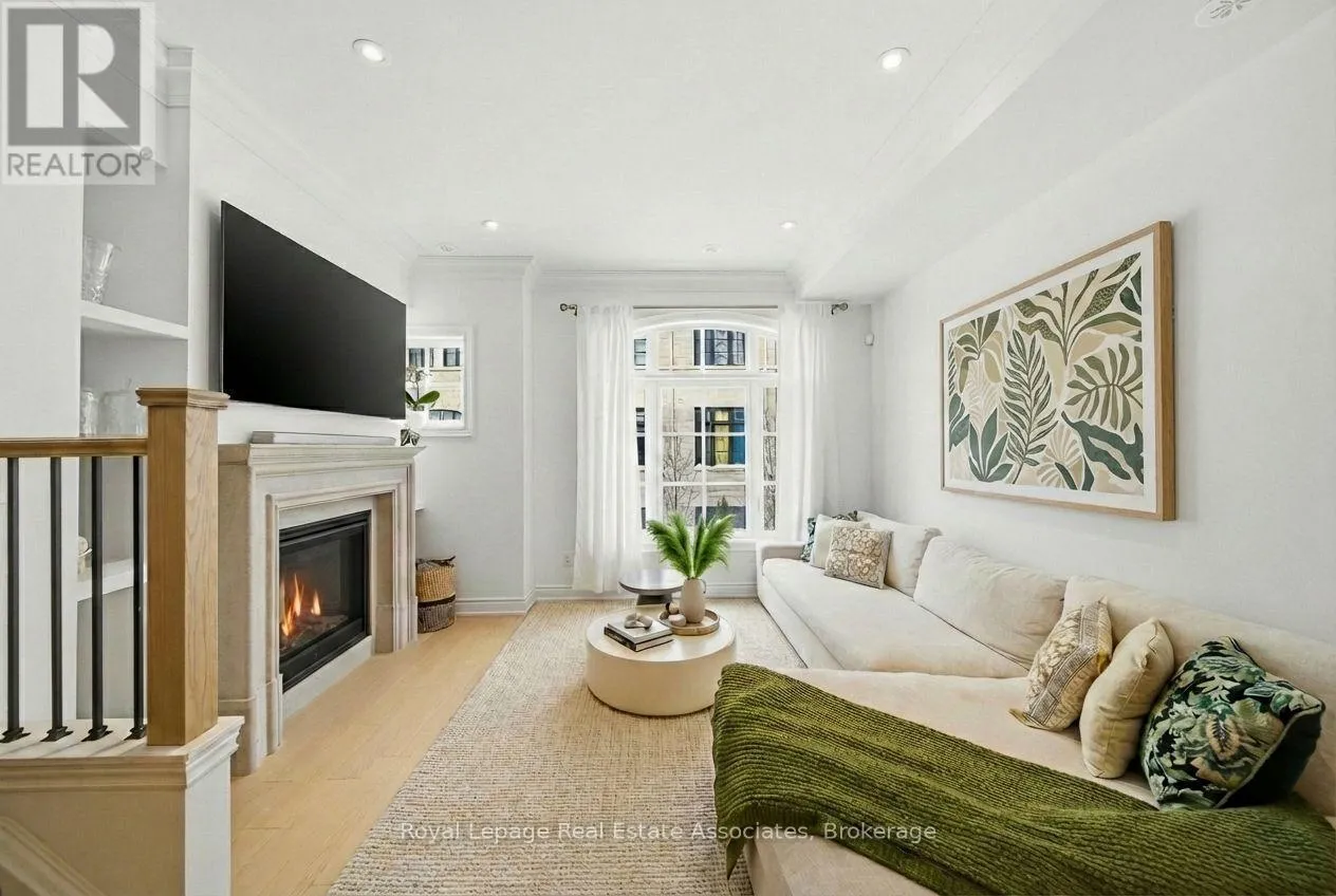 Thomas & Queen A refined luxury townhome by Dunpar Homes, nestled in the heart of vibrant Streetsville. This thoughtfully upgraded 1517 sq ft 3-bedroom, 2-bathroom residence delivers premium finishes, thoughtful design, and exceptional indoor-outdoor living in a prime, walkable location. The interior is bright and open, featuring soaring 9.5-foot ceilings and numerous skylights that flood the home with natural light. Wide plank hardwood flooring, smooth ceilings, LED pot lights, and solid oak stairs with iron pickets create an elegant and cohesive feel throughout. A natural gas fireplace with an upgraded Regency-style mantel and custom built-in shelving anchors the main living space, adding both warmth and functional design. The custom two-toned kitchen is a chef's delight, finished with quartz counters, a waterfall island, crown mouldings, premium stainless-steel appliances, and elevated cabinetry details. Bathrooms feature luxurious marble counters. Additional upgrades include a central steam humidifier and an electric vehicle charger rough-in. The primary suite functions as a private retreat, complete with crown moulding, a walkout to a private balcony, and an oversized walk-in closet with a fully integrated custom organization system. Outside, an expansive south-facing 268 sq ft rooftop terrace offers a gas BBQ line, water hookup, and a pergola-ideal for effortless, sun-filled entertaining. Enjoy an unparalleled level of convenience. The home is steps to GO transit, dining, trails, parks, top-rated schools, a recreation centre, and charming village shops, all with quick access to major highways. Set within an exclusive, family-friendly community known for its timeless architecture and modern design, this townhome offers the perfect blend of luxury, convenience, and low-maintenance living. Extensively upgraded, generously sized, and offering exceptional value, this turnkey home delivers luxury without compromise. (id:27476)