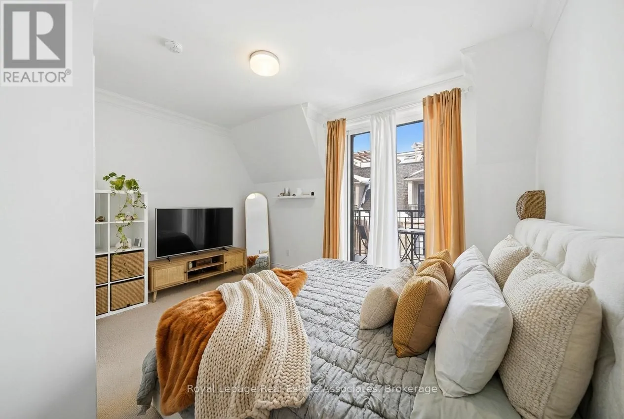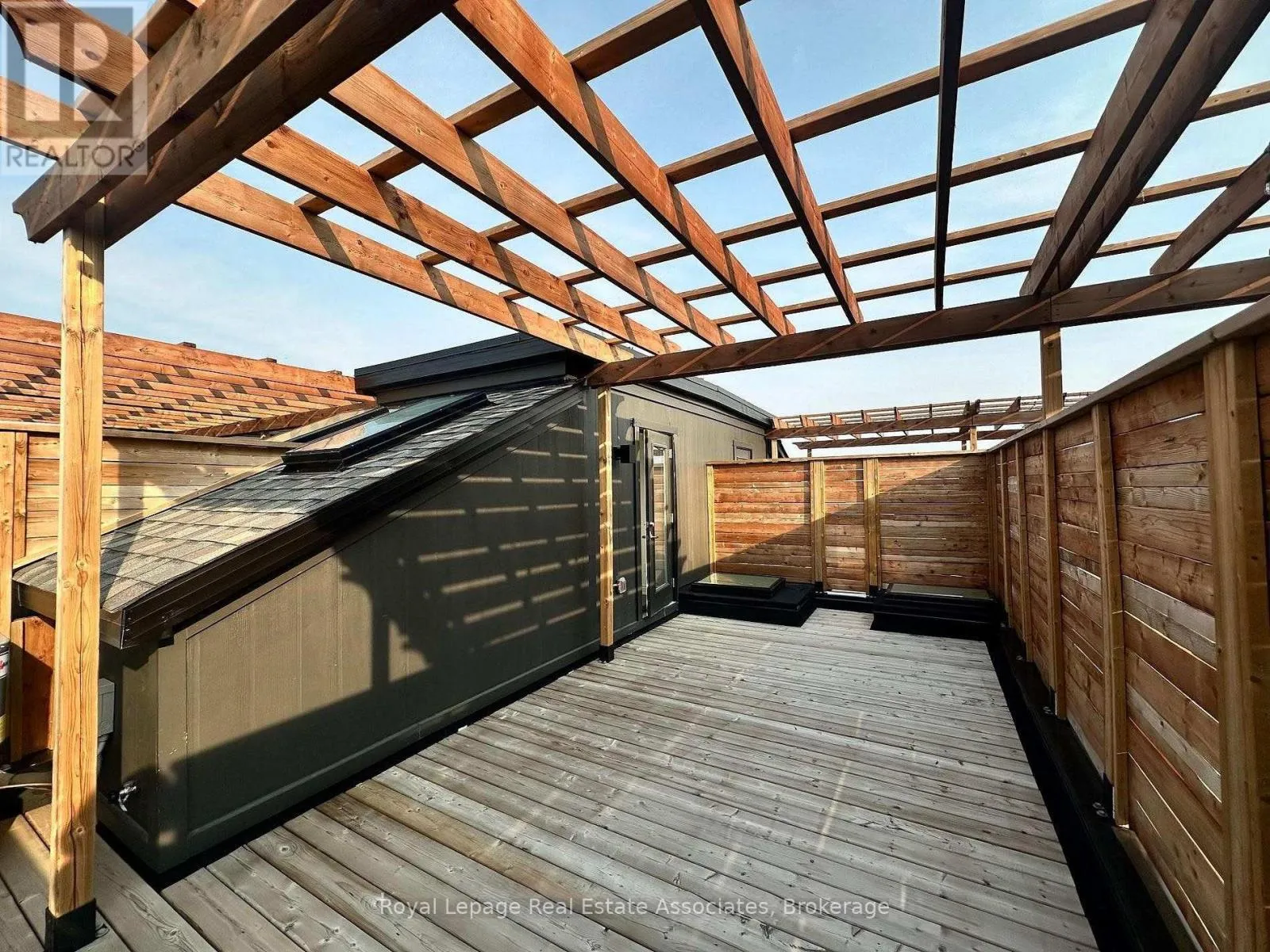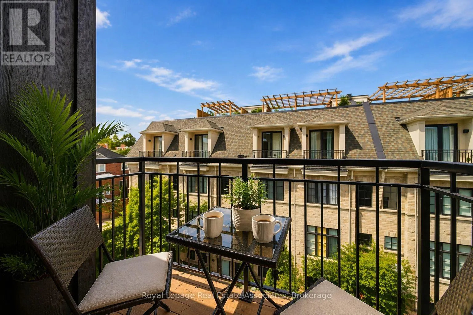 Thomas & Queen A refined luxury townhome by Dunpar Homes, nestled in the heart of vibrant Streetsville. This thoughtfully upgraded 1517 sq ft 3-bedroom, 2-bathroom residence delivers premium finishes, thoughtful design, and exceptional indoor-outdoor living in a prime, walkable location. The interior is bright and open, featuring soaring 9.5-foot ceilings and numerous skylights that flood the home with natural light. Wide plank hardwood flooring, smooth ceilings, LED pot lights, and solid oak stairs with iron pickets create an elegant and cohesive feel throughout. A natural gas fireplace with an upgraded Regency-style mantel and custom built-in shelving anchors the main living space, adding both warmth and functional design. The custom two-toned kitchen is a chef's delight, finished with quartz counters, a waterfall island, crown mouldings, premium stainless-steel appliances, and elevated cabinetry details. Bathrooms feature luxurious marble counters. Additional upgrades include a central steam humidifier and an electric vehicle charger rough-in. The primary suite functions as a private retreat, complete with crown moulding, a walkout to a private balcony, and an oversized walk-in closet with a fully integrated custom organization system. Outside, an expansive south-facing 268 sq ft rooftop terrace offers a gas BBQ line, water hookup, and a pergola-ideal for effortless, sun-filled entertaining. Enjoy an unparalleled level of convenience. The home is steps to GO transit, dining, trails, parks, top-rated schools, a recreation centre, and charming village shops, all with quick access to major highways. Set within an exclusive, family-friendly community known for its timeless architecture and modern design, this townhome offers the perfect blend of luxury, convenience, and low-maintenance living. Extensively upgraded, generously sized, and offering exceptional value, this turnkey home delivers luxury without compromise. (id:27476)