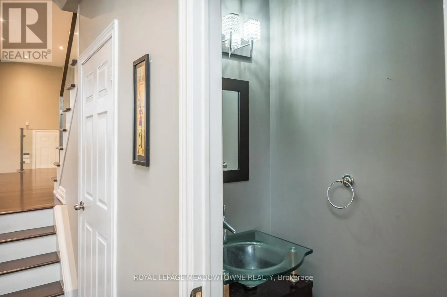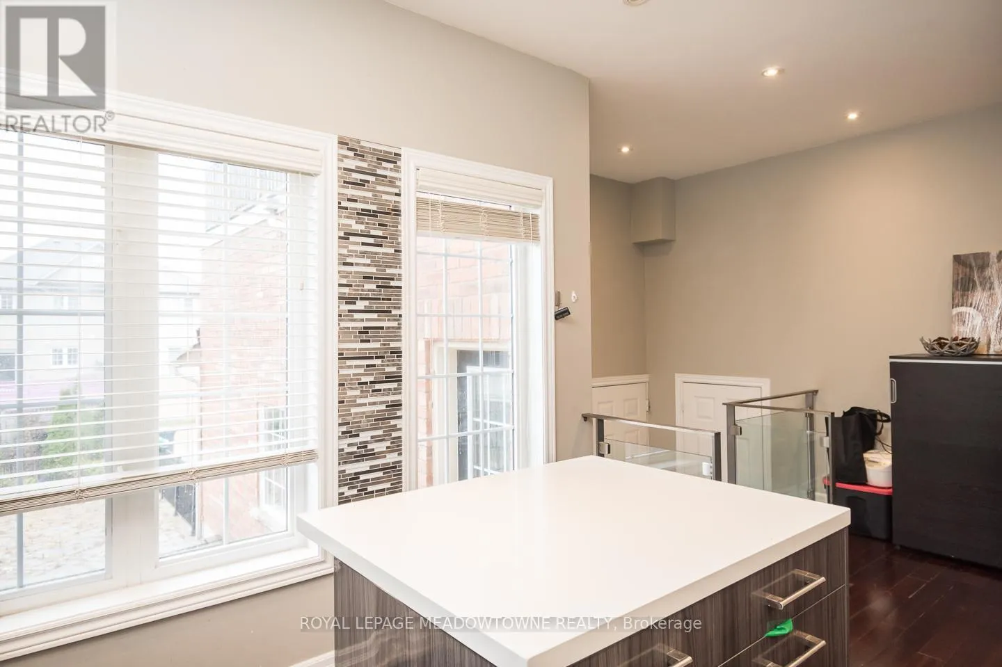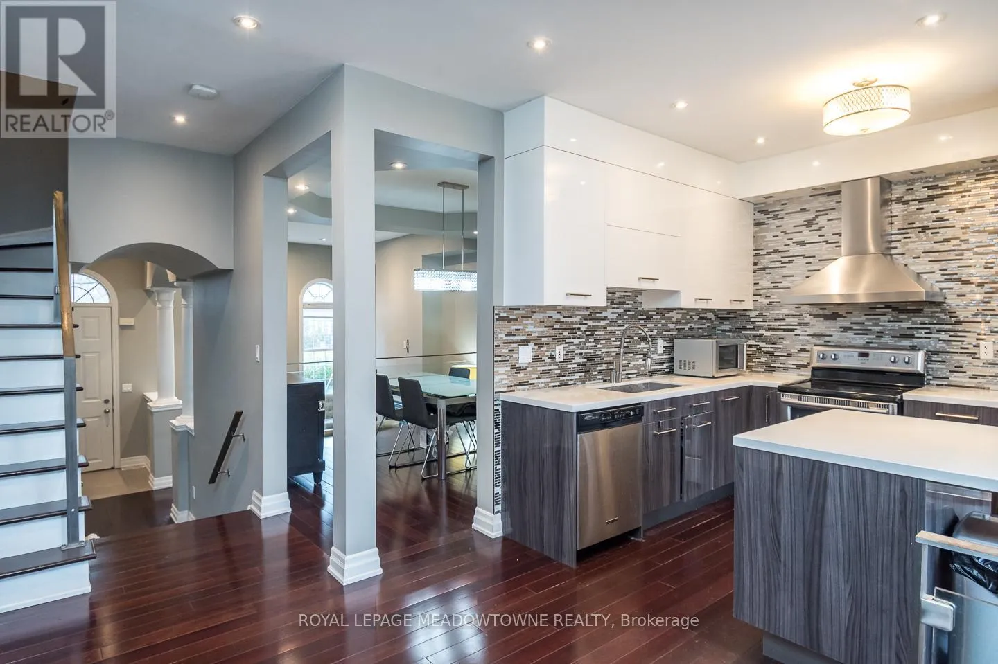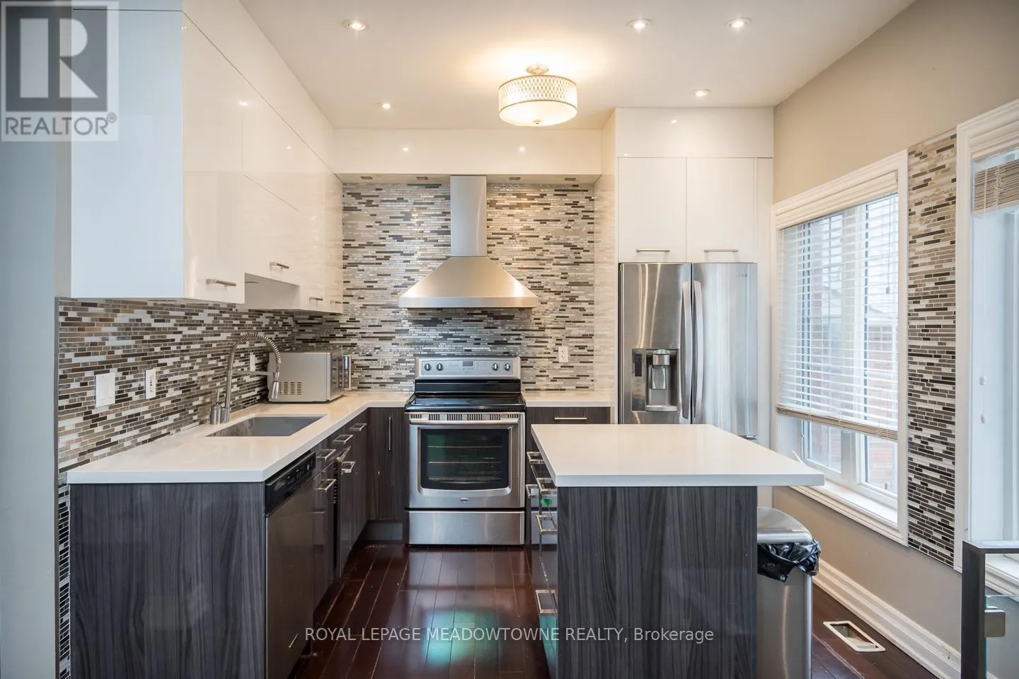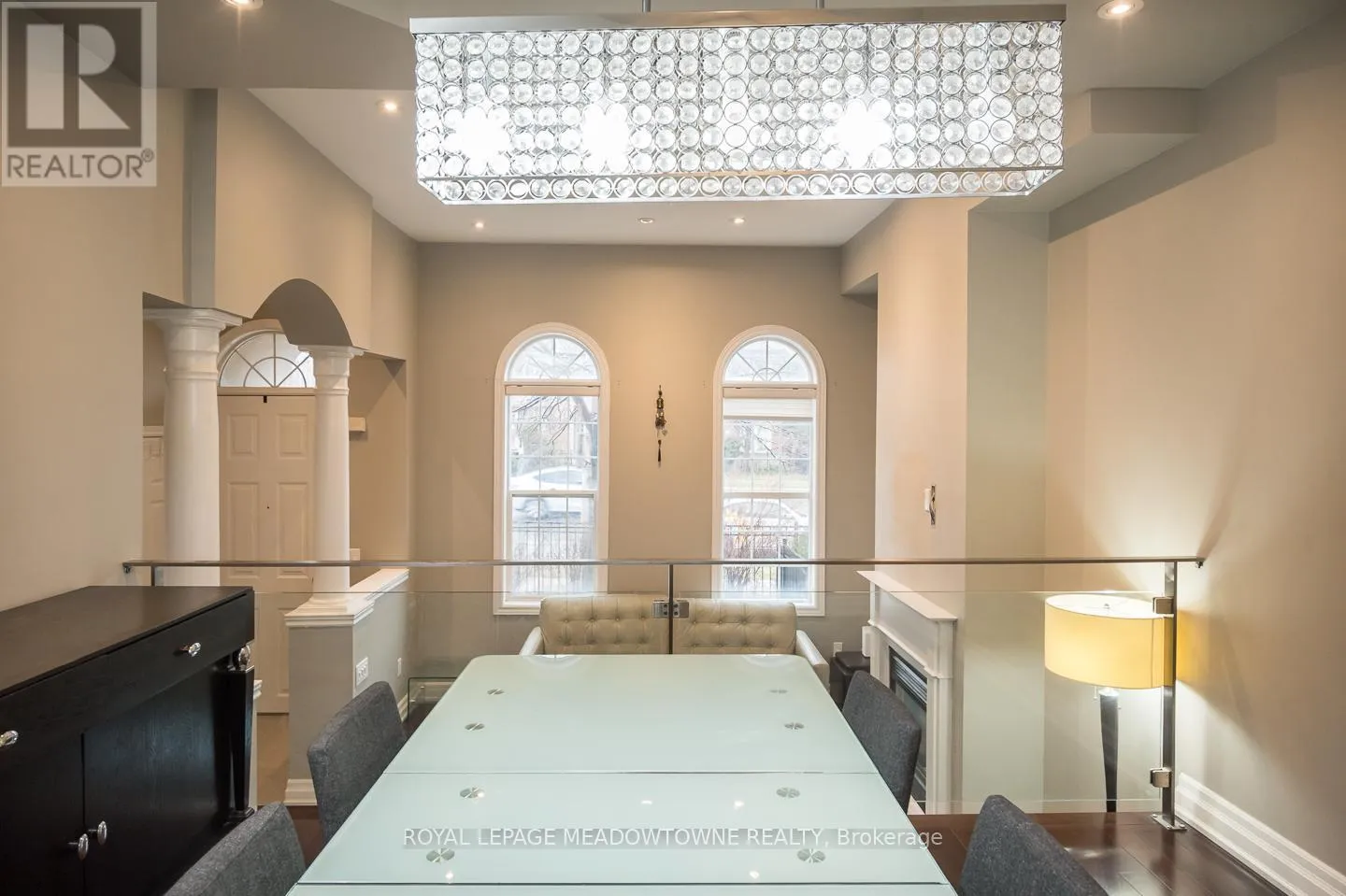 Eglinton Ave / Ridgeway Dr Step inside to a home where the finishes take center stage. Rich Jatoba hardwood flows across the main & second levels, paired with sleek glass & steel railings & lighting that elevate every space. The front living room offers a warm focal point with its fireplace, while the distinct dining area creates an effortless setting for hosting. The custom Irpinia kitchen is the true showpiece - bright, refined, & designed for both beauty & performance. Caesarstone quartz counters, a stylish tile backsplash, Blanco undermount sink, & premium Dacor dual fuel gas cooktop with electric oven (paired with a Ventahood) set the tone. Walk out to a private backyard retreat with an interlock patio. Upstairs, the primary suite features a private balcony, walk in closet & spa inspired 4 piece ensuite. Two additional bedrooms share a generous main bath, with upper-level laundry for convenience. The finished basement adds a bright recreation area with large windows & a full 4 piece bath. Three car parking & interior garage access complete this home in sought after Churchill Meadows. (id:27476)