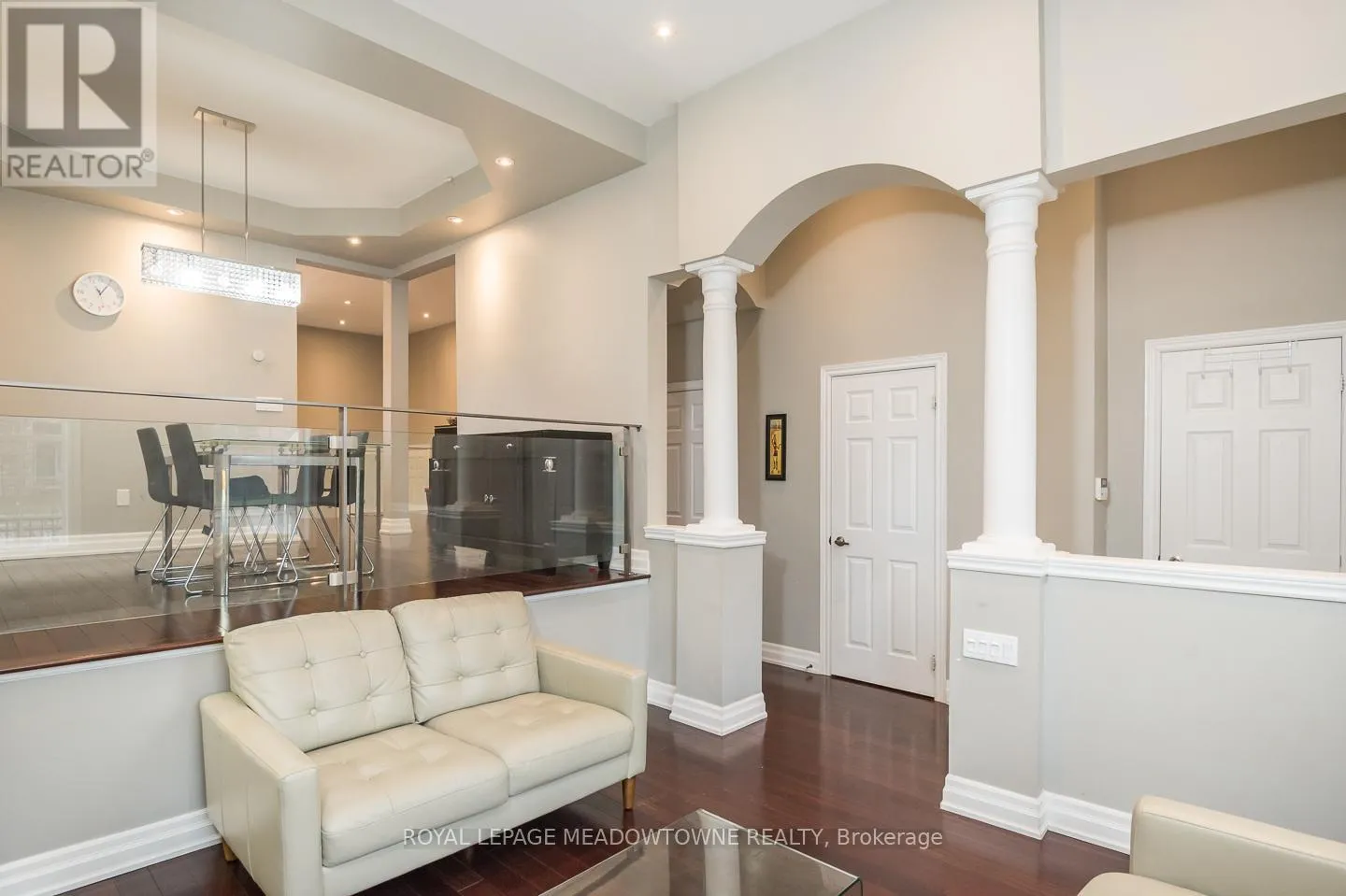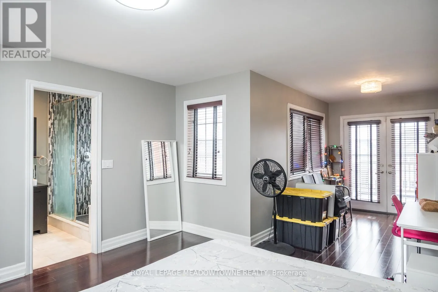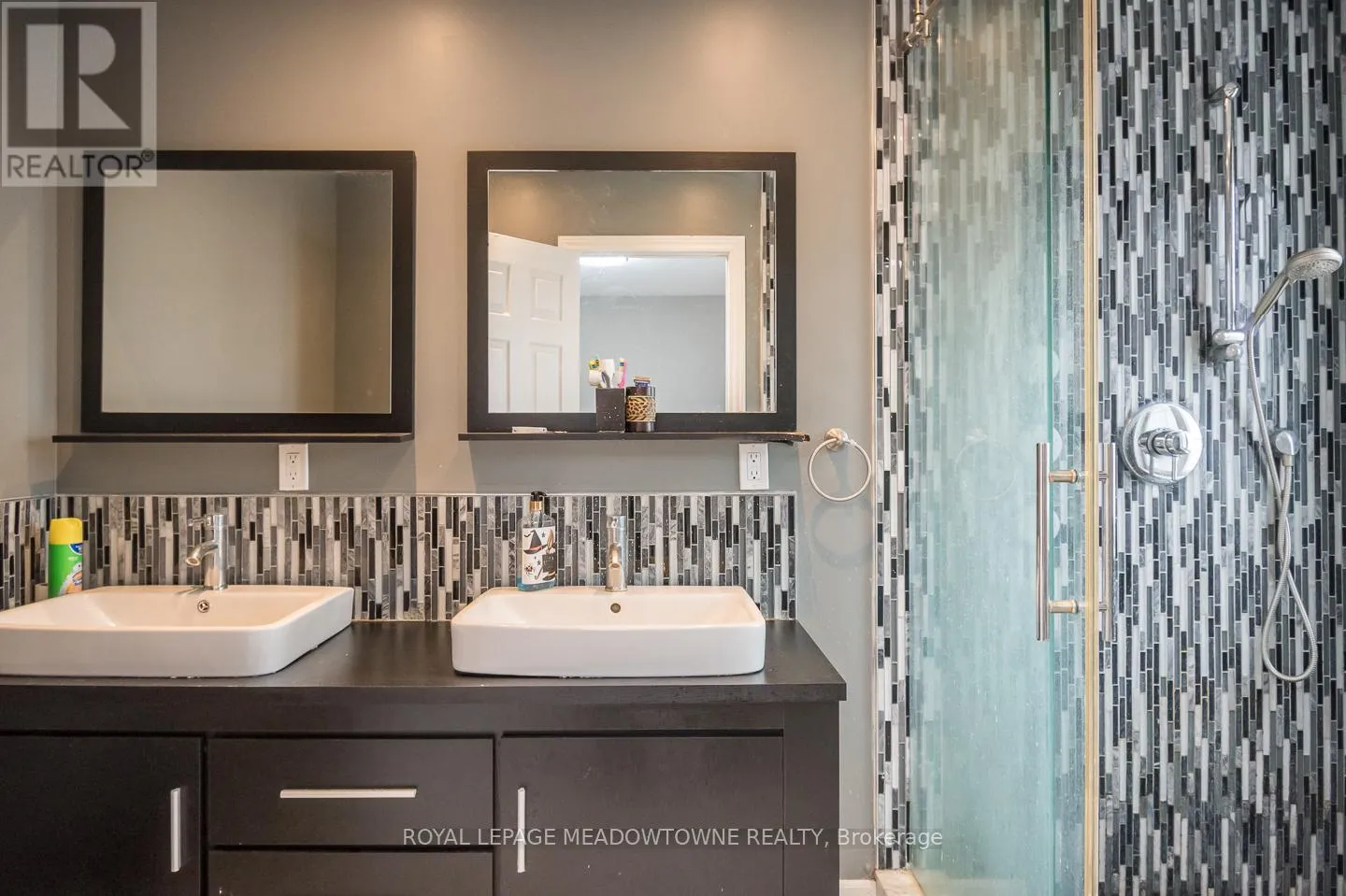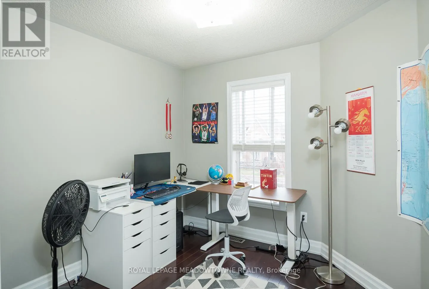 Eglinton Ave / Ridgeway Dr Step inside to a home where the finishes take center stage. Rich Jatoba hardwood flows across the main & second levels, paired with sleek glass & steel railings & lighting that elevate every space. The front living room offers a warm focal point with its fireplace, while the distinct dining area creates an effortless setting for hosting. The custom Irpinia kitchen is the true showpiece - bright, refined, & designed for both beauty & performance. Caesarstone quartz counters, a stylish tile backsplash, Blanco undermount sink, & premium Dacor dual fuel gas cooktop with electric oven (paired with a Ventahood) set the tone. Walk out to a private backyard retreat with an interlock patio. Upstairs, the primary suite features a private balcony, walk in closet & spa inspired 4 piece ensuite. Two additional bedrooms share a generous main bath, with upper-level laundry for convenience. The finished basement adds a bright recreation area with large windows & a full 4 piece bath. Three car parking & interior garage access complete this home in sought after Churchill Meadows. (id:27476)