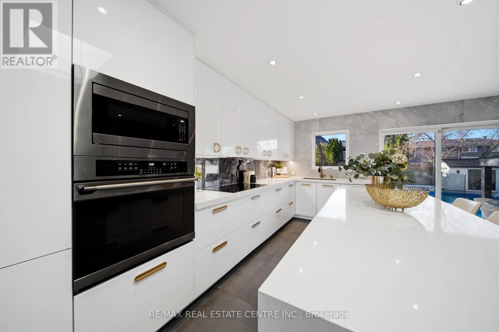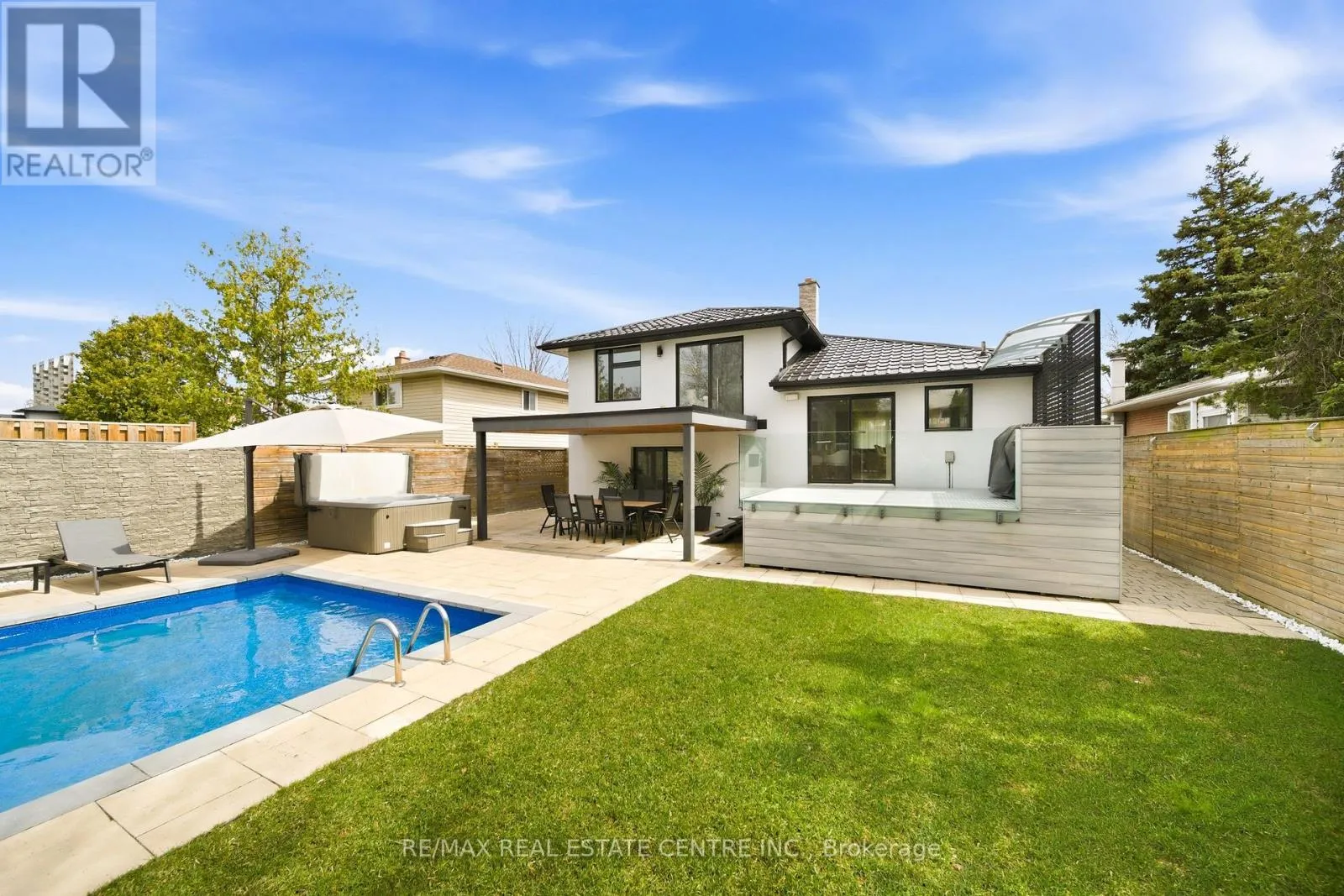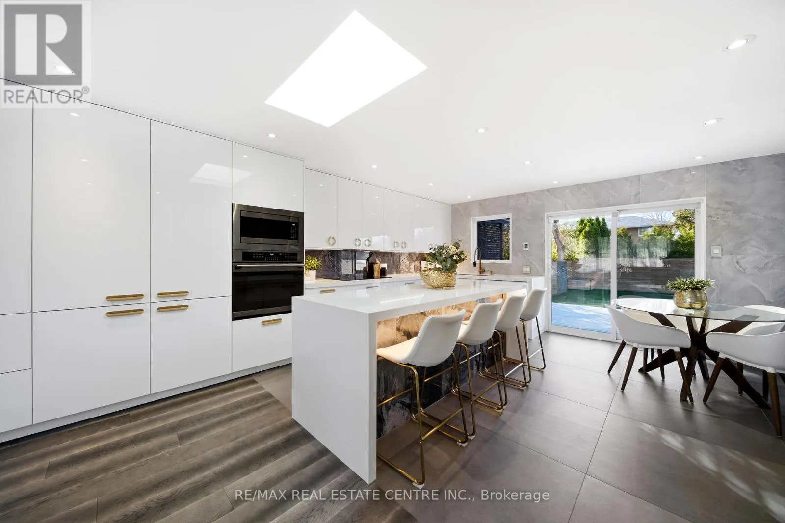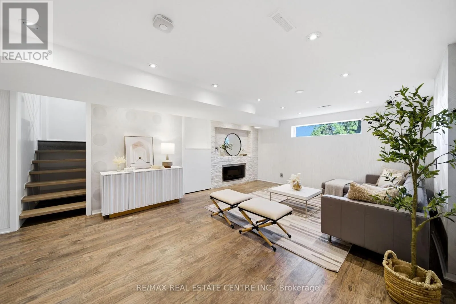 Truscott - Southdown Spectacularly reimagined in the heart of Clarkson, this extensively renovated residence offers a rare blend of luxury, comfort, and thoughtful design with premium upgrades throughout. A spacious foyer welcomes you to a bright, open-concept layout featuring Italian tile and engineered hardwood flooring, potlights, and a skylight that fills the home with natural light. Heated floors in the foyer, kitchen, powder room, and upper bathroom add everyday comfort. The living room makes a bold statement with designer Versace wallpaper, custom built-ins, and a large picture window, flowing seamlessly into the show-stopping chef's kitchen. Designed as the heart of the home, it features built-in appliances, an induction cooktop, double ovens, panelled fridge, waterfall island, stunning backsplash with water valve, organic waste disposal, water filtration system, and a sun-filled dinette. A contemporary staircase leads to four bedrooms with custom closets and beautifully updated bathrooms. The main bath is exquisitely remodelled with double vanities, a soaker tub, and sleek glass shower. The bright, finished lower level offers a cozy family room with gas fireplace and stone surround, a dedicated office, additional bathroom, and a beautifully designed laundry room. Outdoors, your WOWZA backyard awaits. Enjoy a professionally landscaped backyard with interlock stonework, patio, and deck with privacy awning. The fully renovated heated pool, hot tub, and covered ceiling with potlights create a true resort-style escape right at home. Additional highlights include a natural vein-cut travertine façade, metal roof with warranty, updated windows, sprinkler system, EV charger rough-in, and no rental equipment-offering peace of mind and turnkey convenience. Ideally located within walking distance to shops and the community centre, this home delivers upscale living in a sought-after neighbourhood. (id:27476)