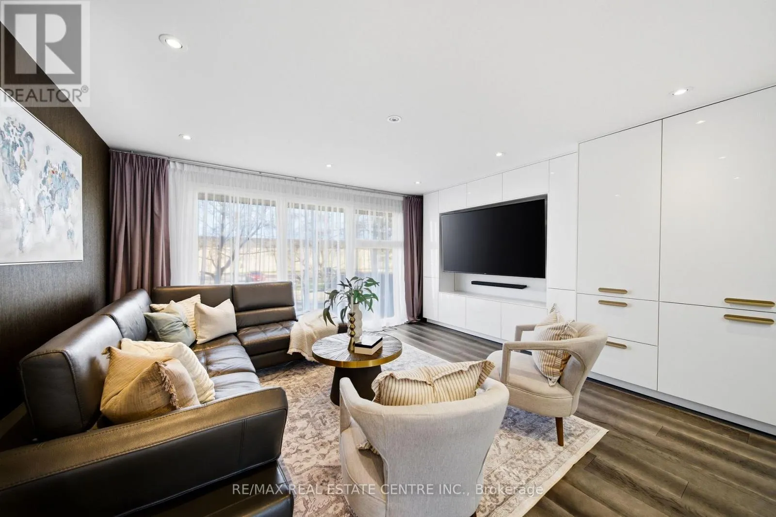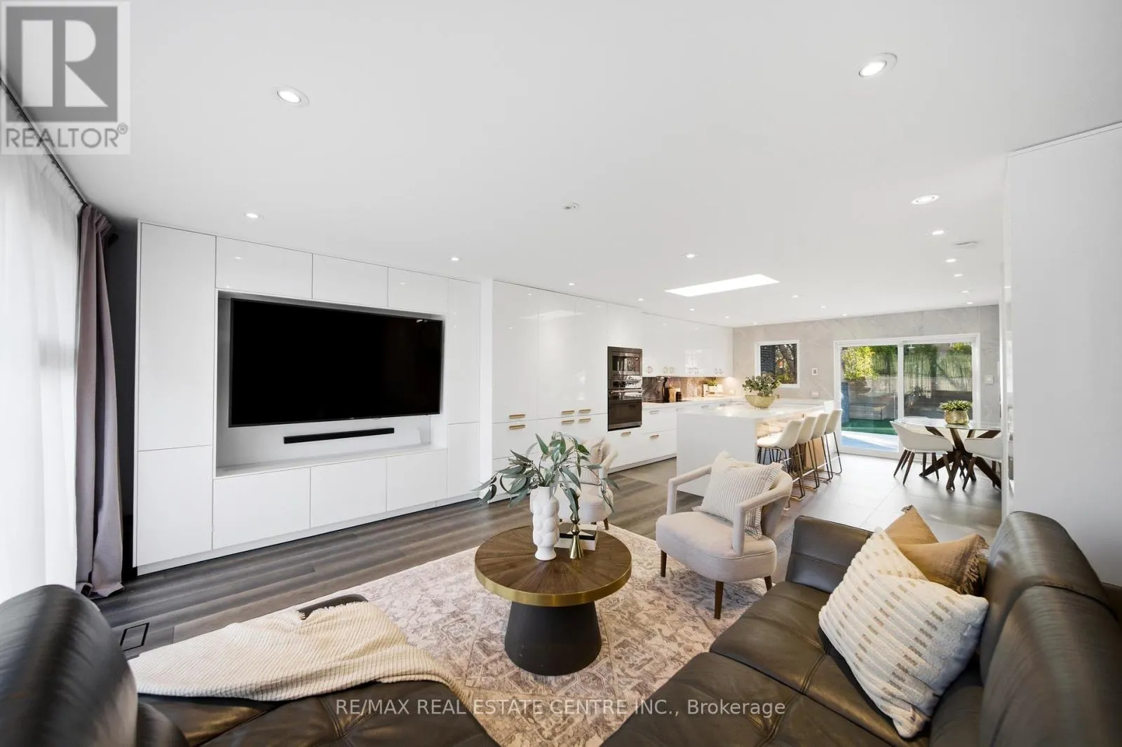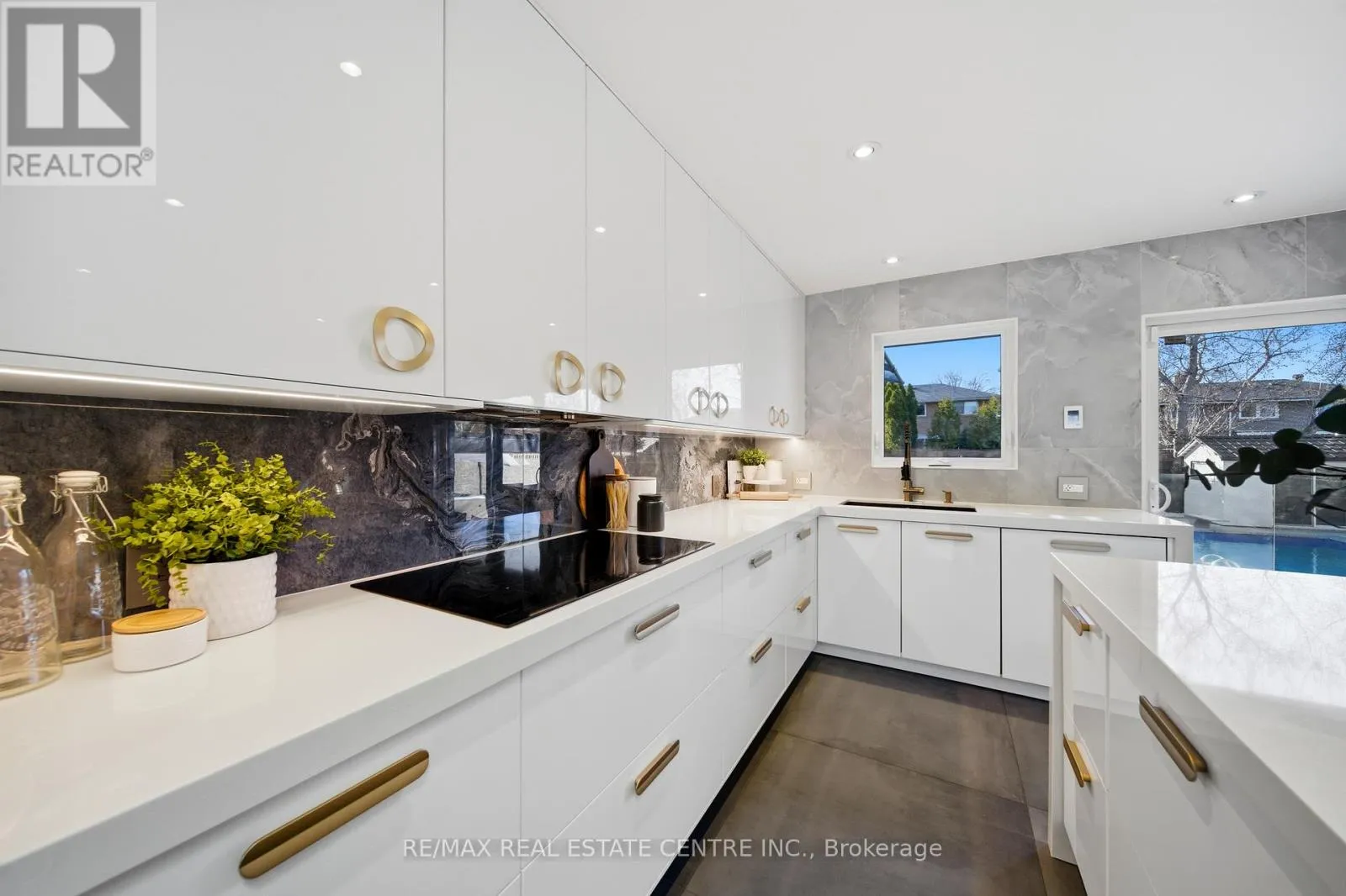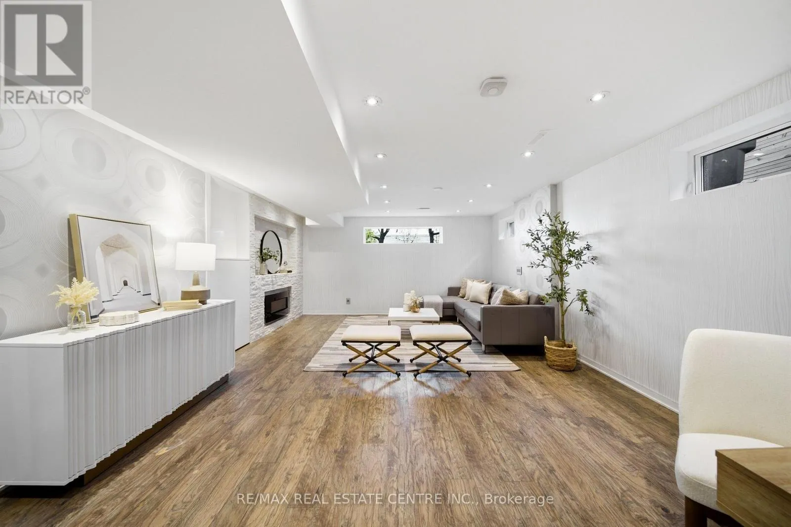Truscott - Southdown Spectacularly reimagined in the heart of Clarkson, this extensively renovated residence offers a rare blend of luxury, comfort, and thoughtful design with premium upgrades throughout. A spacious foyer welcomes you to a bright, open-concept layout featuring Italian tile and engineered hardwood flooring, potlights, and a skylight that fills the home with natural light. Heated floors in the foyer, kitchen, powder room, and upper bathroom add everyday comfort. The living room makes a bold statement with designer Versace wallpaper, custom built-ins, and a large picture window, flowing seamlessly into the show-stopping chef's kitchen. Designed as the heart of the home, it features built-in appliances, an induction cooktop, double ovens, panelled fridge, waterfall island, stunning backsplash with water valve, organic waste disposal, water filtration system, and a sun-filled dinette. A contemporary staircase leads to four bedrooms with custom closets and beautifully updated bathrooms. The main bath is exquisitely remodelled with double vanities, a soaker tub, and sleek glass shower. The bright, finished lower level offers a cozy family room with gas fireplace and stone surround, a dedicated office, additional bathroom, and a beautifully designed laundry room. Outdoors, your WOWZA backyard awaits. Enjoy a professionally landscaped backyard with interlock stonework, patio, and deck with privacy awning. The fully renovated heated pool, hot tub, and covered ceiling with potlights create a true resort-style escape right at home. Additional highlights include a natural vein-cut travertine façade, metal roof with warranty, updated windows, sprinkler system, EV charger rough-in, and no rental equipment-offering peace of mind and turnkey convenience. Ideally located within walking distance to shops and the community centre, this home delivers upscale living in a sought-after neighbourhood. (id:27476)