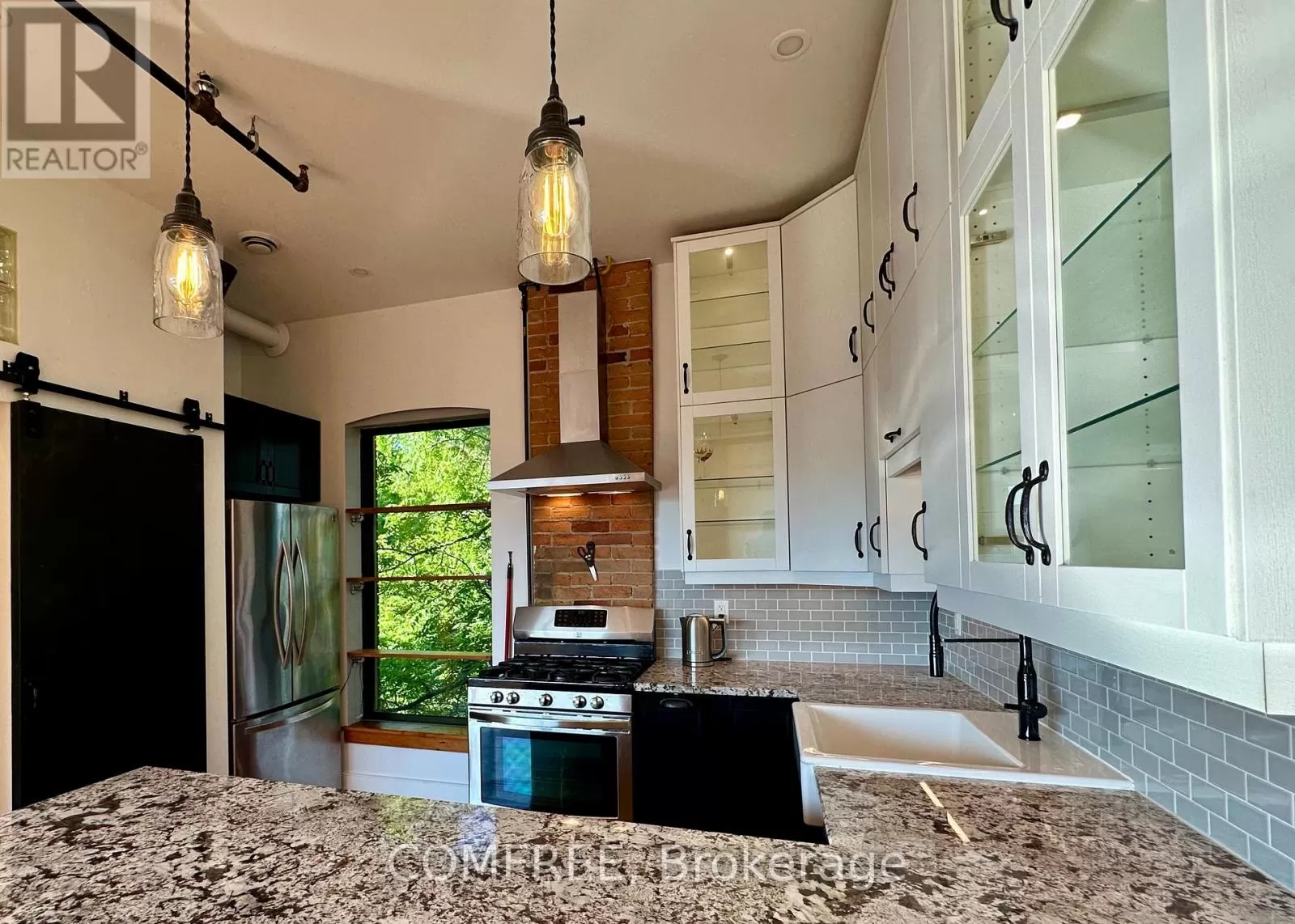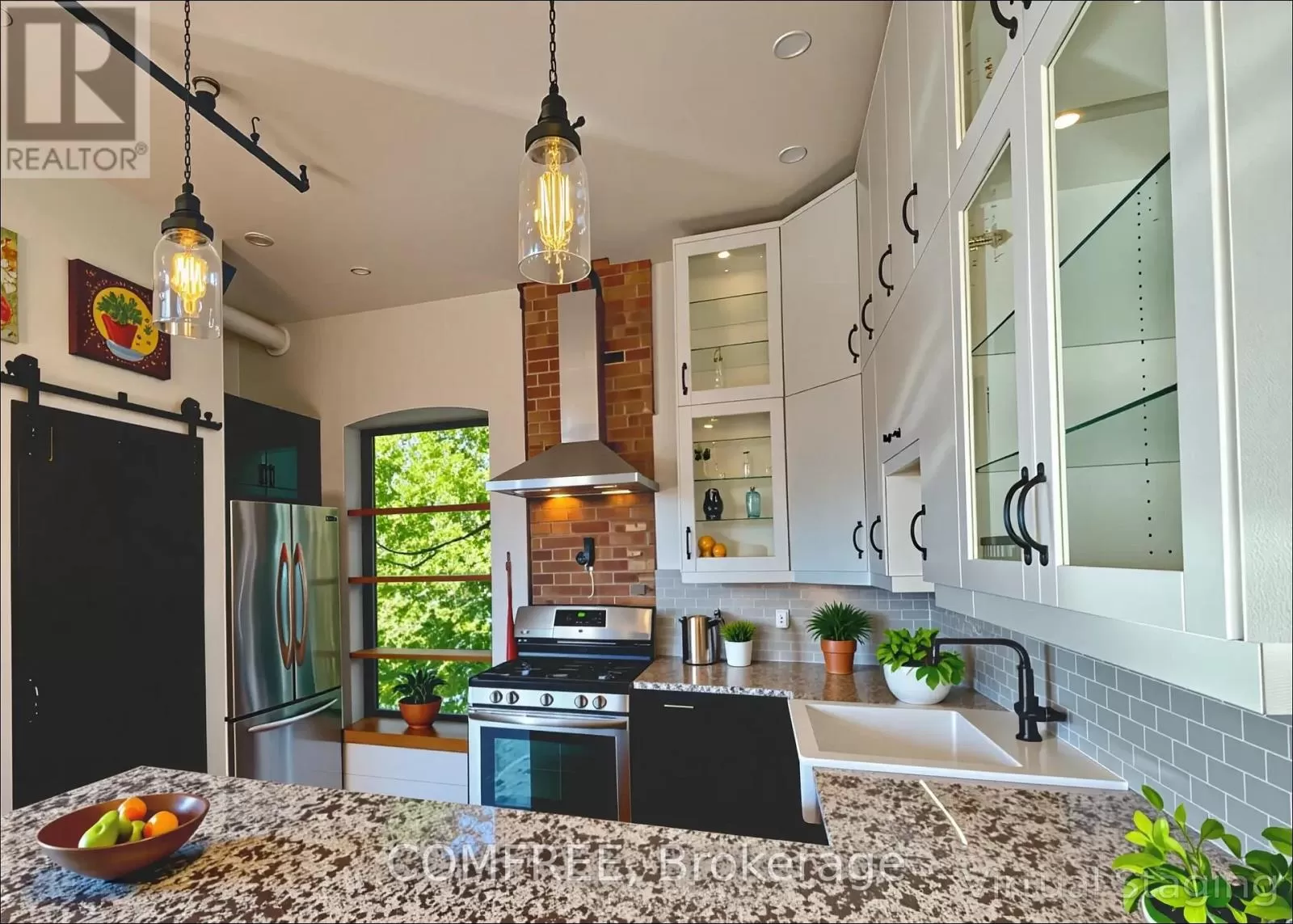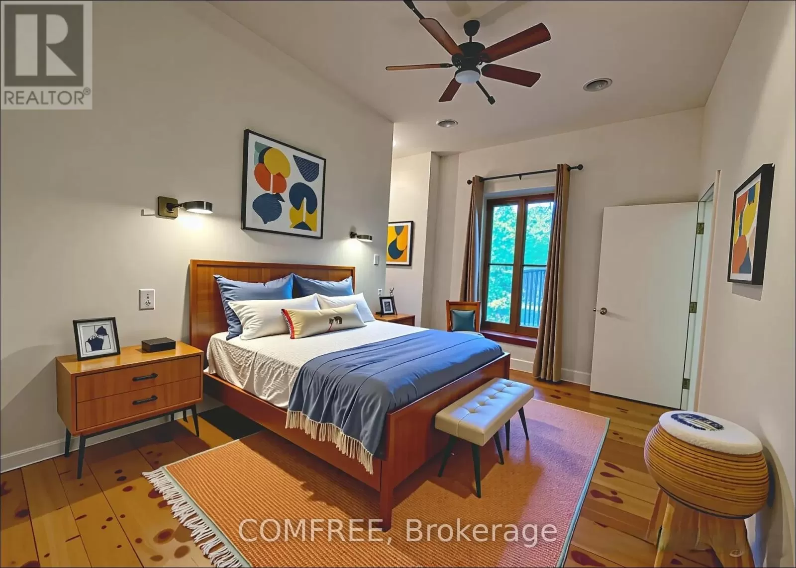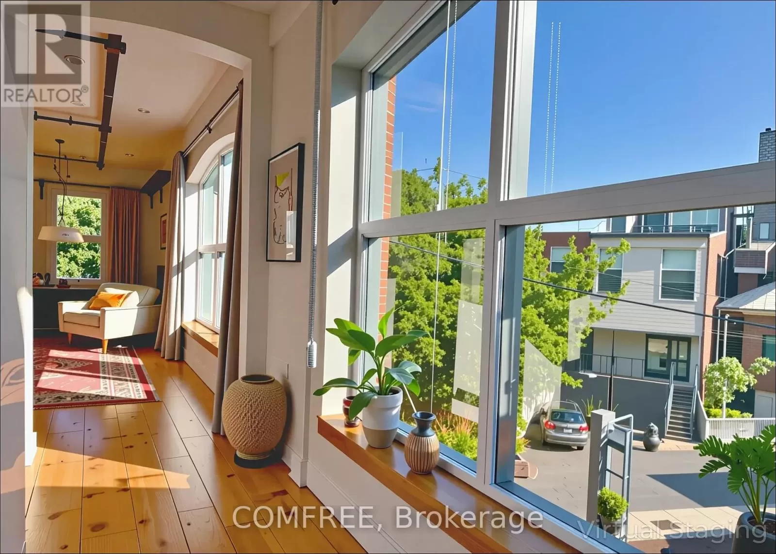 Cross Streets: Mills St and Bridge St. ** Directions: see map. This gorgeous second storey condo unit at Thoburn Mill is your new home in the heart of historic downtown Almonte.Massive panoramic living-room window overlooks shops, restaurants & cafes. Light-filled primary bedroom and guest room offer inspiring views of 19th century architecture. Granite kitchen counters, heritage pine floors and exposed brick walls. 10 ft. ceilings. Large welcoming foyer with another panoramic window overlooking downtown. Artistic wrought iron balcony overlooking Little Bridge Street for morning coffee and people watching. Primary bedroom with Juliette balcony overlooking trees, recreation trail and Mississippi River Concerts and plays around the corner. Waterfront pub and picturesque riverwalk out the condo's back door. Outdoor bike racks. Dock your kayaks next to the building. Dedicated outdoor parking. Mature building, pet-friendly, great for a retired single or a working / retired couple. The unit has a guest room, and an office/craft room with its own key-code door beside primary bedroom. Condo corporation has ample reserve fund and no history of "special assessments". Water, and gas (which powers stove, on-demand water heater and rooftop furnace/air conditioner) utilities are included in condo fees. There is an inside lift up to second level of building at front entrance, then it's a few steps up to unit 200 from the lift. The unit is currently unoccupied and freshly painted in gallery white so you can move in at any time. Carefree urban lifestyle in a culturally rich heritage-designated Ottawa Valley setting that's a 20-minute drive to Kanata and a 35-minute drive to Ottawa, or don't drive at all and walk (or cycle, or paddle) to everything you need! (id:27476)