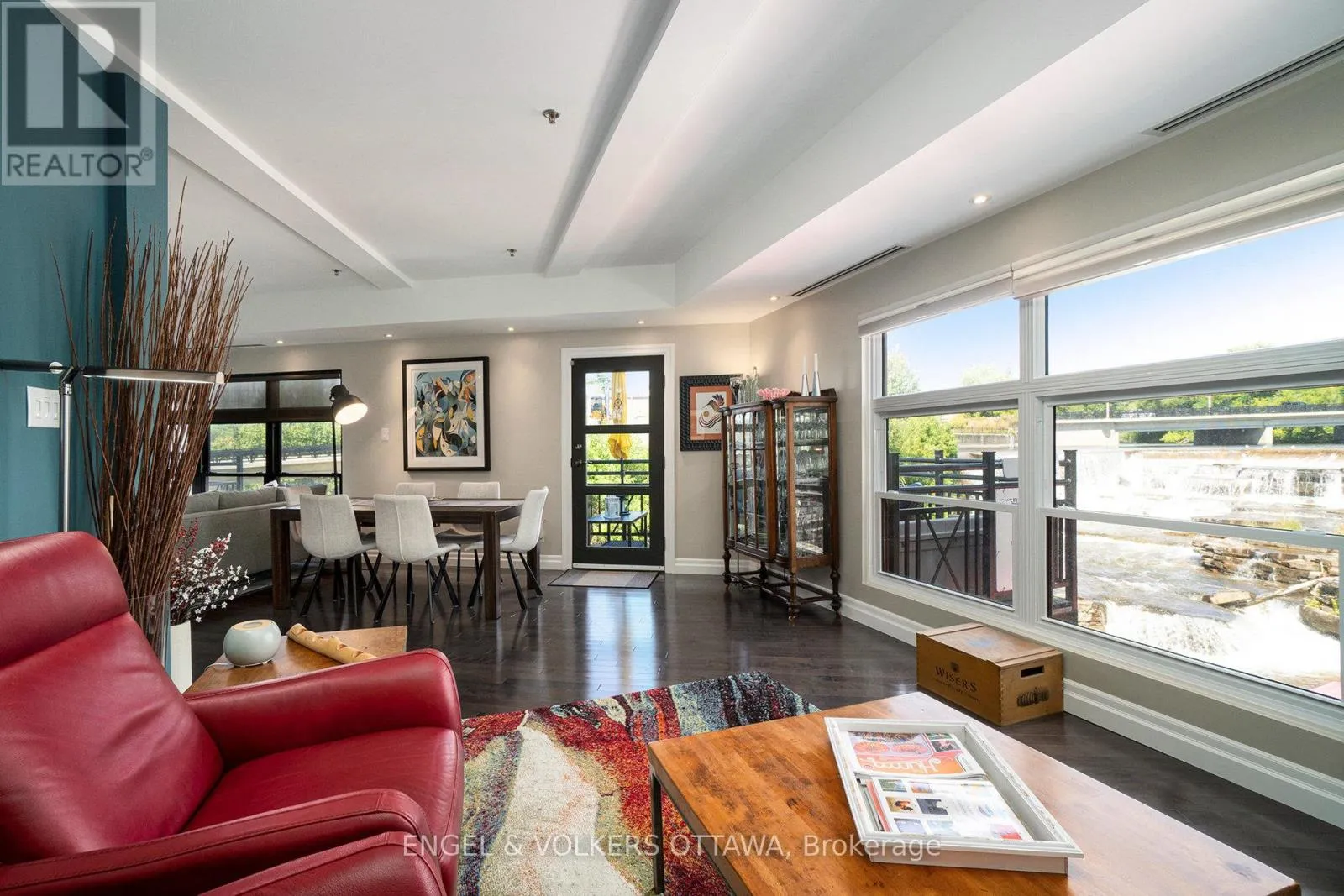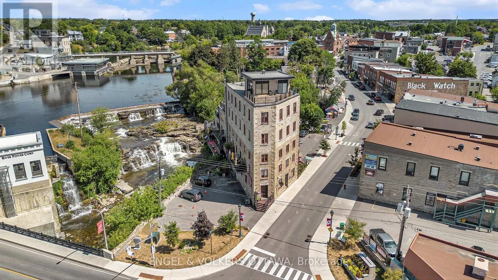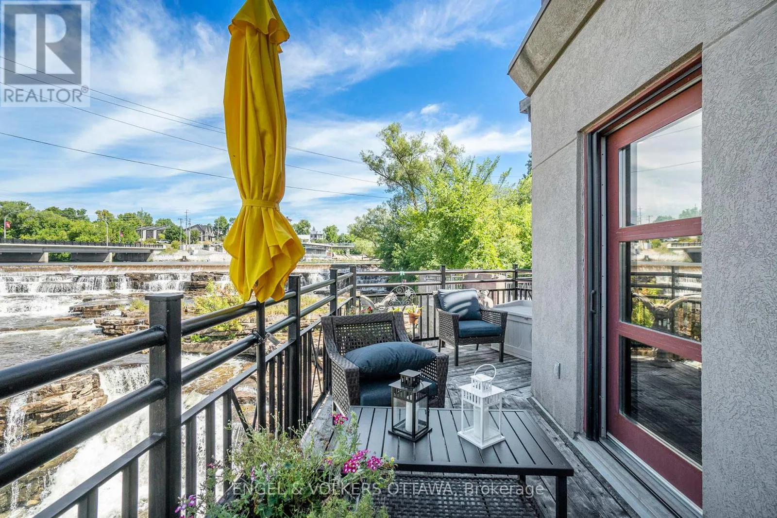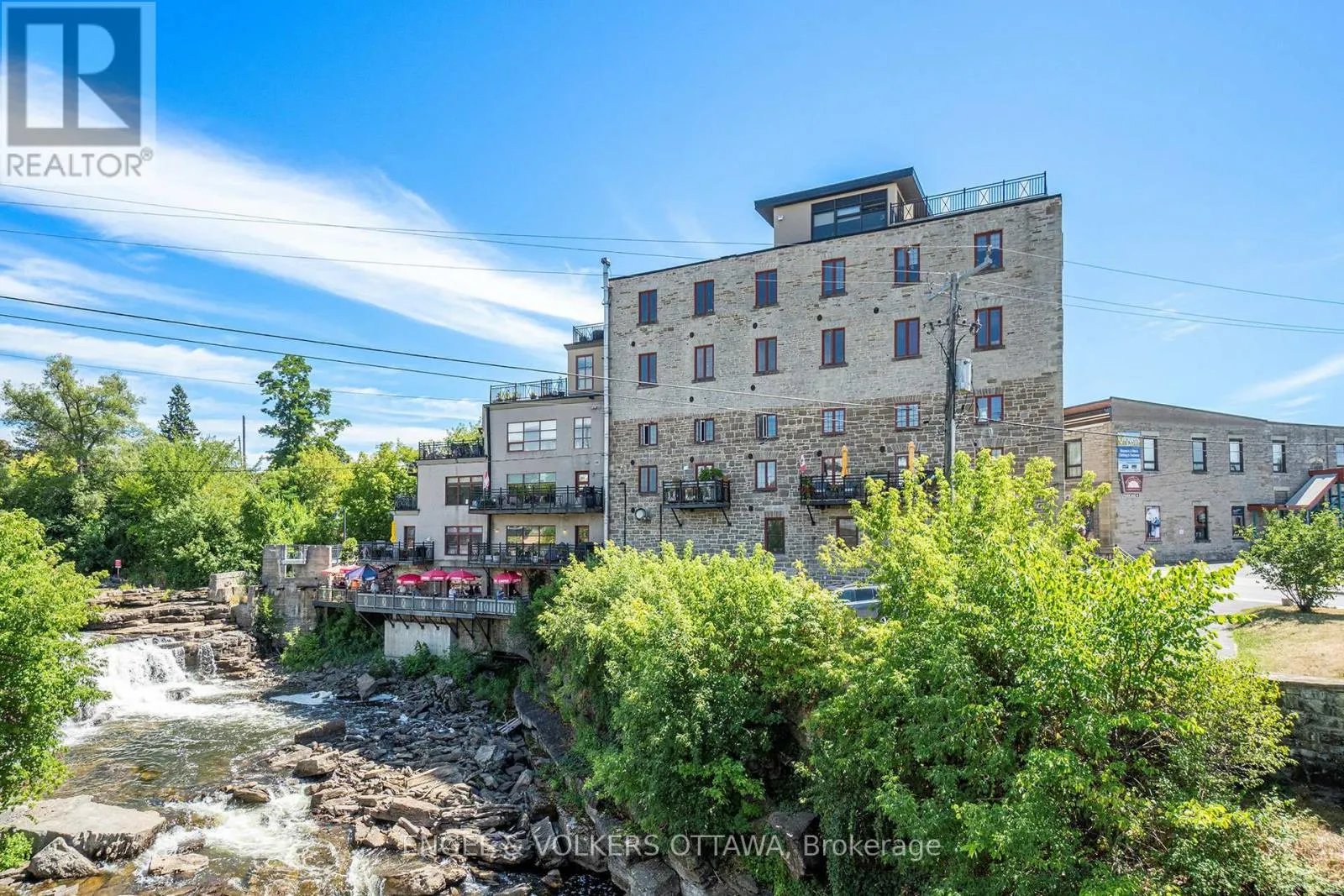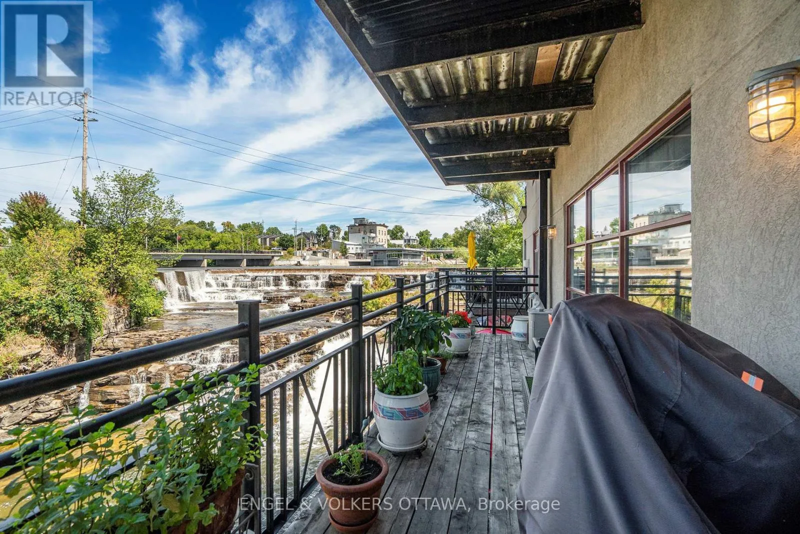 Cross Streets: Almonte St & Mill St. ** Directions: From Almonte St, turn onto Mill St. Welcome to this one-of-a-kind condo in the Victoria Woolen Mill in the heart of Almonte's historic district. With over $50K of improvements added in 2024-25, the unit's spacious foyer is filled with charm, featuring a stone accent wall, deep window ledges, and ceramic tile that flows seamlessly into elegant hardwood flooring carried throughout the home. Floor-to-ceiling windows and two large private balconies capture the home's most remarkable feature - a stunning and almost surreal view of the Mississippi Rivers Grand Falls. The showpiece kitchen is designed by Montreal luxury brand Miralis, and features quartz countertops, a striking island with a designer hood fan, a premium brand fridge and five-burner induction range, and sleek German hardware with pull-out storage solutions. The top-of-the-line Bosch dishwasher blends seamlessly into the custom cabinetry, while open shelving, a vibrant backsplash, and bright pot lighting combine style and functionality. The living and dining areas flow effortlessly together, with custom millwork offering both display shelving and abundant storage. High ceilings and recessed lighting enhance the open, airy ambiance. A thoughtfully designed pantry houses premium Electrolux laundry machines, additional cabinetry, a folding counter, and even a Fisher & Paykel dishwasher drawer. A full bathroom with shower and vanity, along with an adjoining storage room, completes this functional wing. The primary suite features double closets, unique architectural curves, and a beautifully renovated ensuite - complete with slate tile, heated floors, a rain shower, and a Canadian-made double vanity. The second bedroom, currently used as an office, offers privacy with a pocket door and flexible use as a guest space. With its rare combination of historic charm, modern luxury, and close proximity to award-winning businesses such as Hummingbird Chocolate Factory and Vodkow-Dairy Distillery, this residence is more than a home - it's a lifestyle. (id:27476)