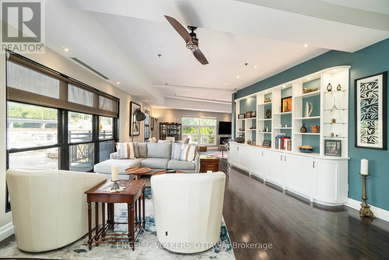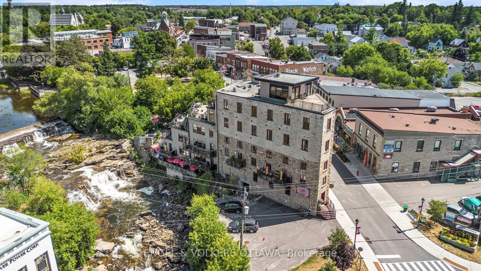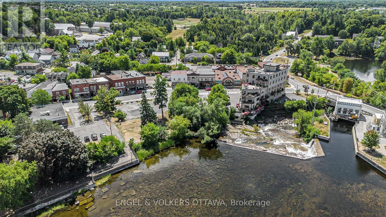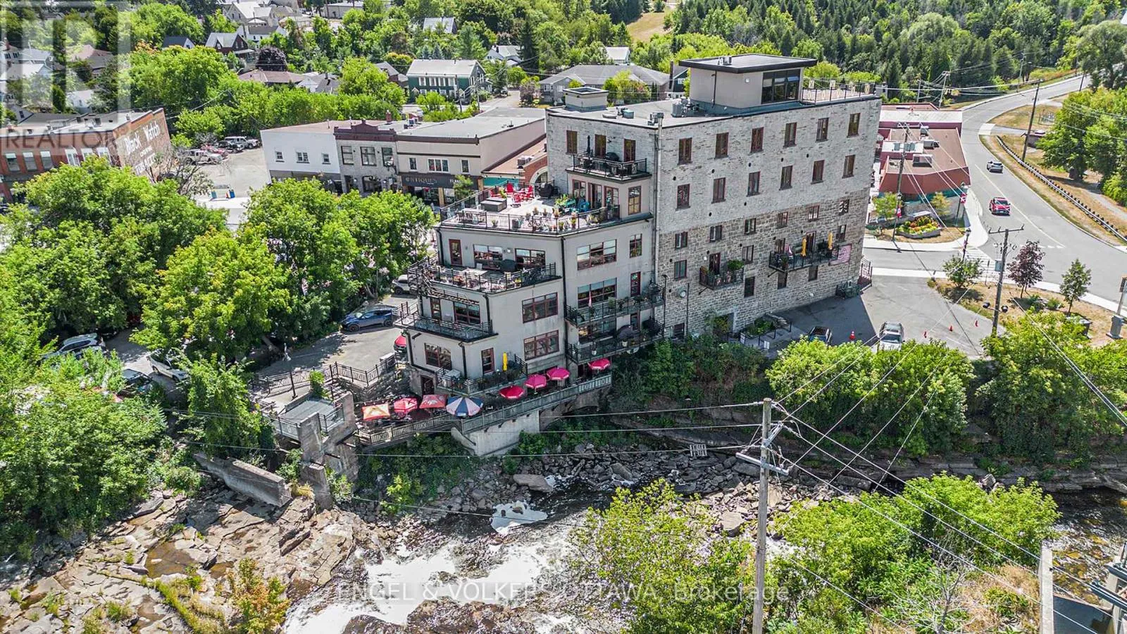 Cross Streets: Almonte St & Mill St. ** Directions: From Almonte St, turn onto Mill St. Welcome to this one-of-a-kind condo in the Victoria Woolen Mill in the heart of Almonte's historic district. With over $50K of improvements added in 2024-25, the unit's spacious foyer is filled with charm, featuring a stone accent wall, deep window ledges, and ceramic tile that flows seamlessly into elegant hardwood flooring carried throughout the home. Floor-to-ceiling windows and two large private balconies capture the home's most remarkable feature - a stunning and almost surreal view of the Mississippi Rivers Grand Falls. The showpiece kitchen is designed by Montreal luxury brand Miralis, and features quartz countertops, a striking island with a designer hood fan, a premium brand fridge and five-burner induction range, and sleek German hardware with pull-out storage solutions. The top-of-the-line Bosch dishwasher blends seamlessly into the custom cabinetry, while open shelving, a vibrant backsplash, and bright pot lighting combine style and functionality. The living and dining areas flow effortlessly together, with custom millwork offering both display shelving and abundant storage. High ceilings and recessed lighting enhance the open, airy ambiance. A thoughtfully designed pantry houses premium Electrolux laundry machines, additional cabinetry, a folding counter, and even a Fisher & Paykel dishwasher drawer. A full bathroom with shower and vanity, along with an adjoining storage room, completes this functional wing. The primary suite features double closets, unique architectural curves, and a beautifully renovated ensuite - complete with slate tile, heated floors, a rain shower, and a Canadian-made double vanity. The second bedroom, currently used as an office, offers privacy with a pocket door and flexible use as a guest space. With its rare combination of historic charm, modern luxury, and close proximity to award-winning businesses such as Hummingbird Chocolate Factory and Vodkow-Dairy Distillery, this residence is more than a home - it's a lifestyle. (id:27476)