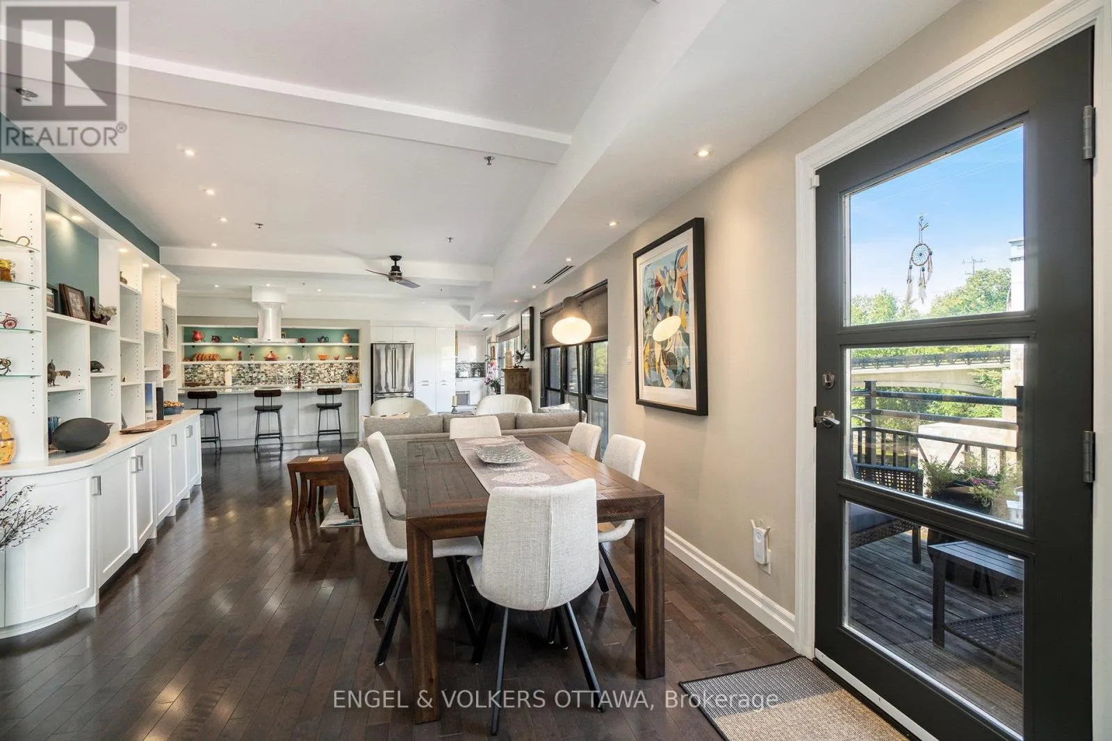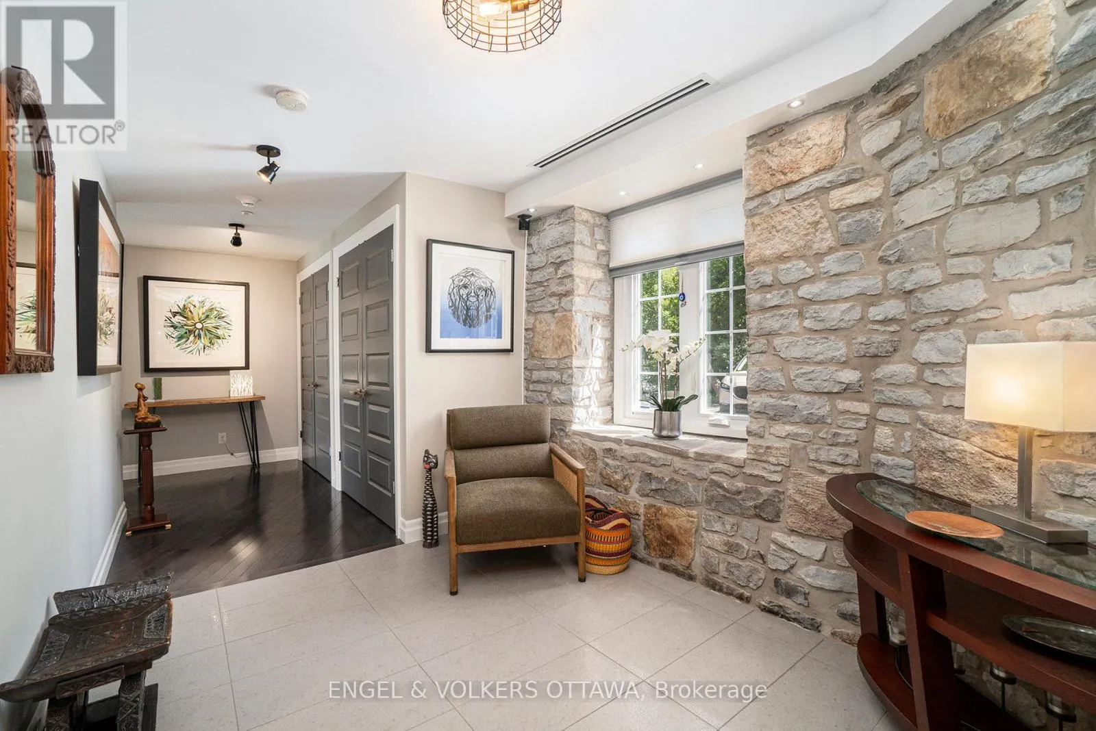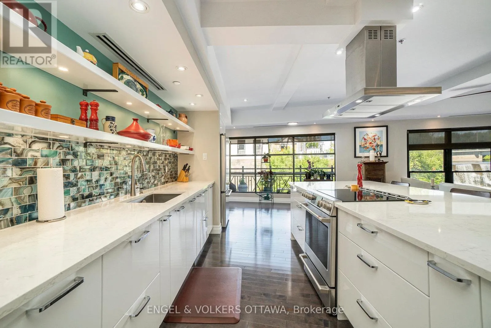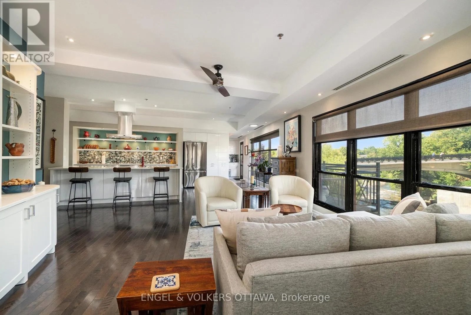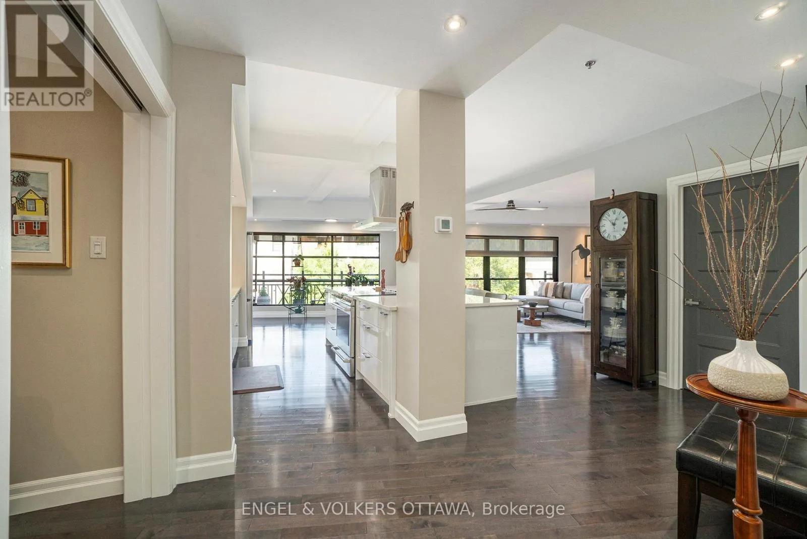 Cross Streets: Almonte St & Mill St. ** Directions: From Almonte St, turn onto Mill St. Welcome to this one-of-a-kind condo in the Victoria Woolen Mill in the heart of Almonte's historic district. With over $50K of improvements added in 2024-25, the unit's spacious foyer is filled with charm, featuring a stone accent wall, deep window ledges, and ceramic tile that flows seamlessly into elegant hardwood flooring carried throughout the home. Floor-to-ceiling windows and two large private balconies capture the home's most remarkable feature - a stunning and almost surreal view of the Mississippi Rivers Grand Falls. The showpiece kitchen is designed by Montreal luxury brand Miralis, and features quartz countertops, a striking island with a designer hood fan, a premium brand fridge and five-burner induction range, and sleek German hardware with pull-out storage solutions. The top-of-the-line Bosch dishwasher blends seamlessly into the custom cabinetry, while open shelving, a vibrant backsplash, and bright pot lighting combine style and functionality. The living and dining areas flow effortlessly together, with custom millwork offering both display shelving and abundant storage. High ceilings and recessed lighting enhance the open, airy ambiance. A thoughtfully designed pantry houses premium Electrolux laundry machines, additional cabinetry, a folding counter, and even a Fisher & Paykel dishwasher drawer. A full bathroom with shower and vanity, along with an adjoining storage room, completes this functional wing. The primary suite features double closets, unique architectural curves, and a beautifully renovated ensuite - complete with slate tile, heated floors, a rain shower, and a Canadian-made double vanity. The second bedroom, currently used as an office, offers privacy with a pocket door and flexible use as a guest space. With its rare combination of historic charm, modern luxury, and close proximity to award-winning businesses such as Hummingbird Chocolate Factory and Vodkow-Dairy Distillery, this residence is more than a home - it's a lifestyle. (id:27476)