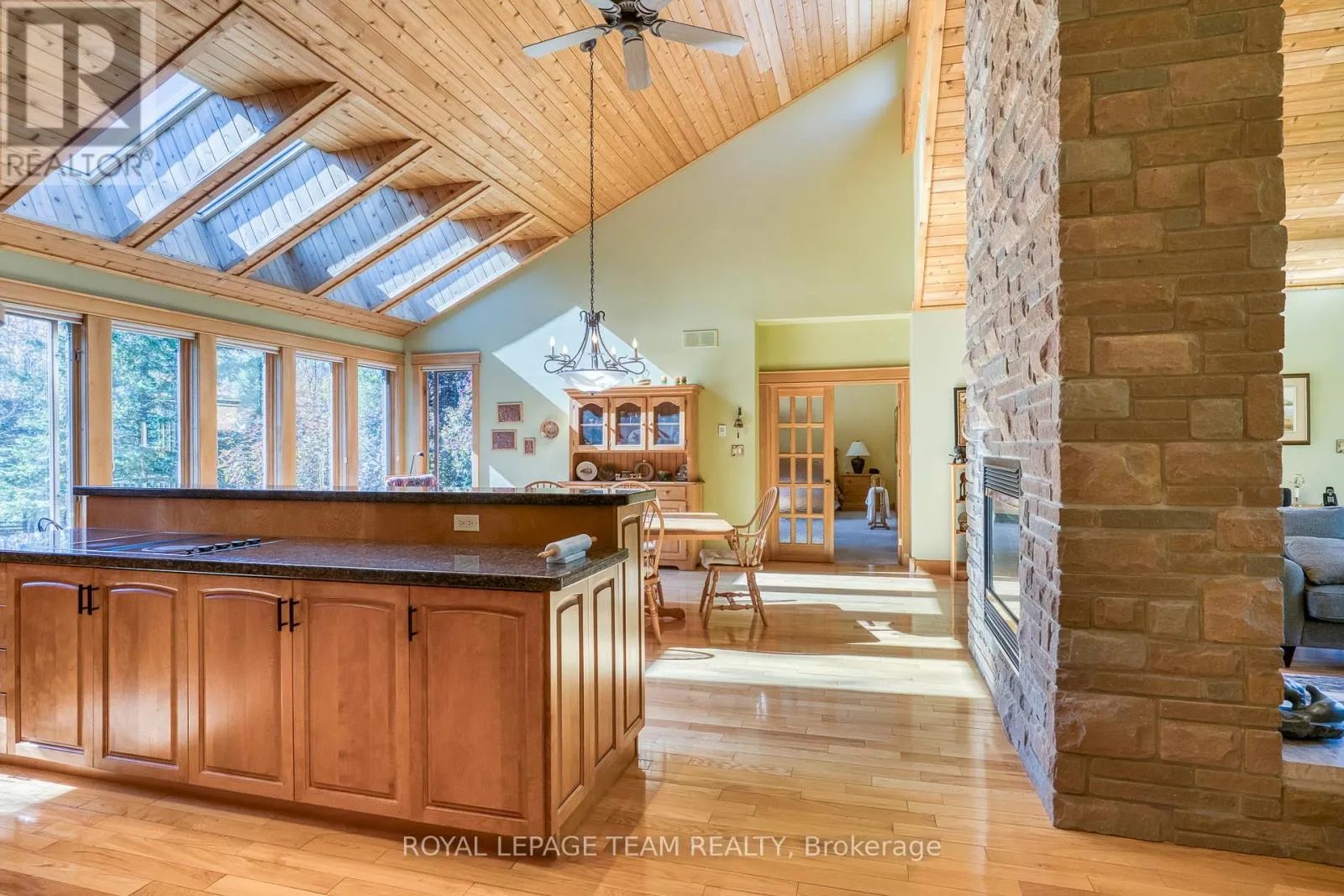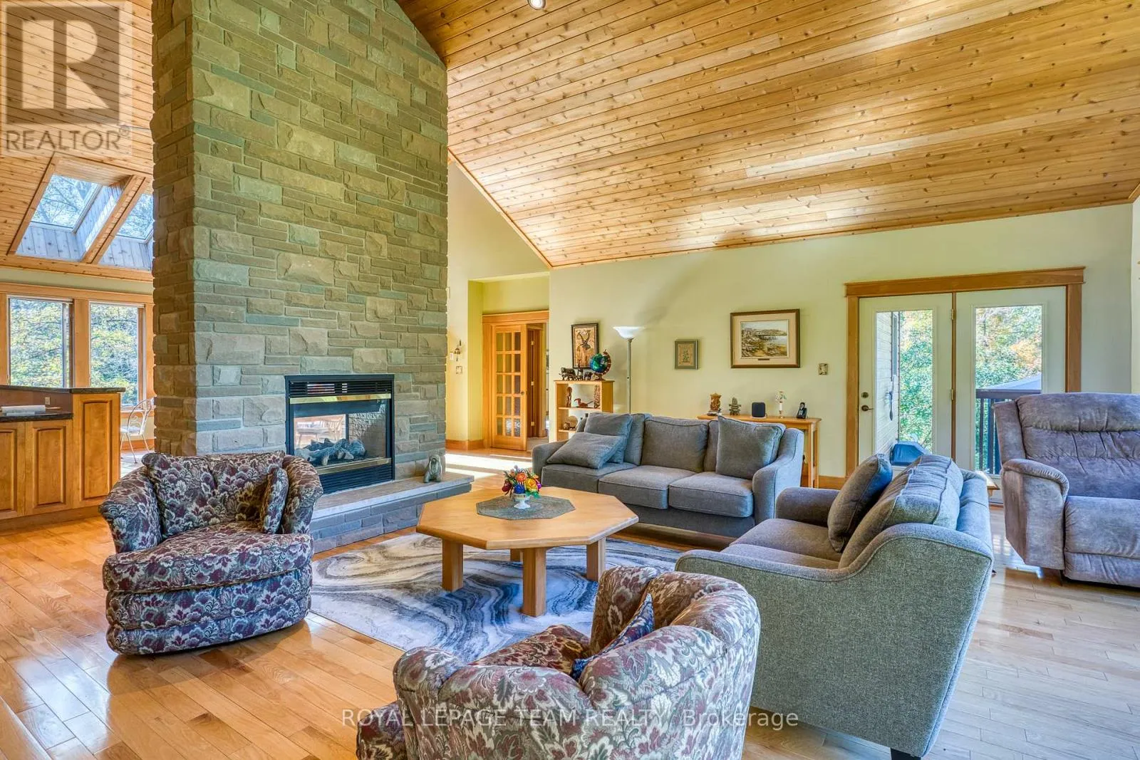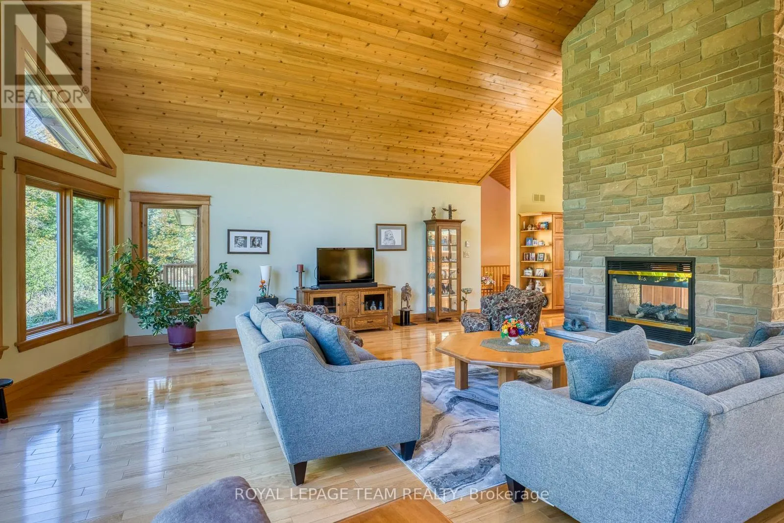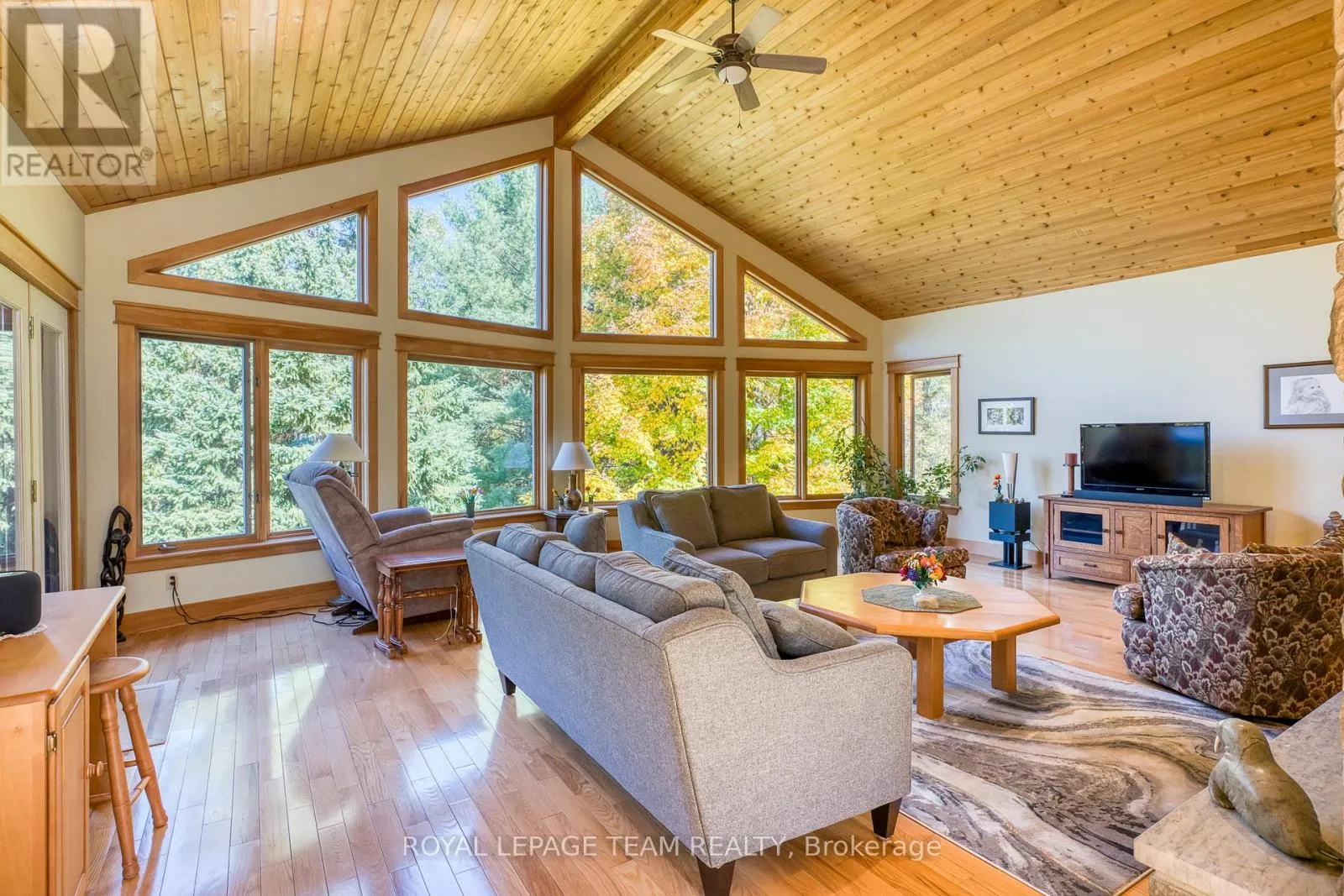 Cross Streets: Wolf Grove Rd and Con 3 A. ** Directions: Wolf grove Road, west of Almonte. Turn left onto Ramsay Con 3 A. S-T-R-E-T-C-H O-U-T Impressive custom built bungalow which shows pride of ownership!! Wide welcoming foyer to greet your guests. SPECTACLAR open concept kitchen, dining room and living room with soaring vaulted ceilings and a two sided gas fireplace!!, Huge windows allows the sunshine to pour in. There is direct access from the living room to a huge deck overlooking your peaceful, private back yard. A perfect place for your next family BBQ. Loads of room for the whole family with 3 + 2 bedrooms and 3 bathrooms. The primary bedroom is complete with two walk in closets + a 5 piece ensuite You are sure to appreciate the 4 season sunroom + the main floor laundry. Both bathrooms on the main floor have heated floors. You will be impressed with the lower level which features 9 ft ceilings, heated floors and huge sun filled windows. The family room with a cozy wood stove is the ideal place to enjoy family gatherings. You will also find a full 4 piece bathroom, workshop and utility room + loads of storage space. The two car garage has inside access to the main level and direct access to the workshop in the lower level. A perfect place to work on your crafts and hobbies. The detached 24ft x 40ft garage provides 2 more parking spaces + room for tools and equipment. The Generac will give you peace of mind no matter what kind of weather you experience. The 80 acres offers you plenty of "room to roam" with miles of trails. Ideal for hiking, walking, cross cross country skiing, snowshoeing+++. Year round enjoyment. Peaceful setting with easy access. Check out the drone video (id:27476)